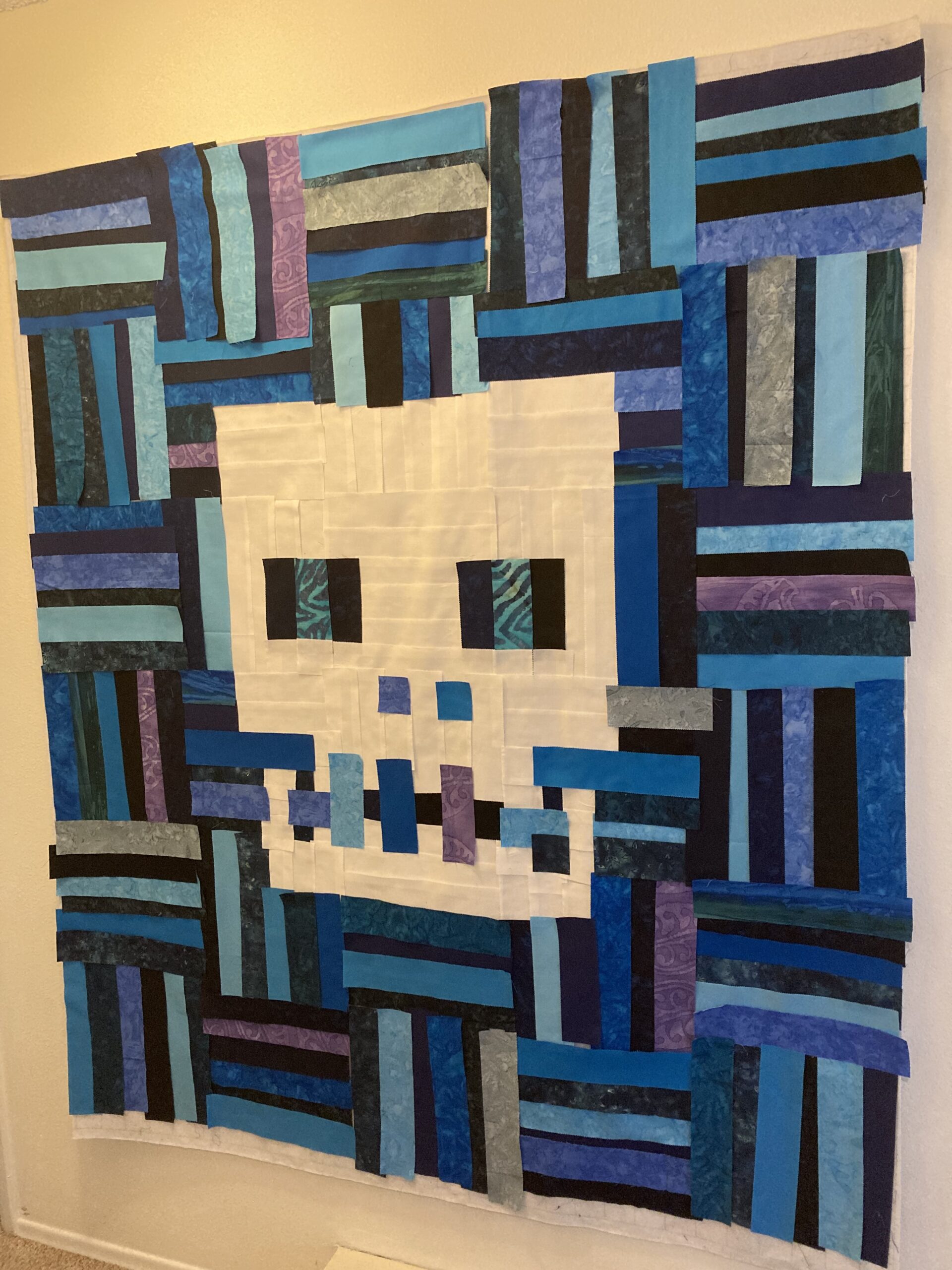 Thru the worst of it with enough strips left to fussy cut the final basket weave behind the skull