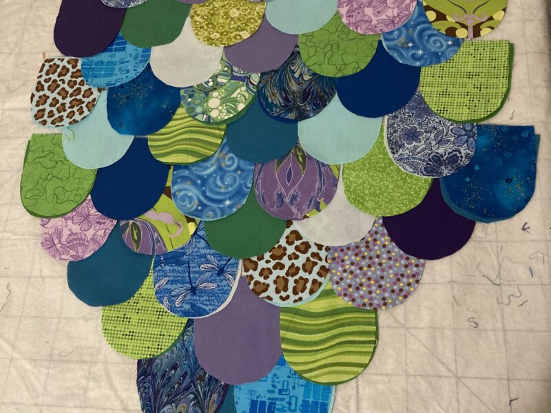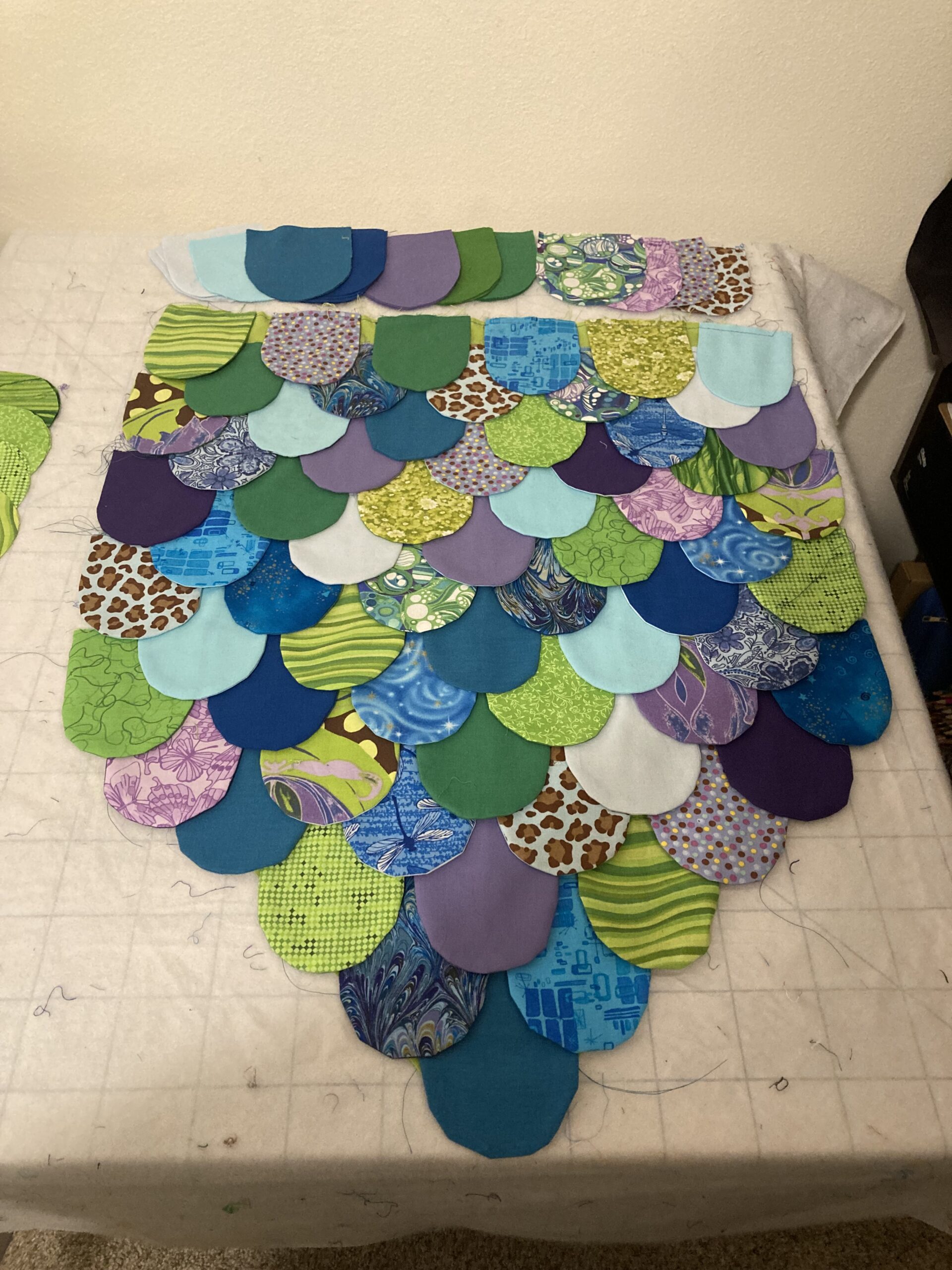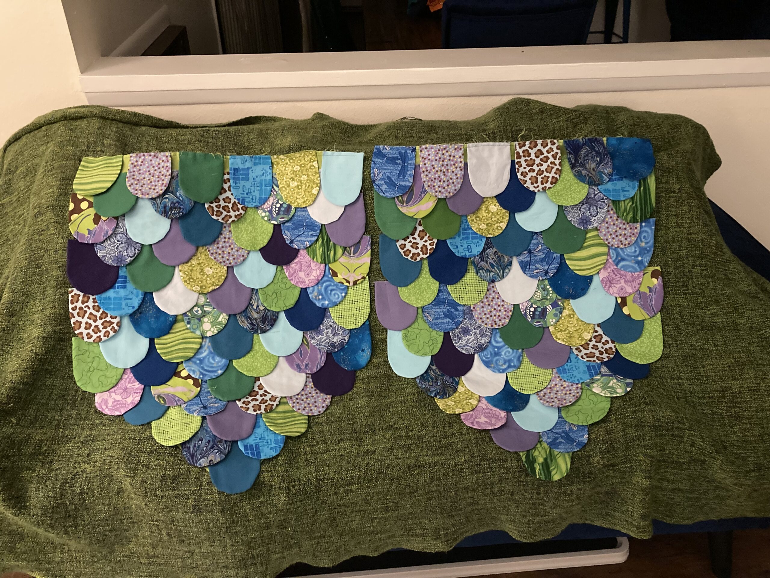 A little stitch-witchery to baste the scales down for quilting; front and back of the tail fin assembled. Hopefully