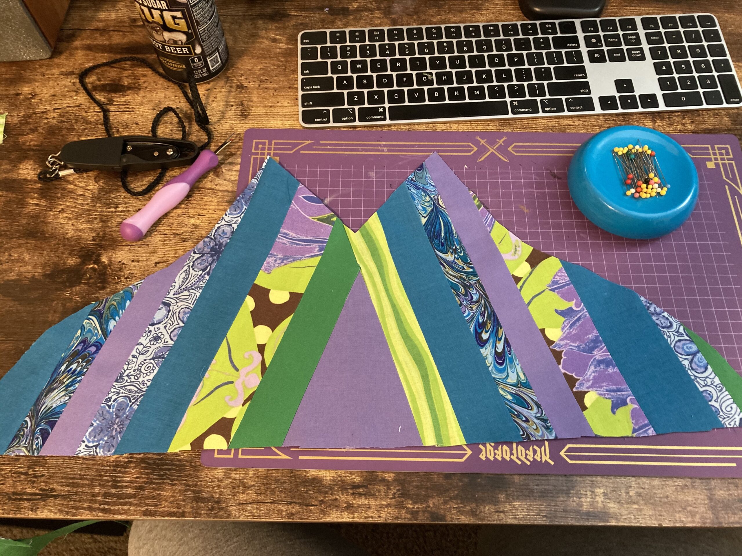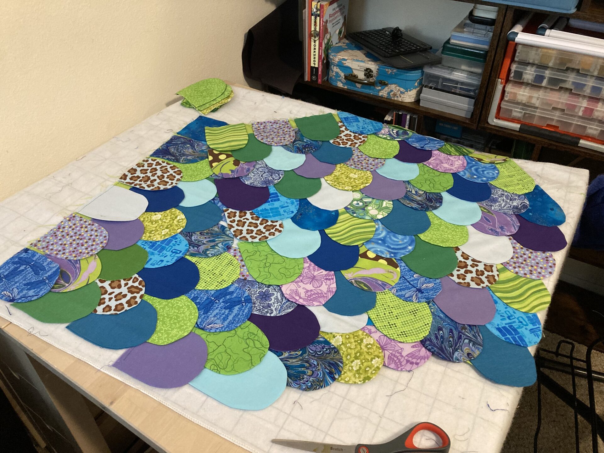 A little stitch-witchery to baste the scales down for quilting; front and back of the tail fin assembled. Hopefully I have enough batting to keep things rolling.