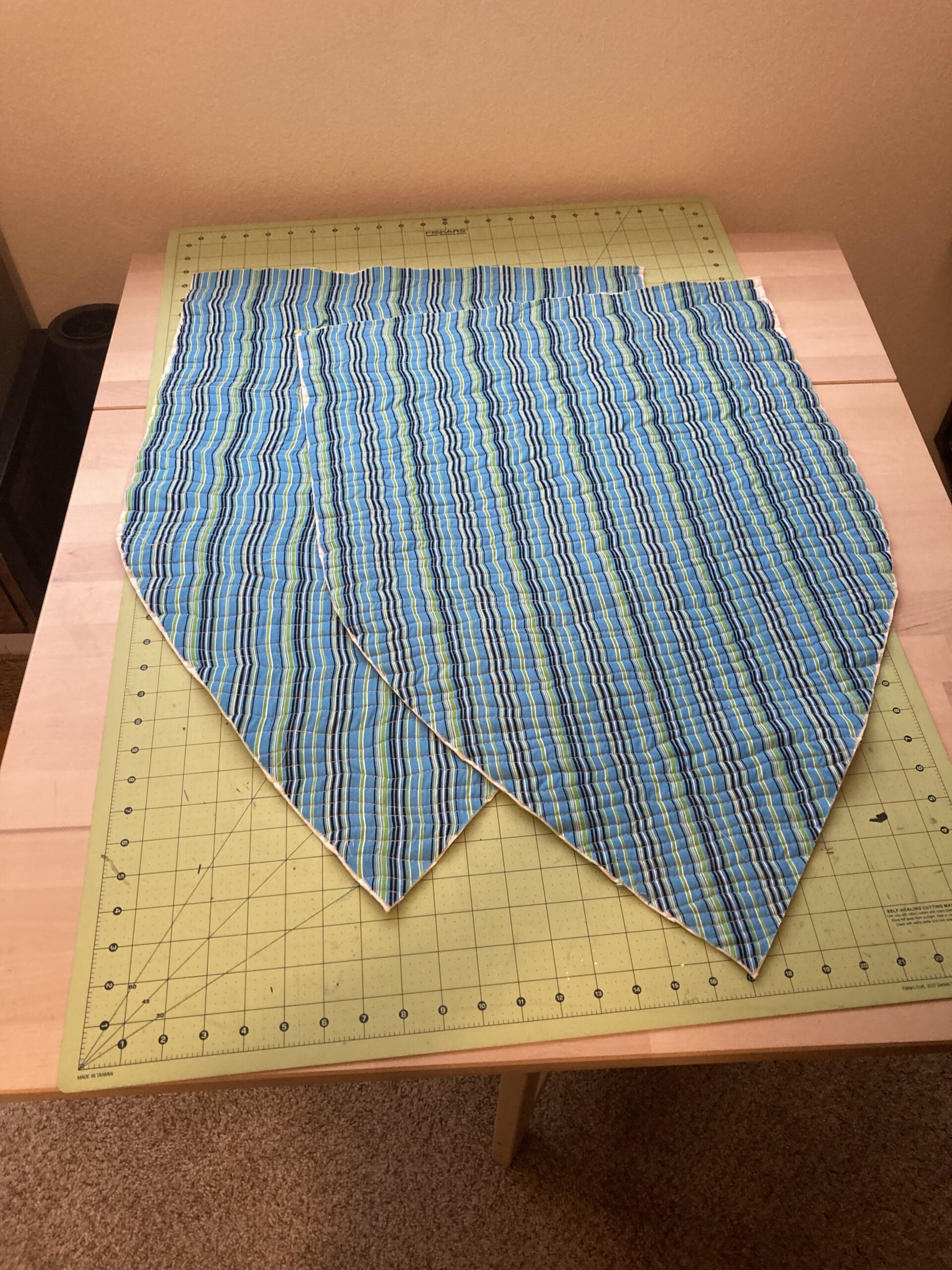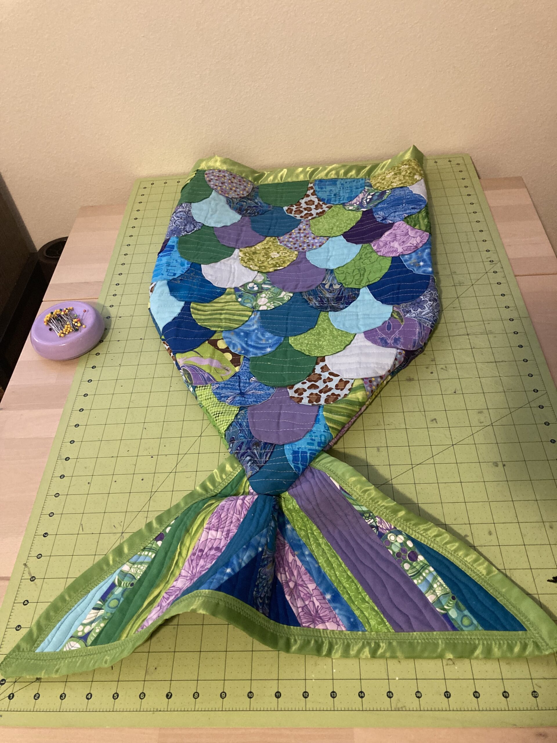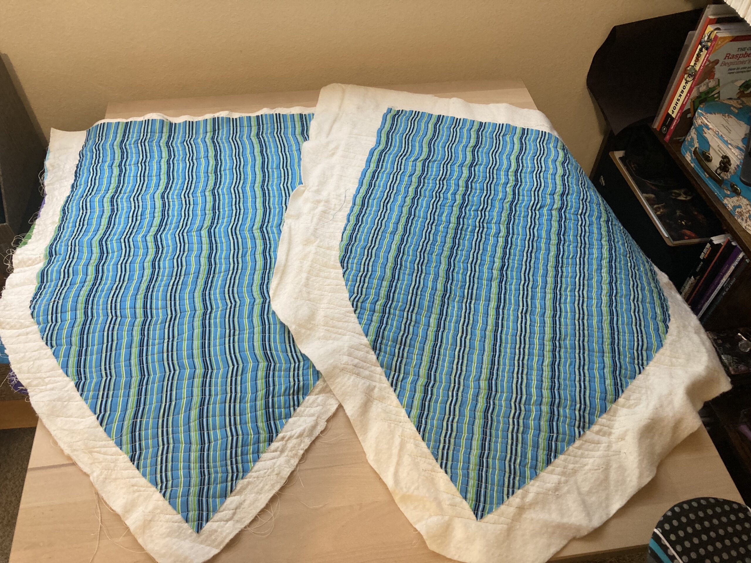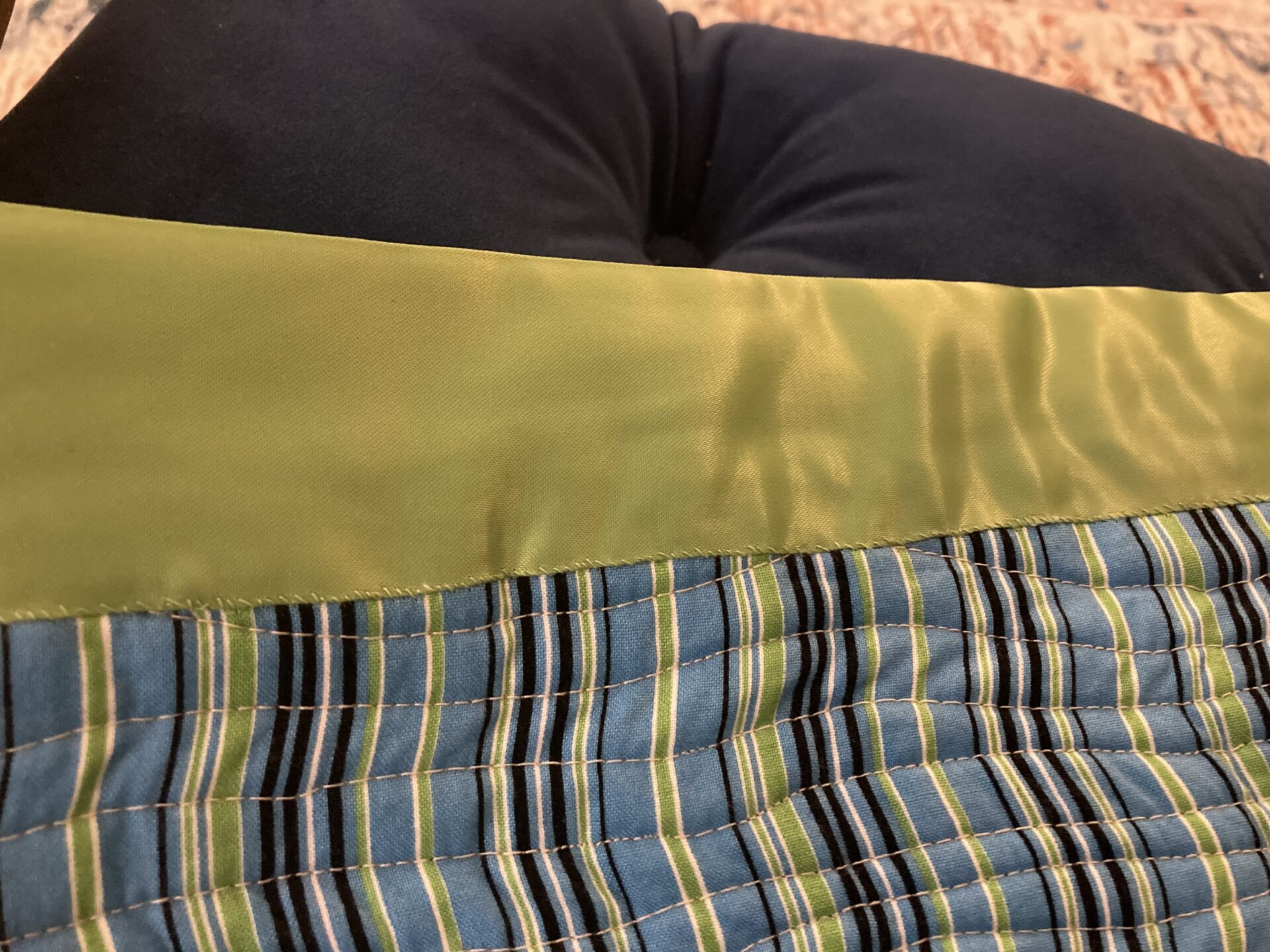 I should have put more (any) thought into the tail, but I find the gather rather endearing. Less so the three or four raw edges I missed by not squaring up the top before I hand stitched the blanket binding. Sealed them with zig-zag stitching that blends well – could be worse.