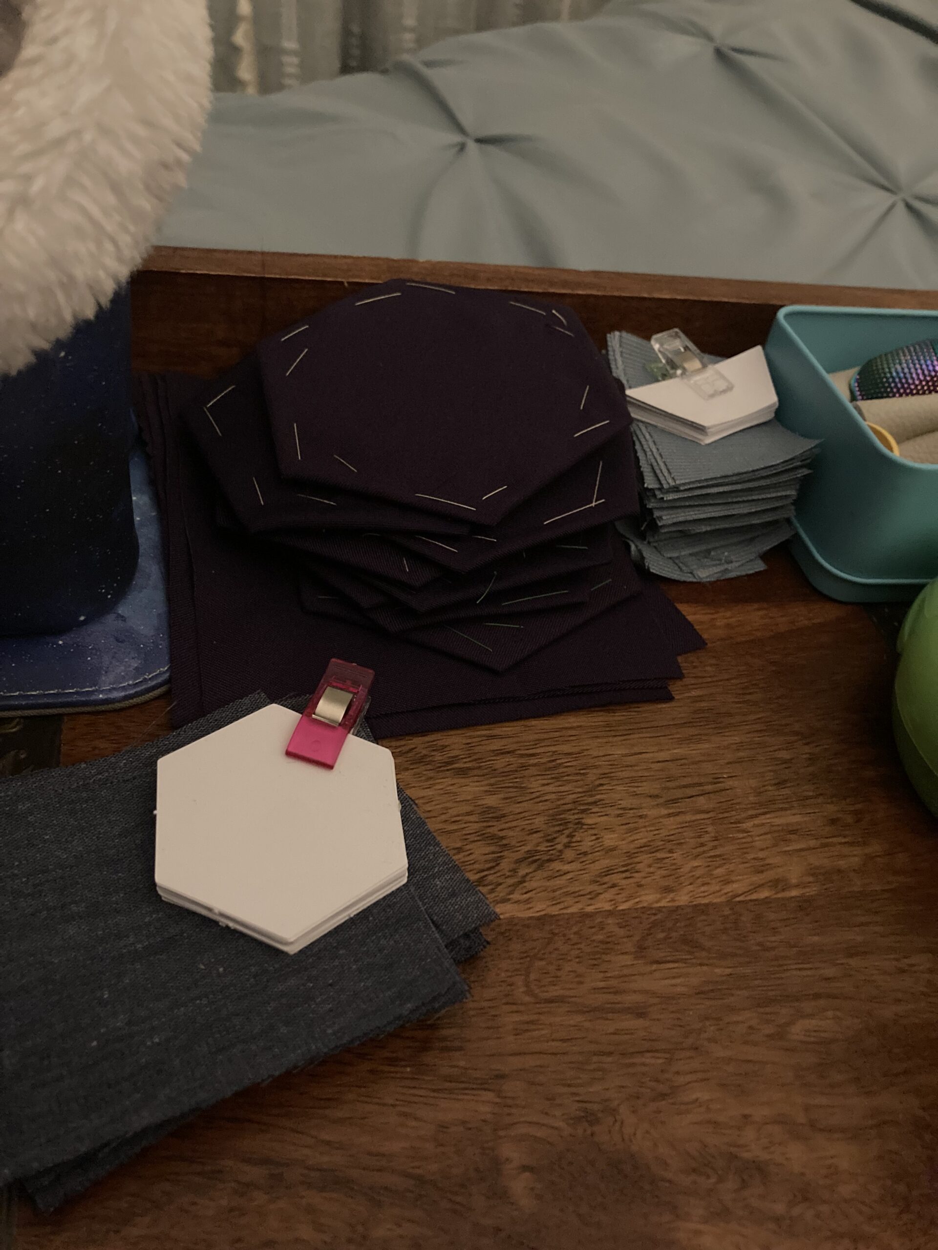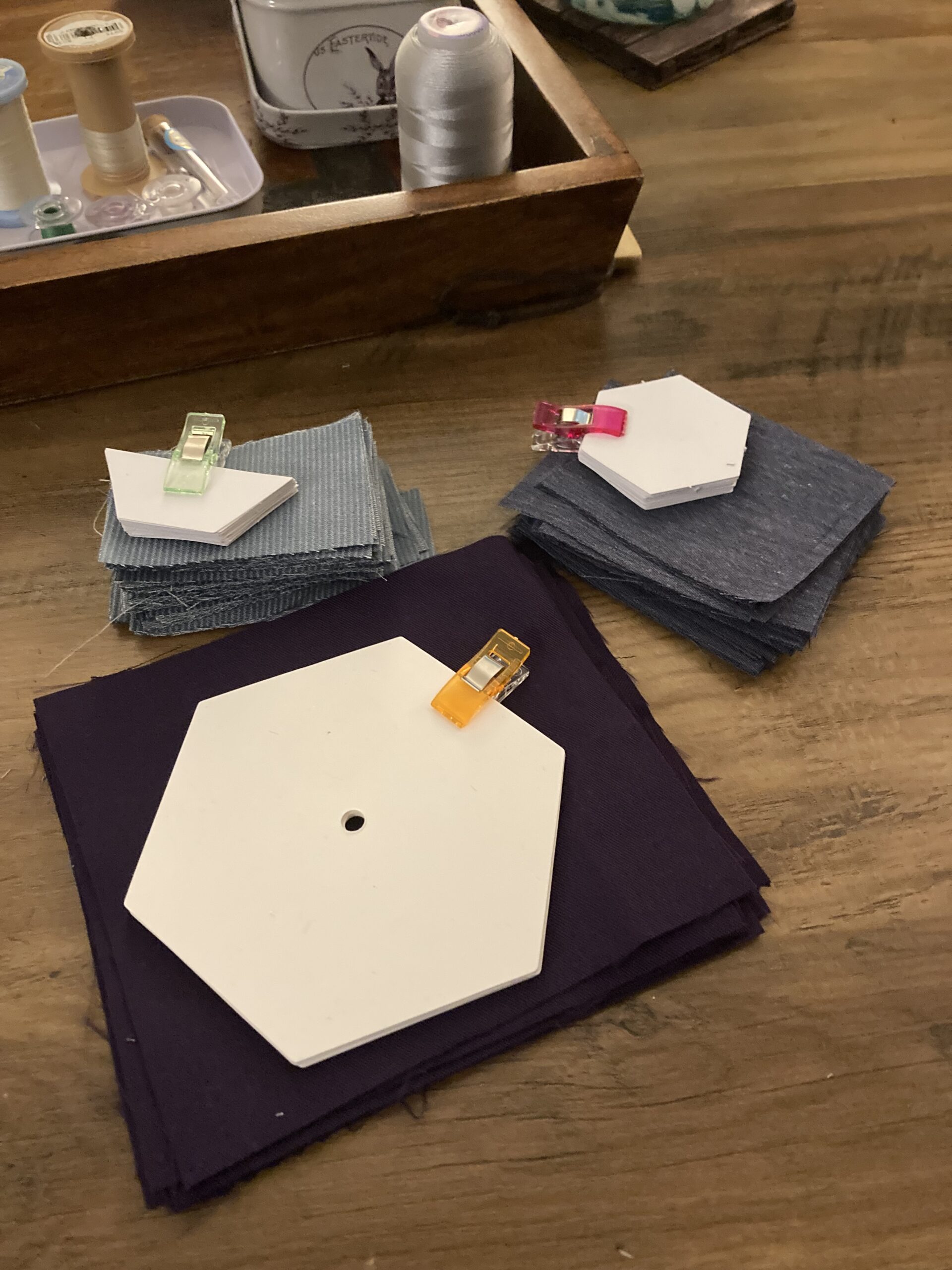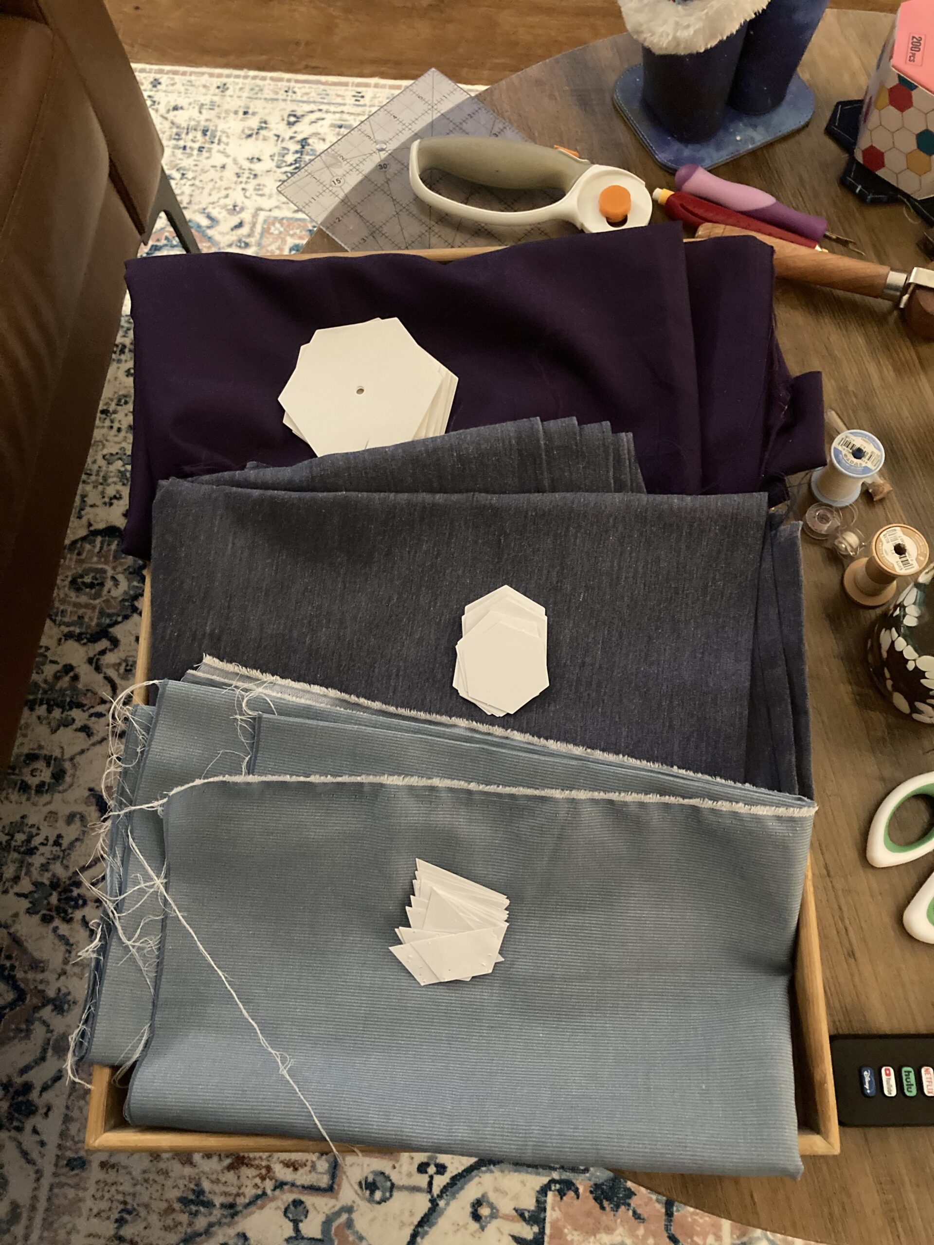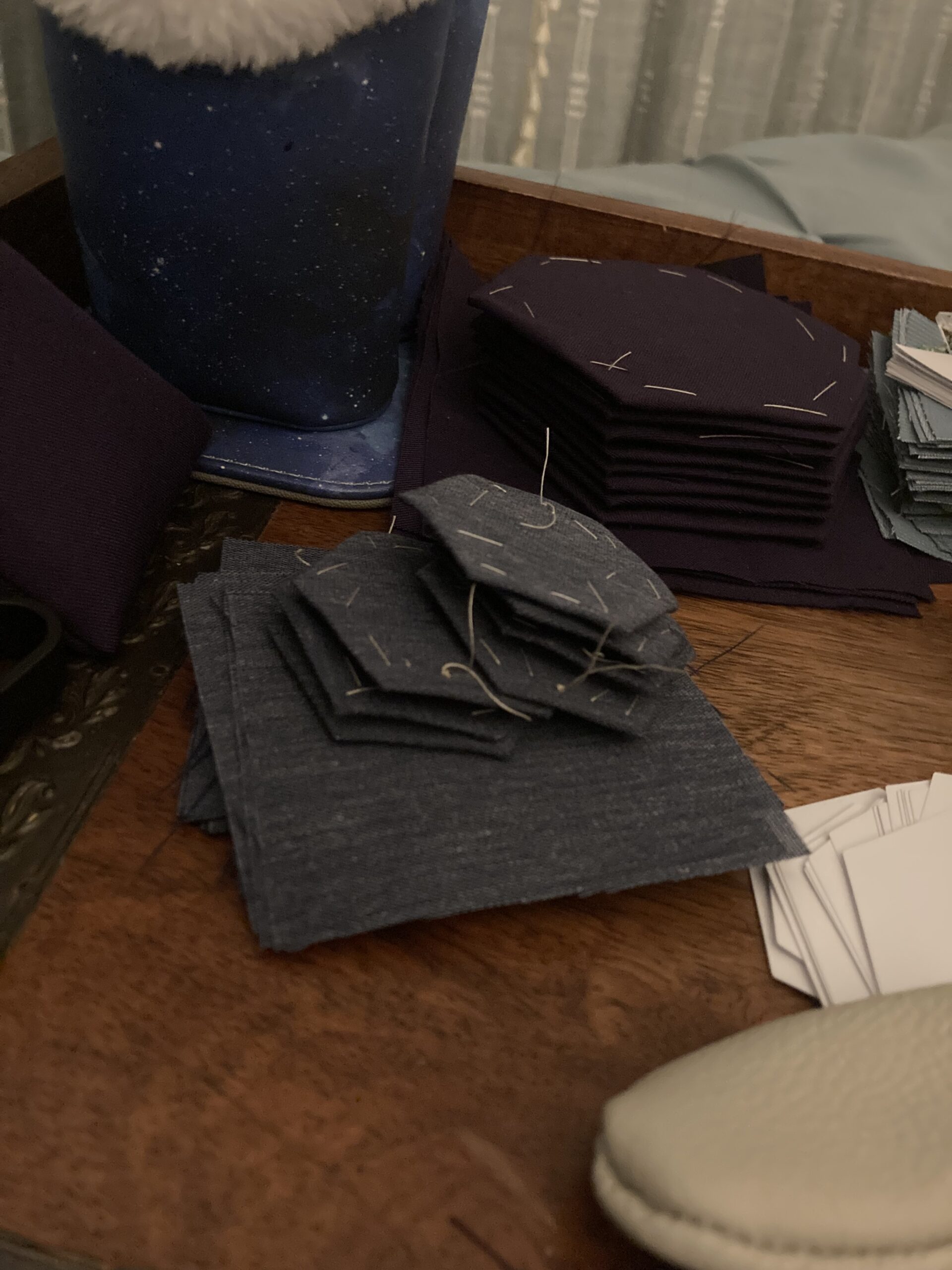 This is my first EPP project, so rather than break my brain immediately, I’ve stuck with two sizes of hexagons and half hexies of the smaller size to marry them. I’ve also paired each fabric with a specific shape to focus on the tessellation.