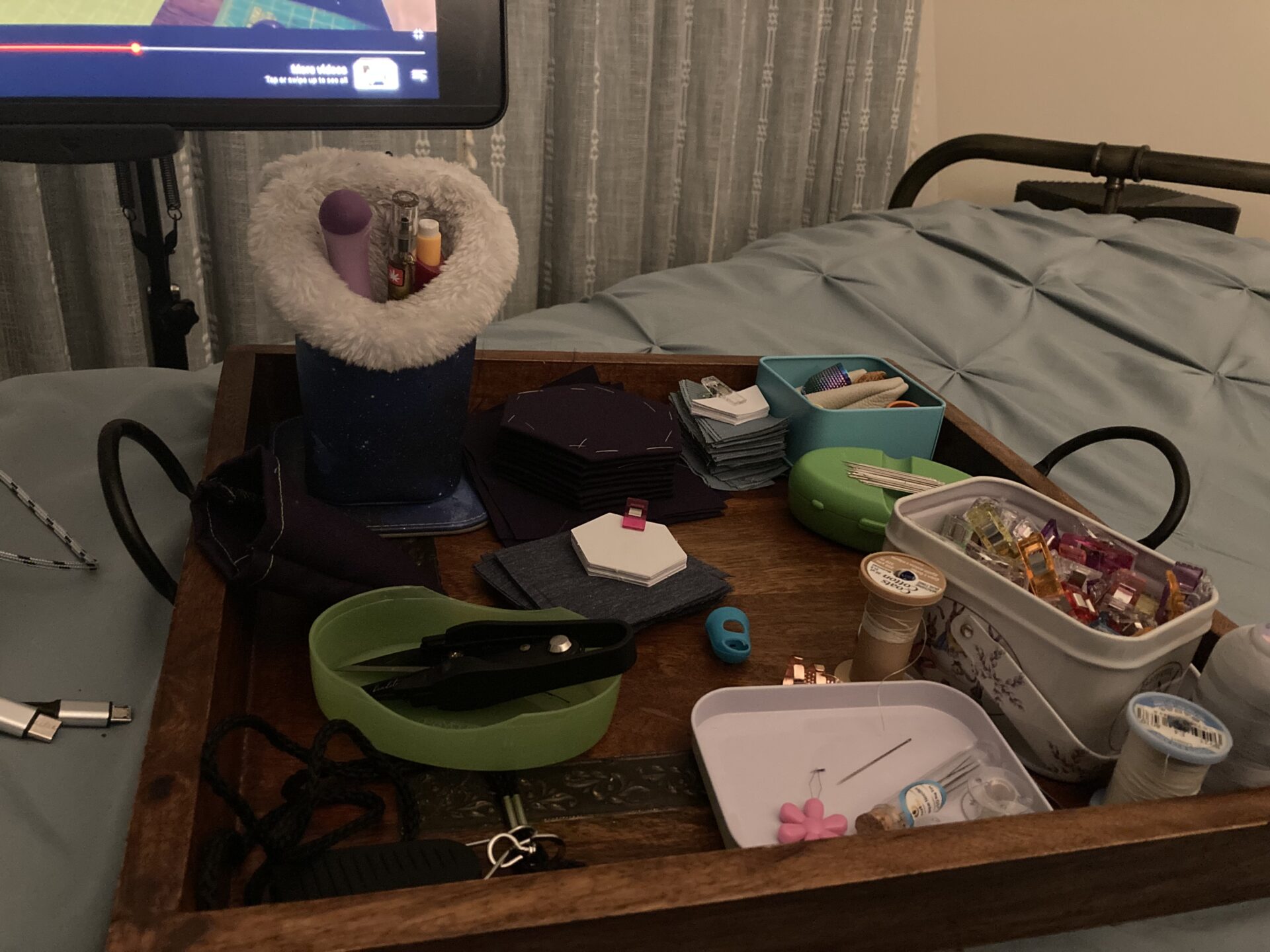 After years of throwing myself into other crafts, my sewjo has finally decided to ascend once more. Don’t it figure. I’m suddenly inspired to pick up abandoned digital projects, like my castle, and reimagine them as art quilts. I want to hand sew allllll the hexies. But mostly, I want an organizer for my hand sewing, so I don’t have to lug the wooden tray around. I’d also like to know when I decided hand sewing was a thing.