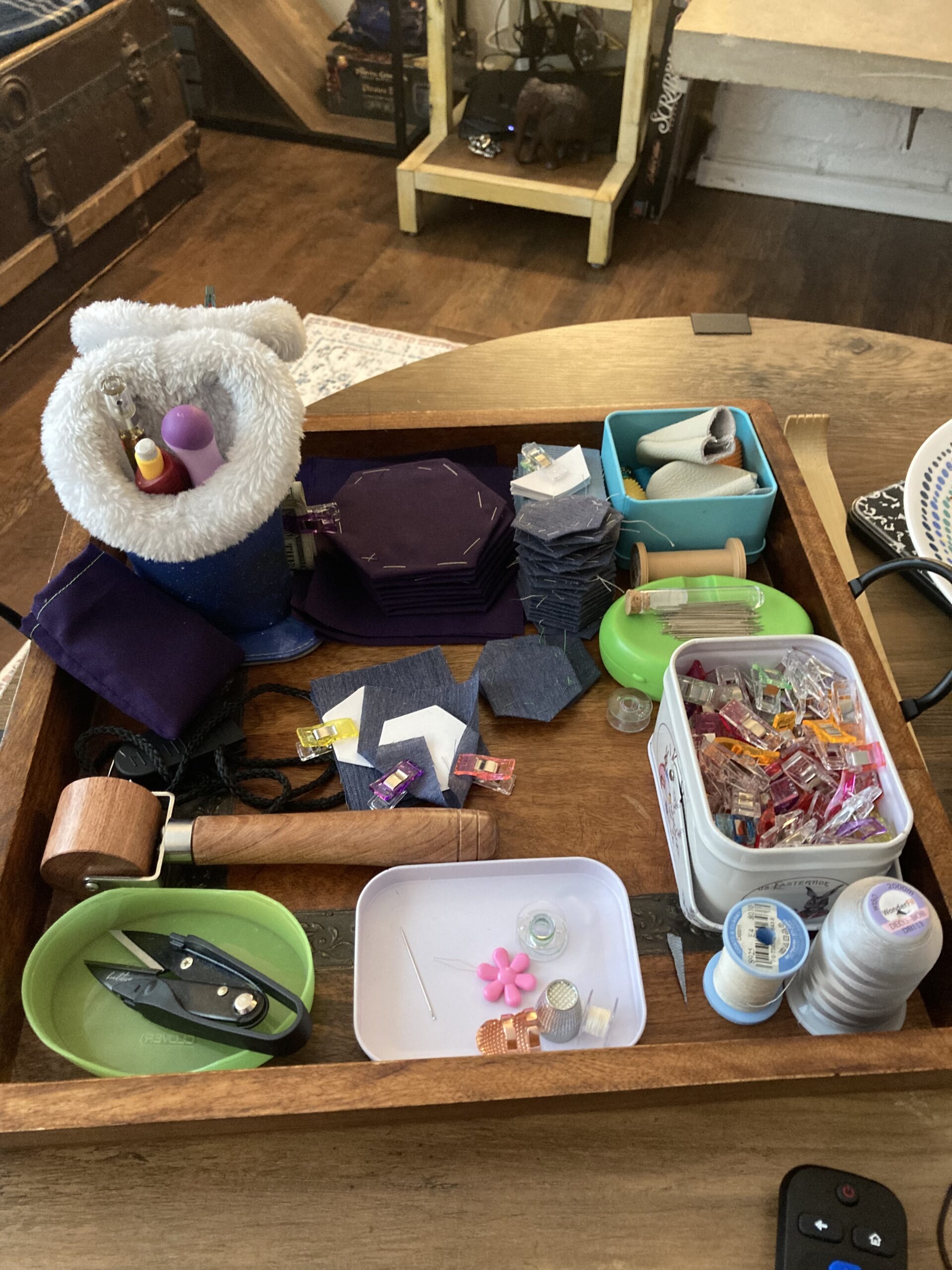 As lovely as hexies are, they are not quick. Now that I’ve mostly worked out what I need to have at hand for EPP, I did some online pattern searching for a better way to transport it all. I settled on this one.