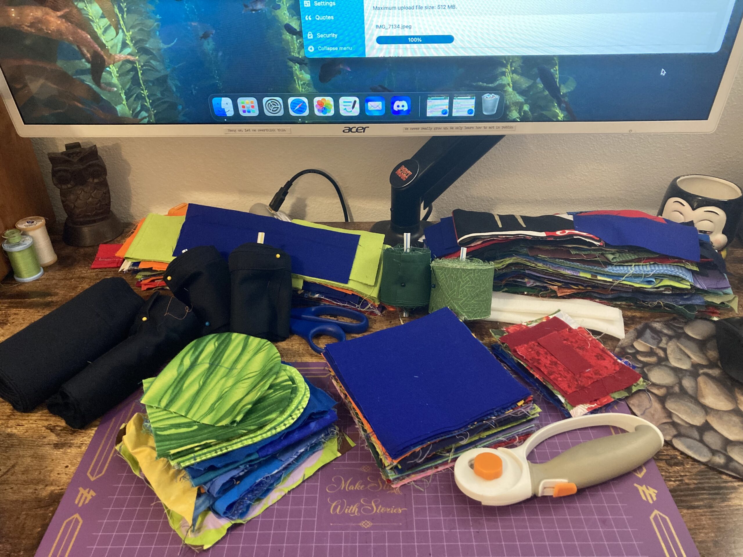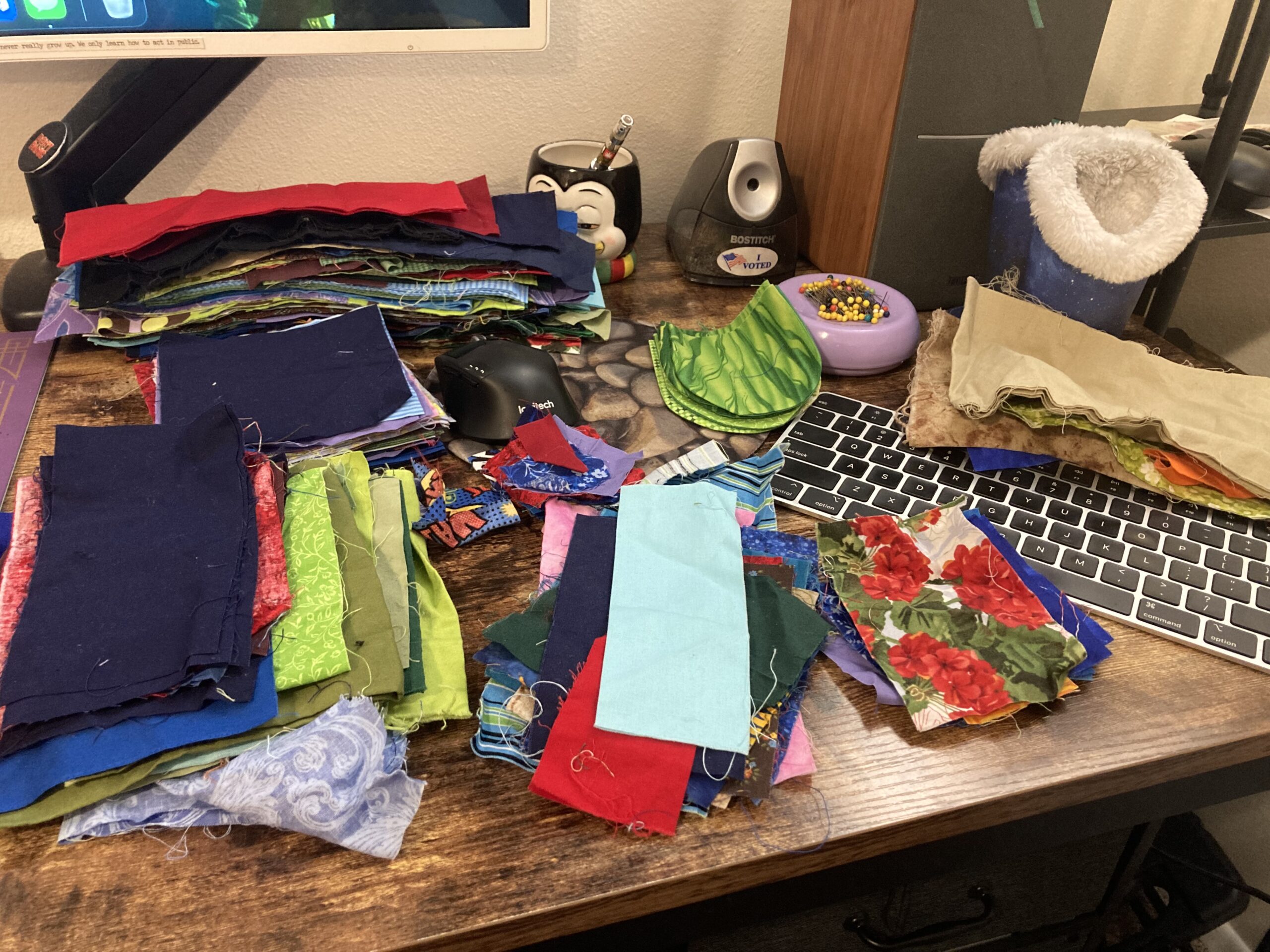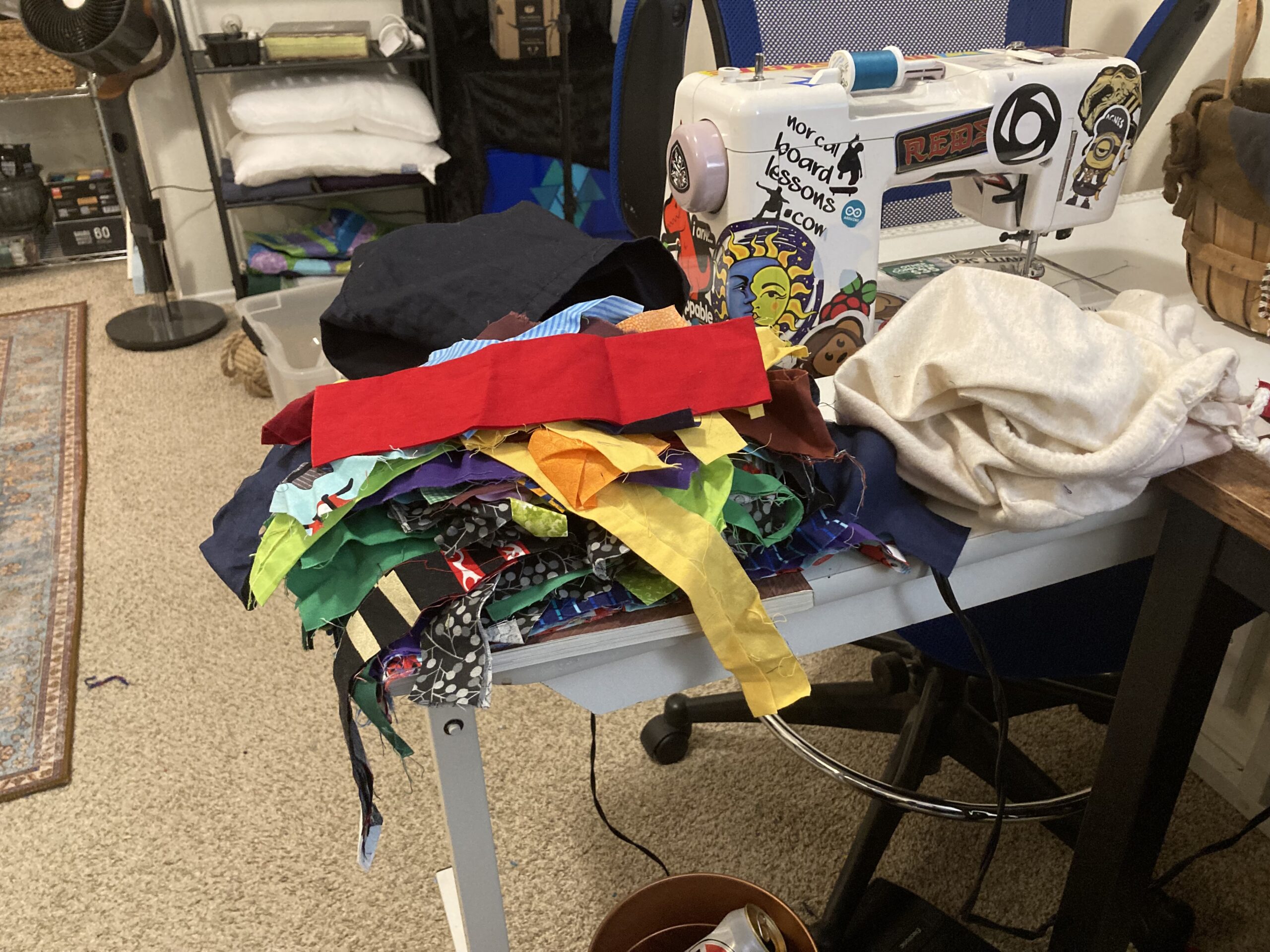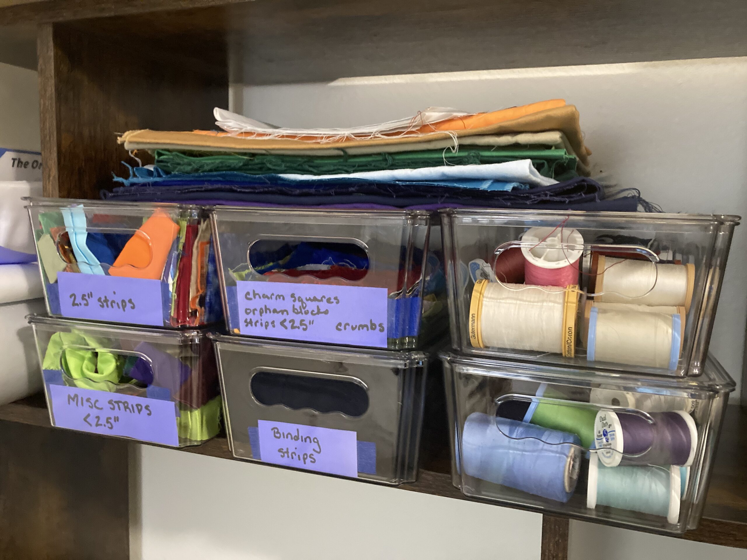 As the ghosts of projects past (so. many. bibs.), scraps got processed into 2.5″ strips, charm squares, miscellaneous strips under 2.5″, and a few crumbs with sentimental value. There are a few orphan blocks / scales and the potential bindings are wrapped around straws. Once Amazon delivers my plastic tubs, I can sort the last of it away.