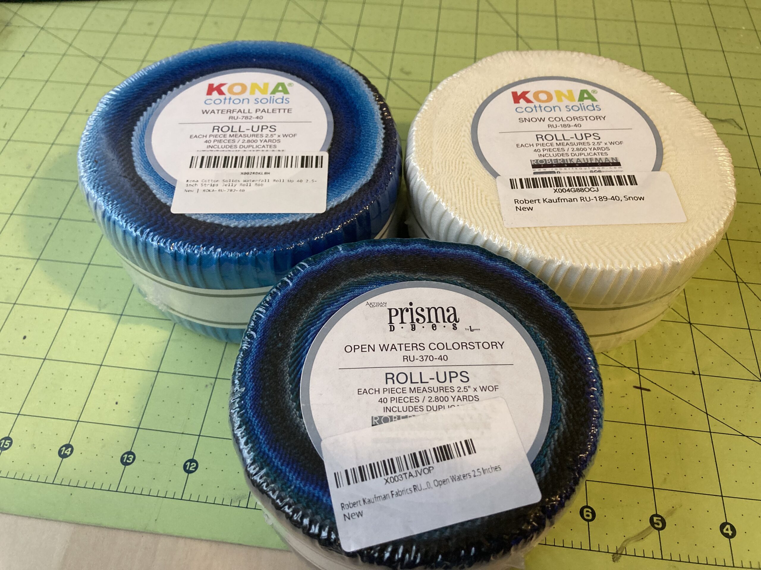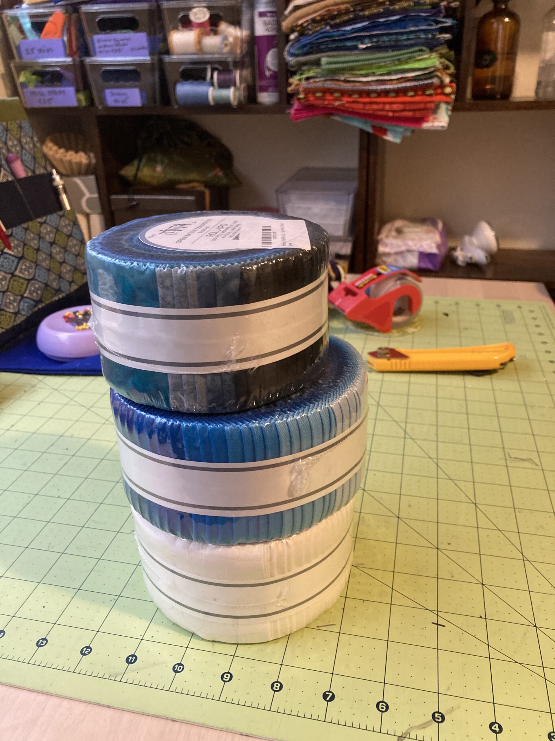 And a new project chosen – back to basics as I re-enter the fray. Basketcase using blue batiks and solids with Kona white. Given that cutting is my least favorite part, jellyrolls are bomb. I am concerned about the size difference, as they’re supposed to contain the same number of strips – hopefully the Prisma strips aren’t super thin. Or short.