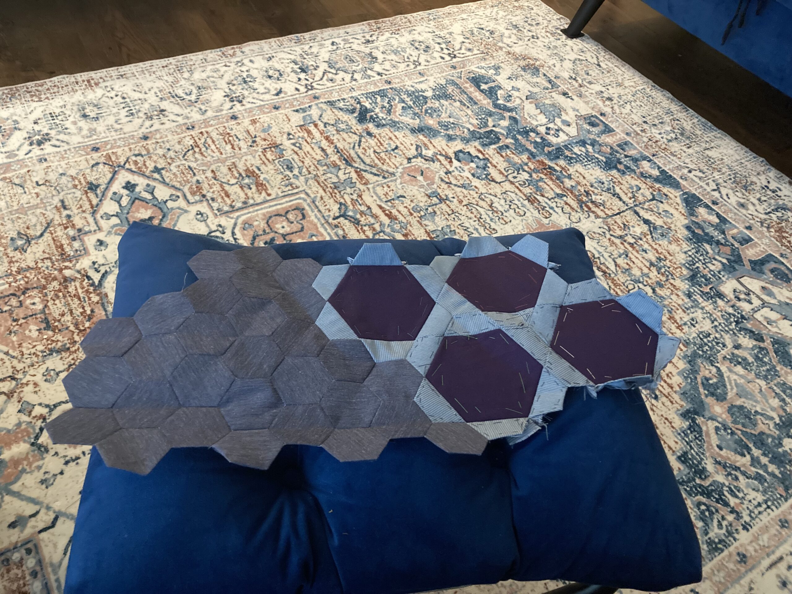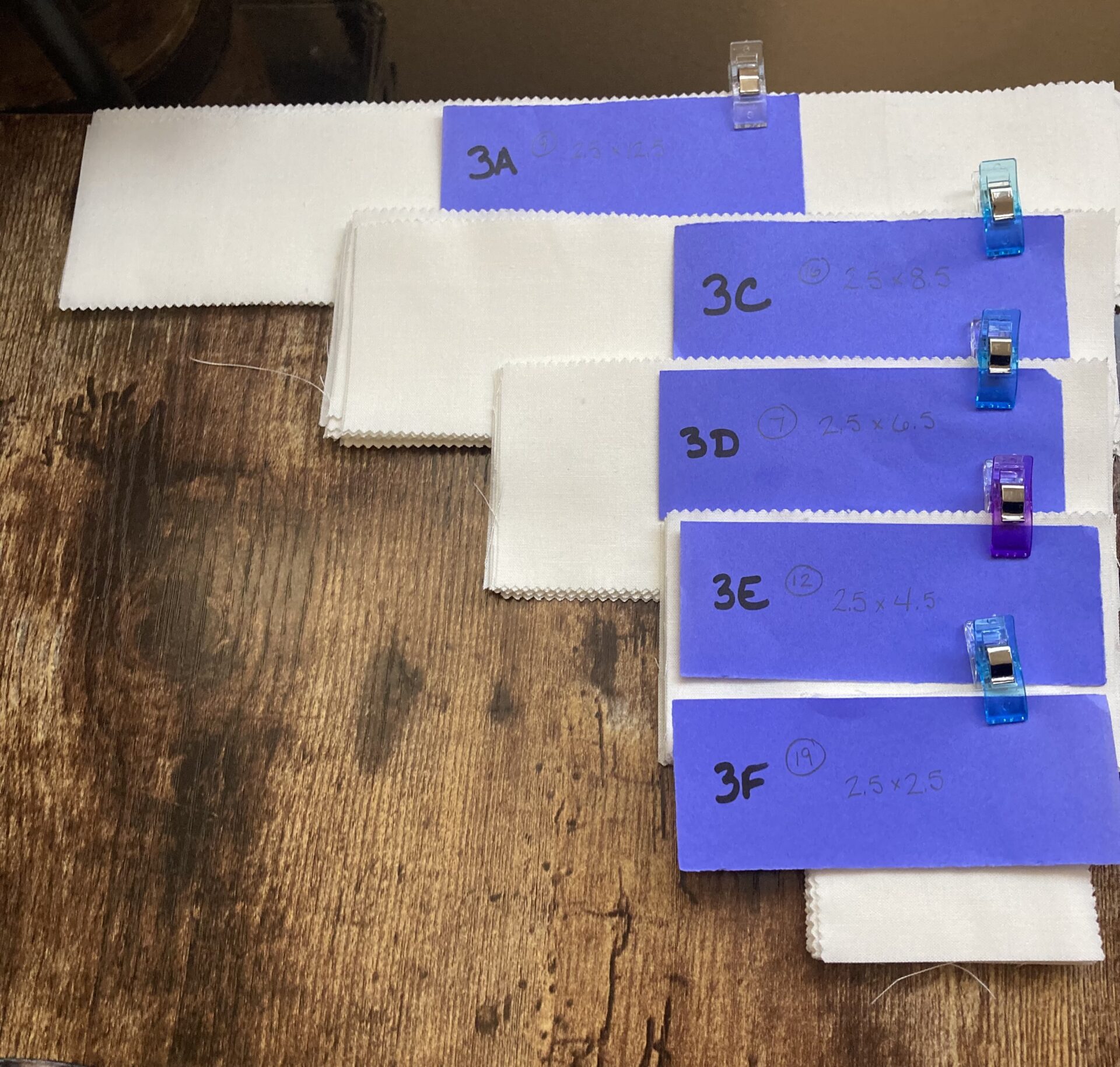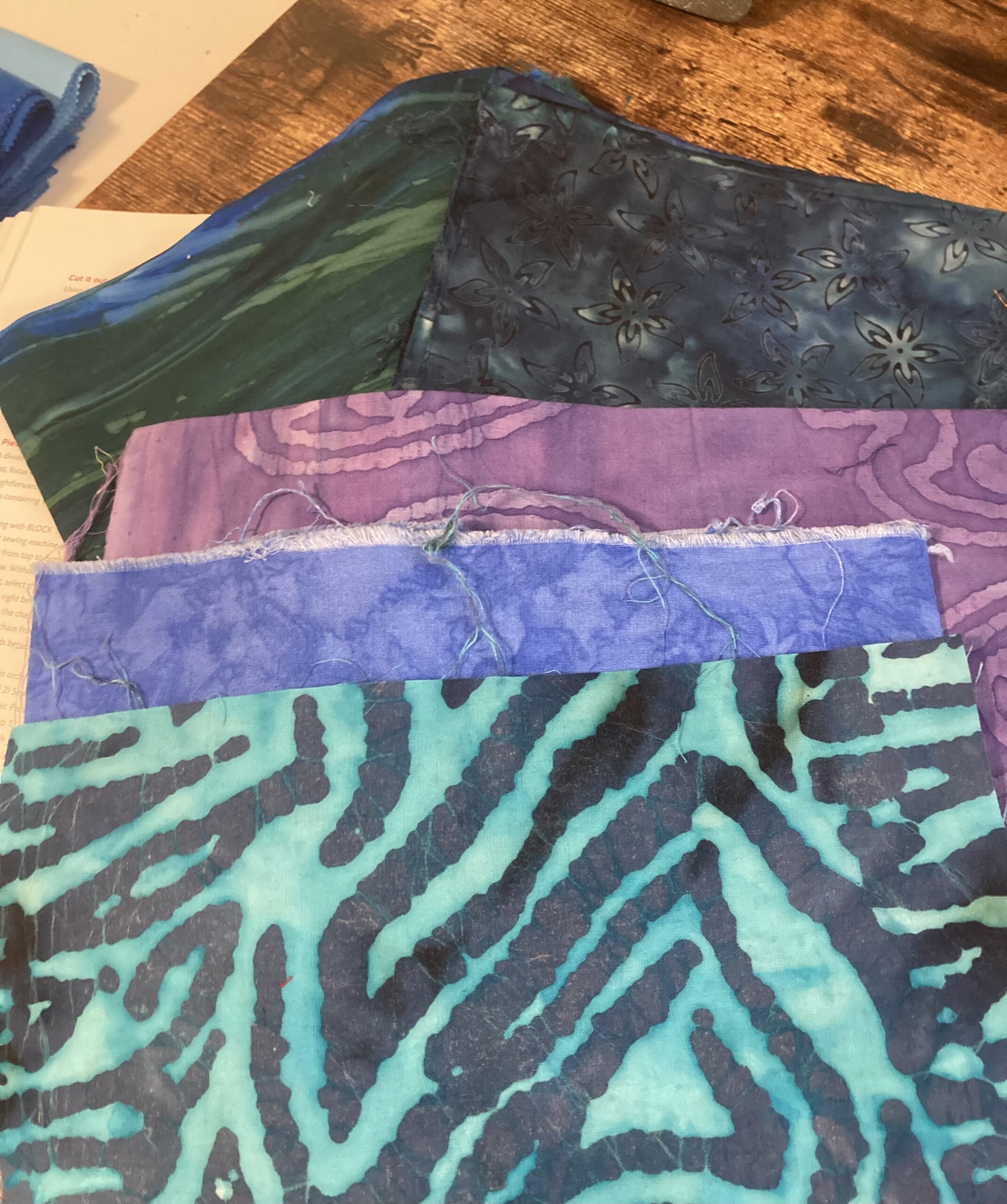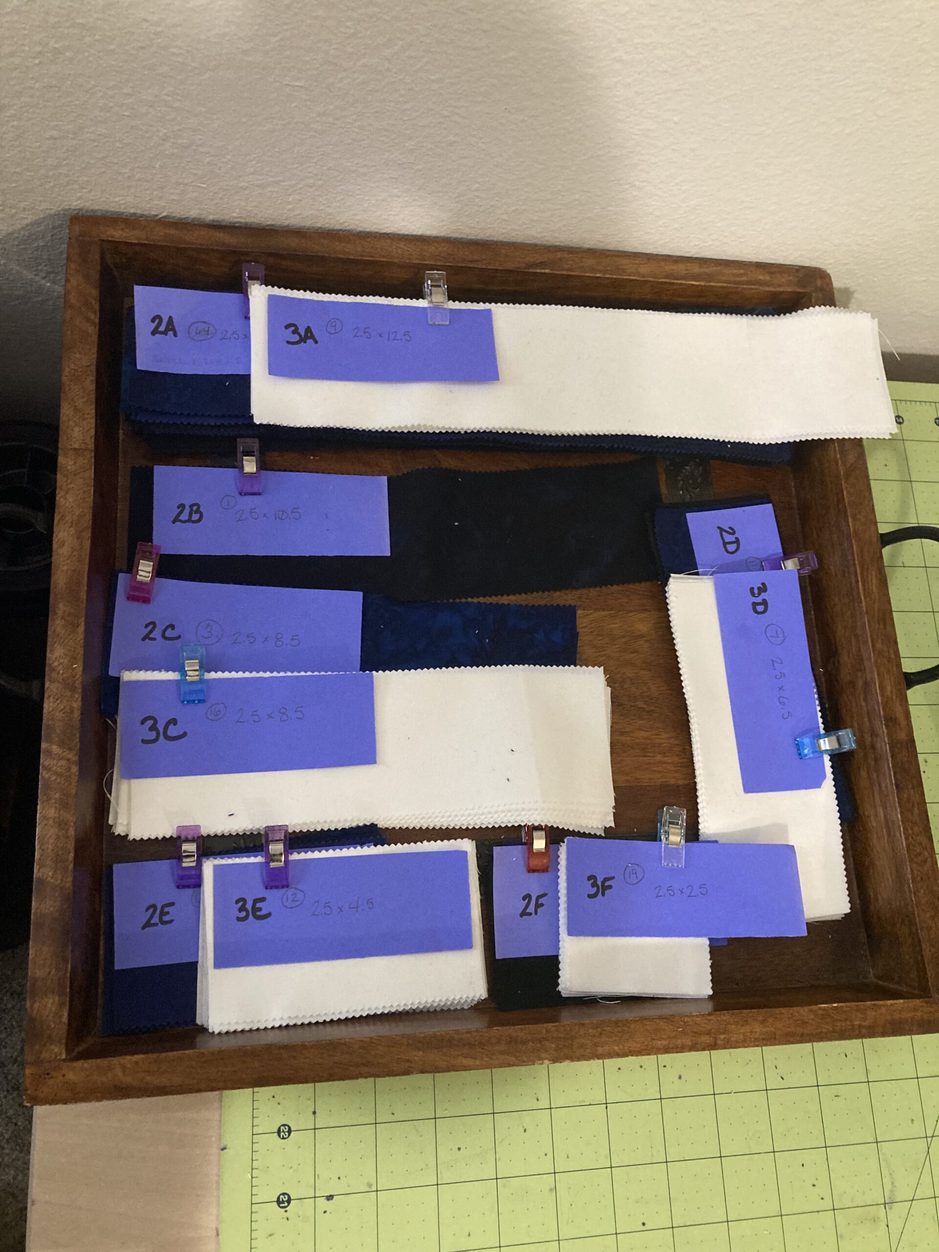 Basketcase is sized for a twin. Considering expanding to queen, but an additional row and column would double the fabric count for the blues. With the midtones sorted out to emphasize the basketweave contrast there are 25 light blue and 22 dark blue. Pulled some larger scale patterns but the stash is low on batiks. I should work on that.