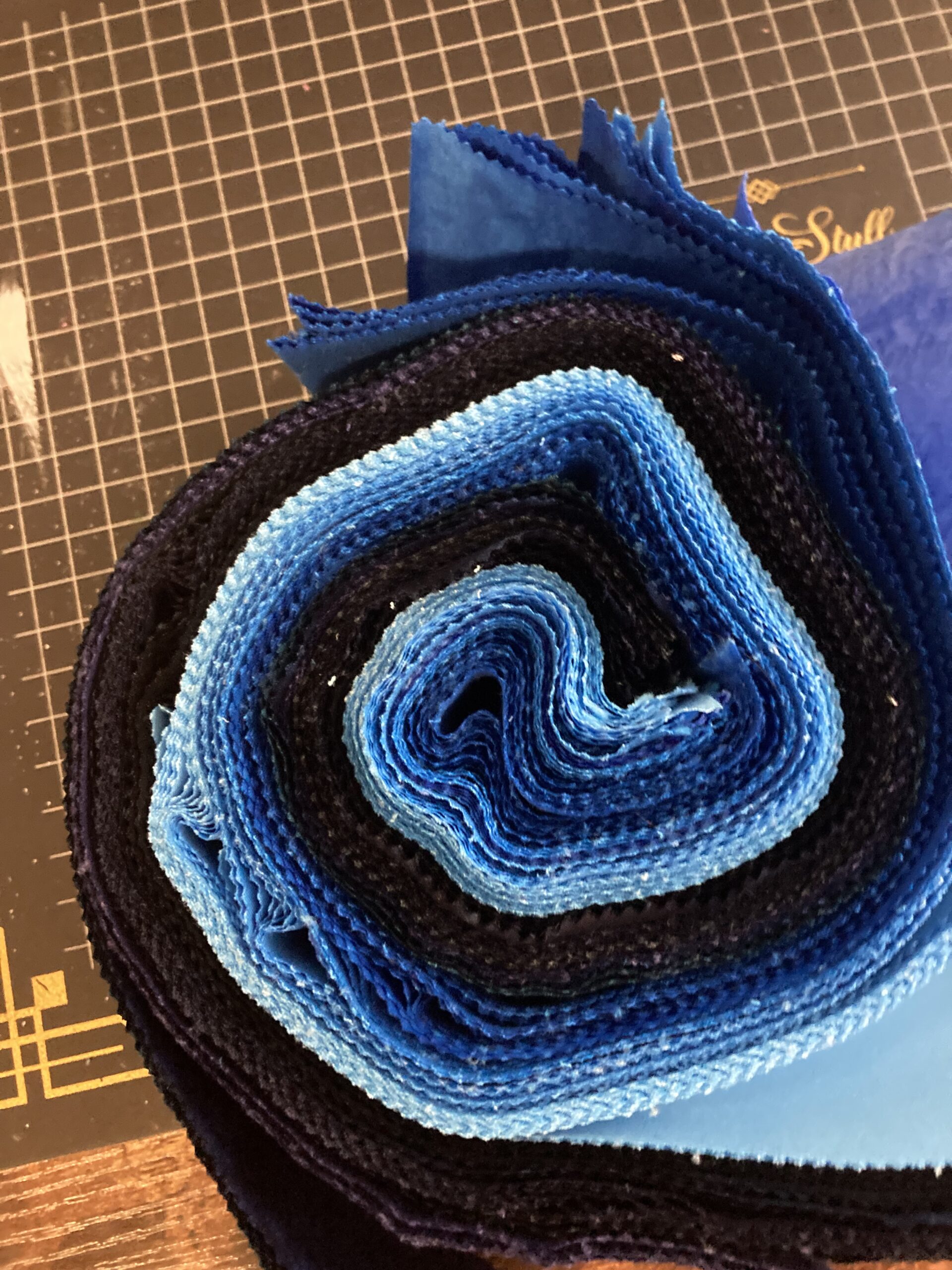 White and dark blues cut. The seventy warp pieces went faster than expected; with any luck the weft will follow suit. Shouldn’t be much fabric leftover on this one. At three 12.5″ pieces per WOF, I’d need another set of the same jelly rolls, only using half(ish). If I change up the order, I’ll have to hold layout until they’re received and processed to avoid an obvious division. Or maybe lean into it with a midtone striped border and binding – use up more of the existing rolls.