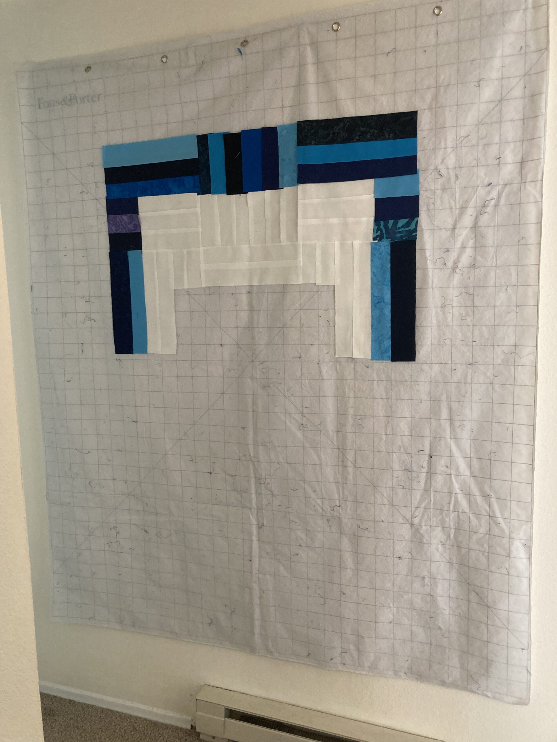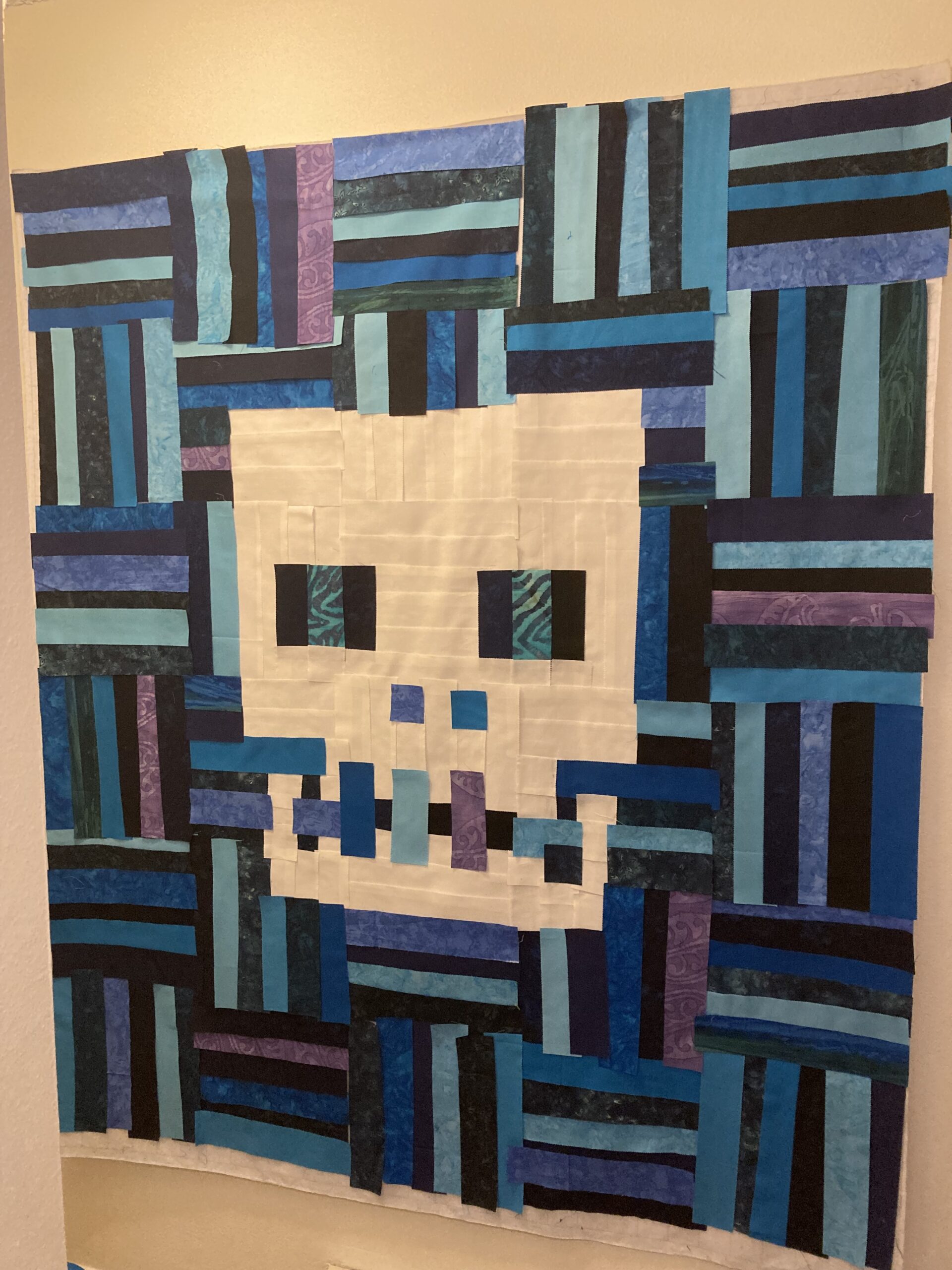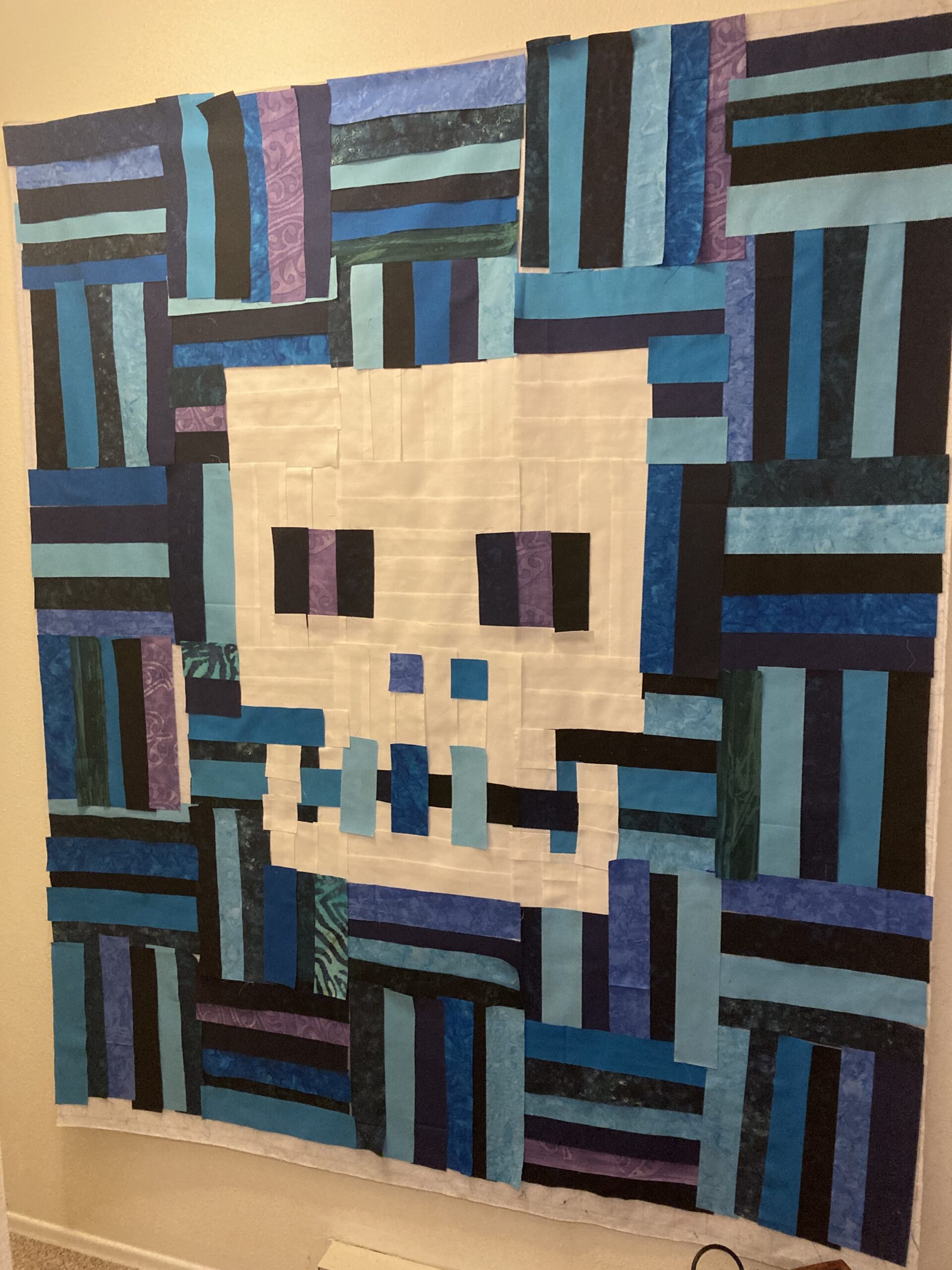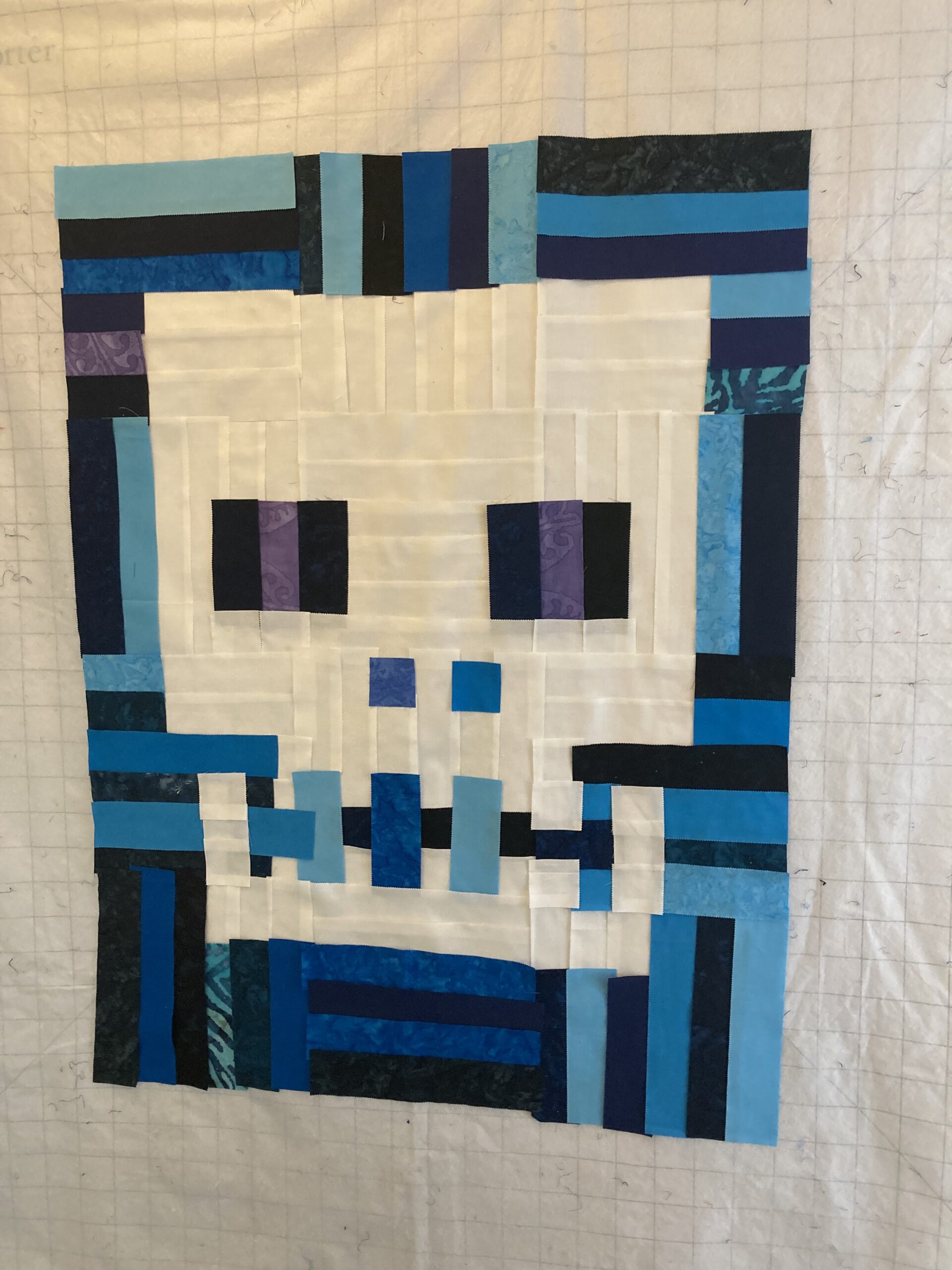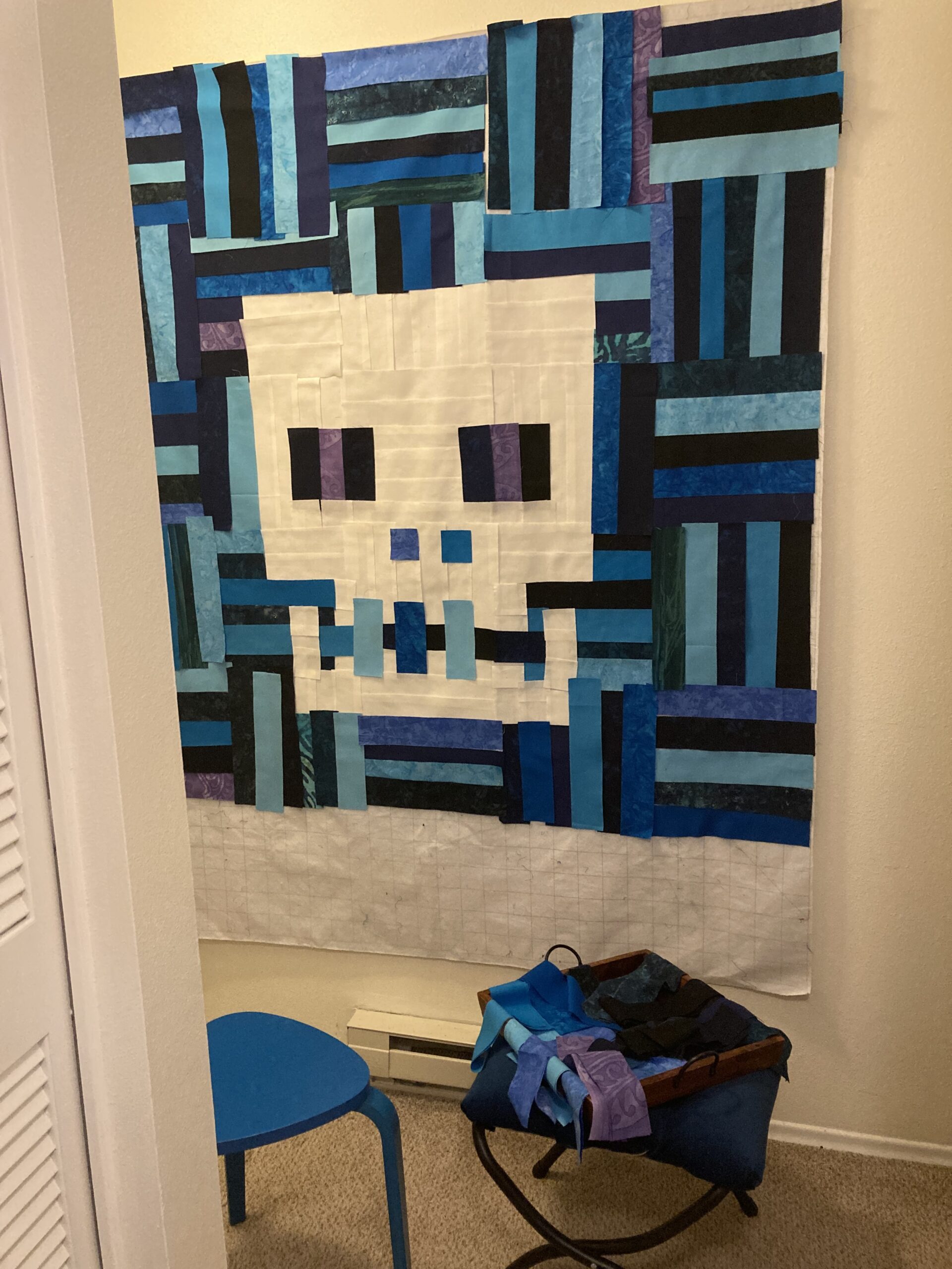 Thru the worst of it with enough strips left to fussy cut the final basket weave behind the skull and any other weirdness that pops up. I didn’t think about the half brick meetings on the birdcage cover and could never unsee it.