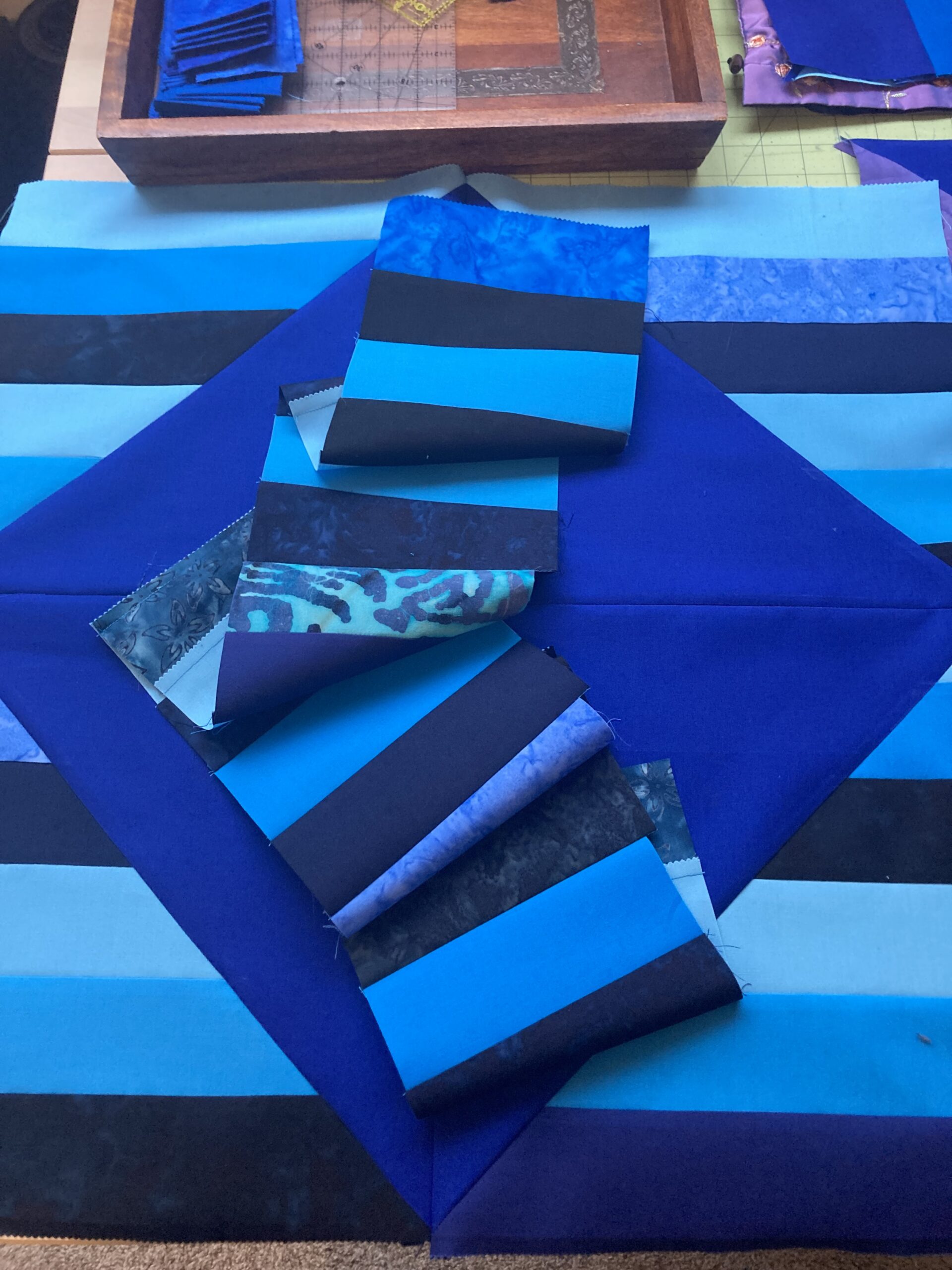 Finished processing the larger scrap strips and shelved the itsy bits. Pulling the last of the blue-green yardage to