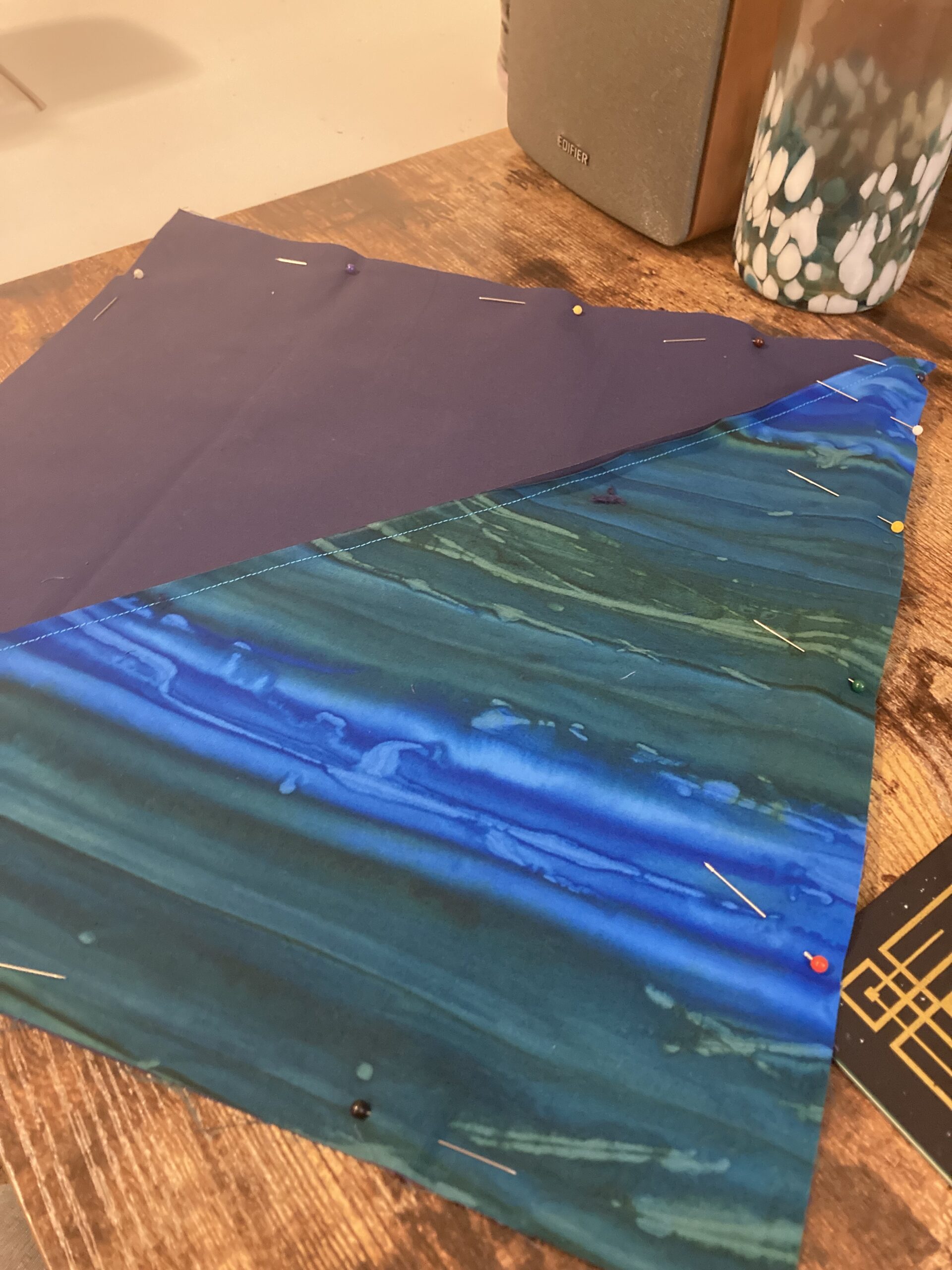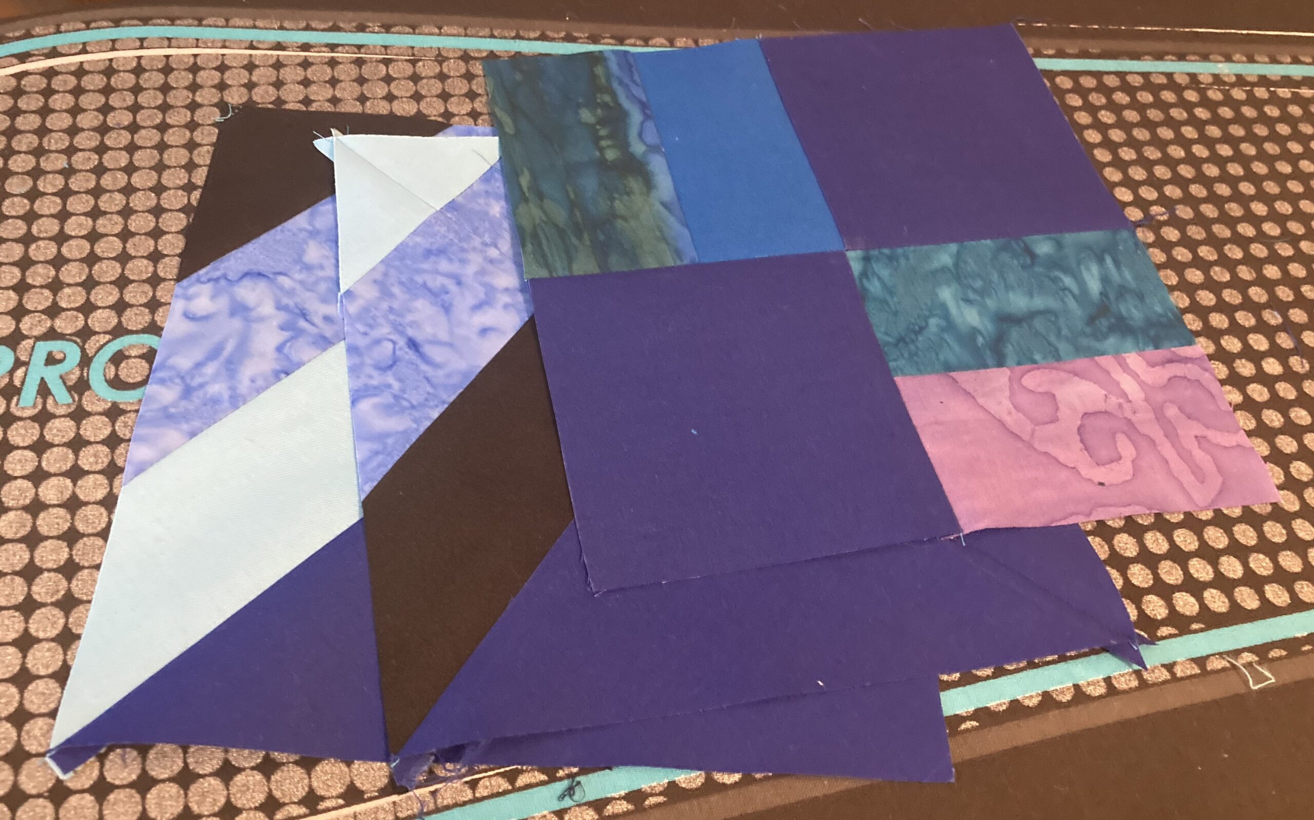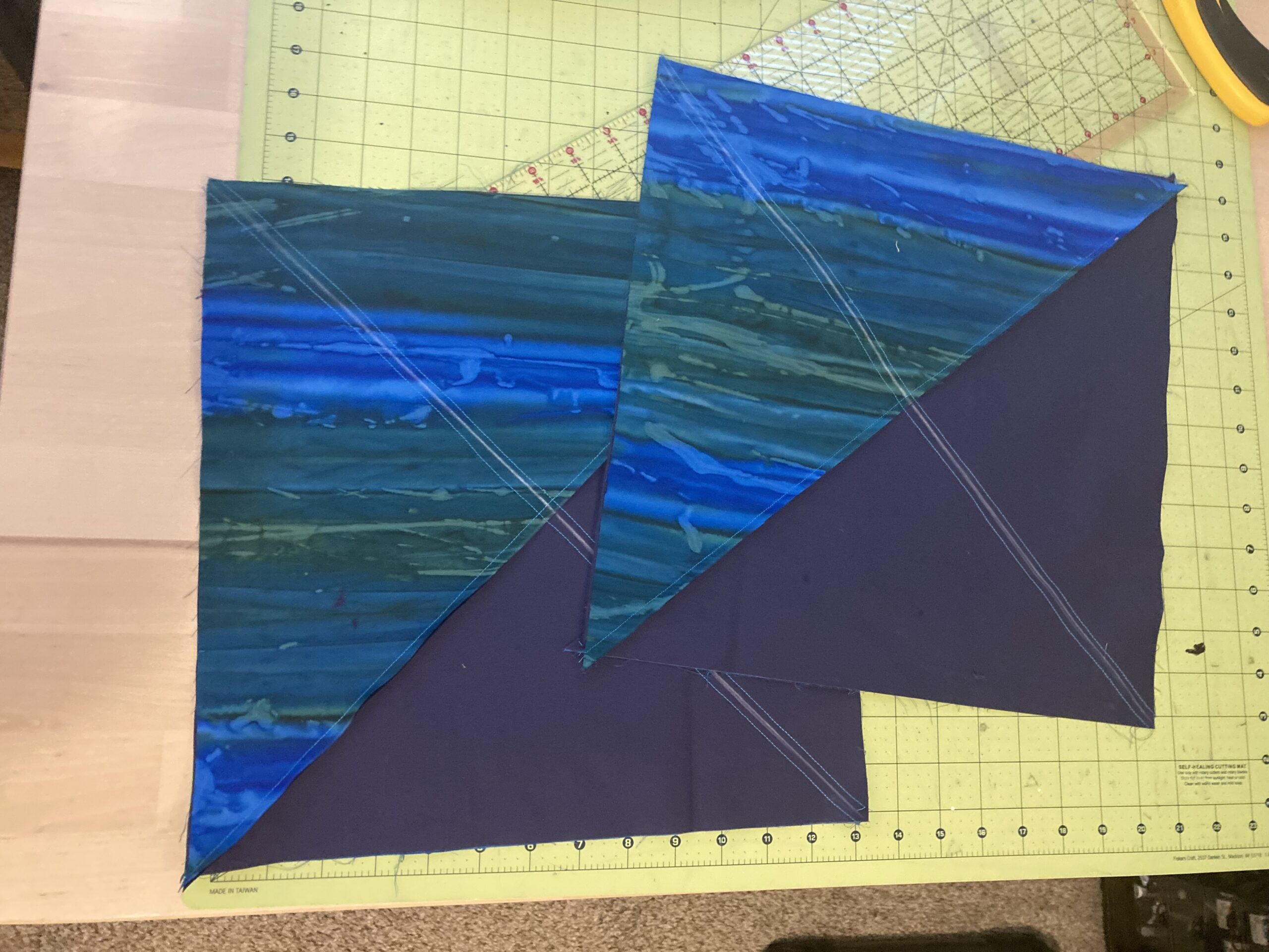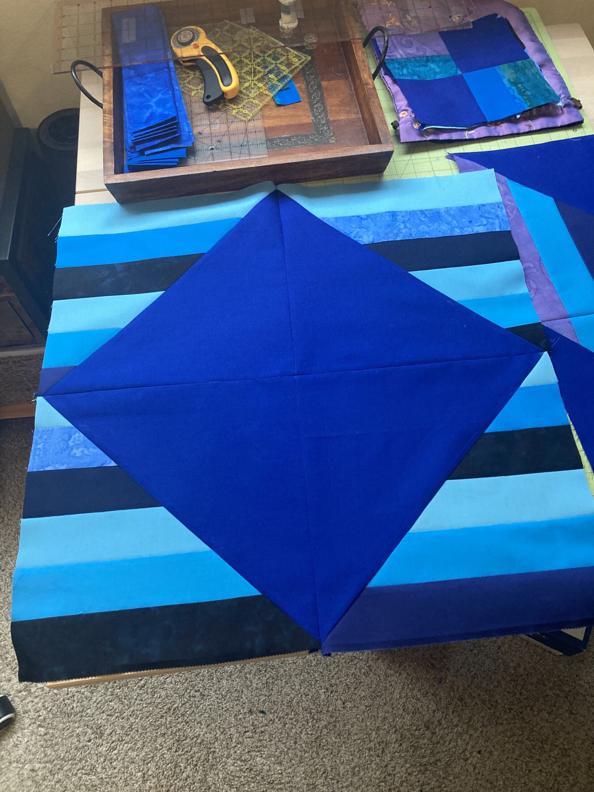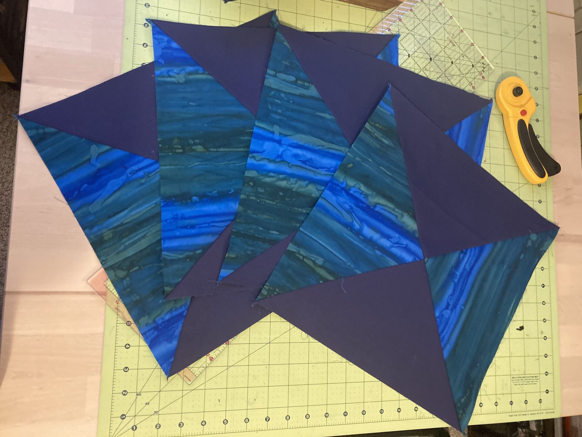 Outsmarted myself on hourglass blocks. Originally had the directional fabrics offset when I paired off the round one HSTs, but I reversed them so they matched. Once I flipped the perpendicular seam, I realized I should have left well enough alone.