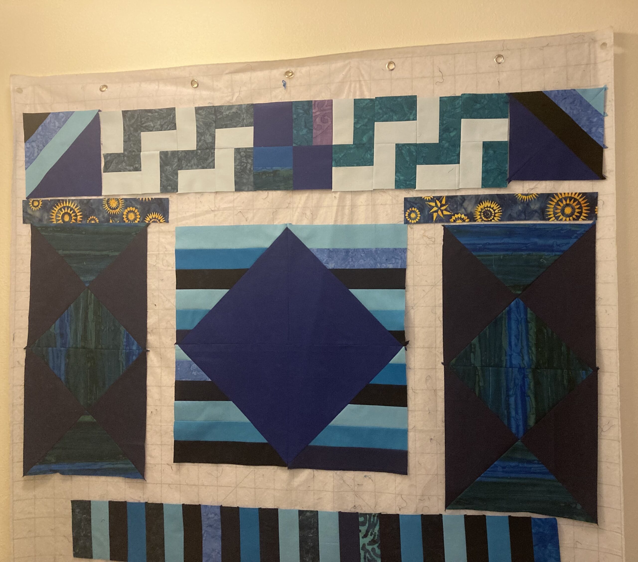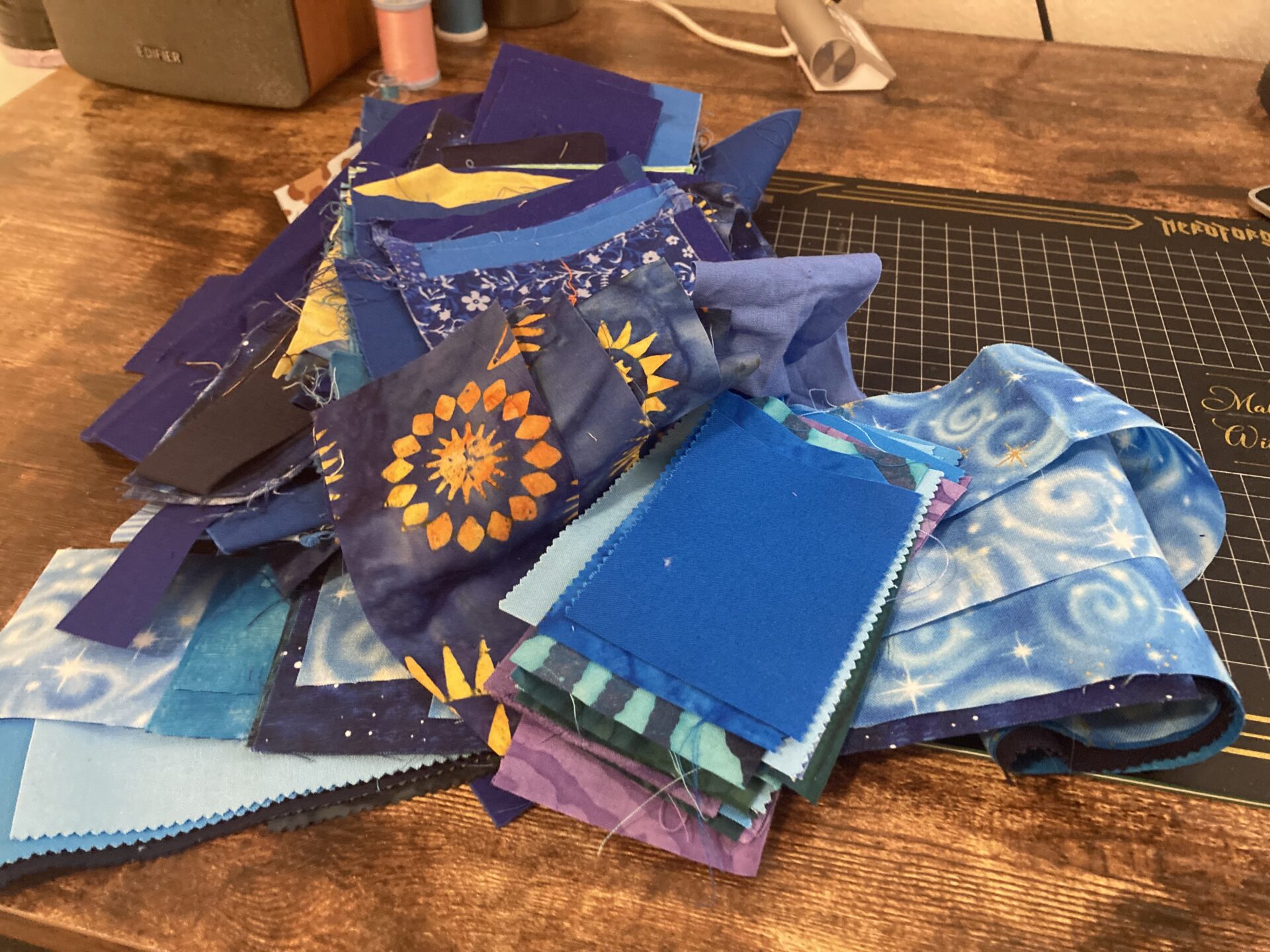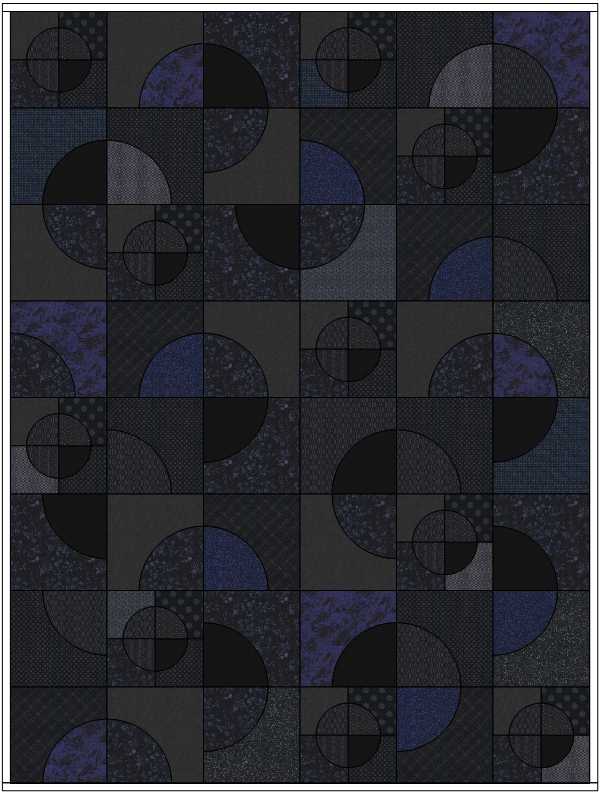 Threw together a starting point for the Tentacular patchwork base. Mix of 12″ and 6″ diameter drunkard’s path circles in dark blues, blacks, and greys – tone-on-tone, low contrast, variable pattern density.