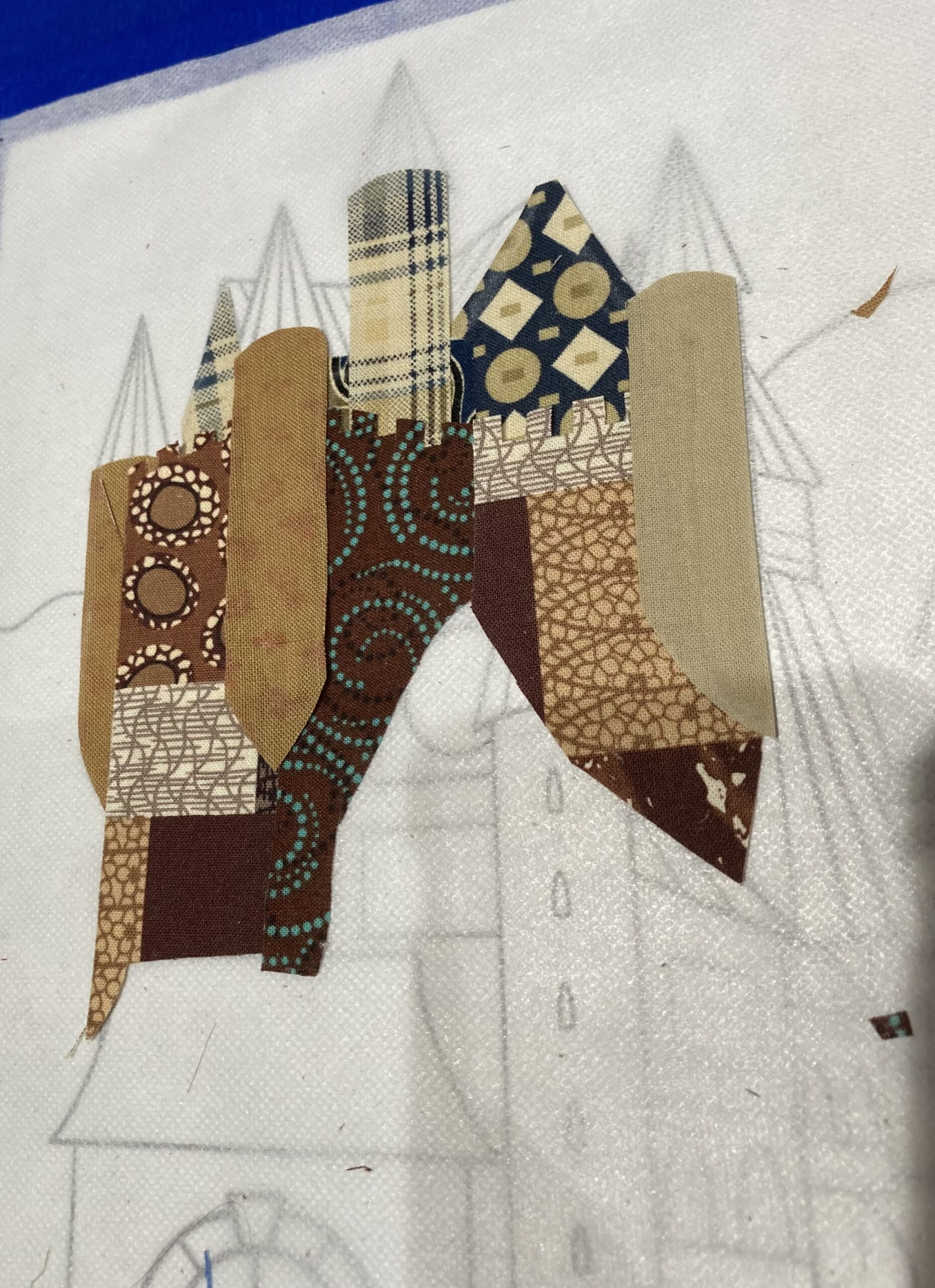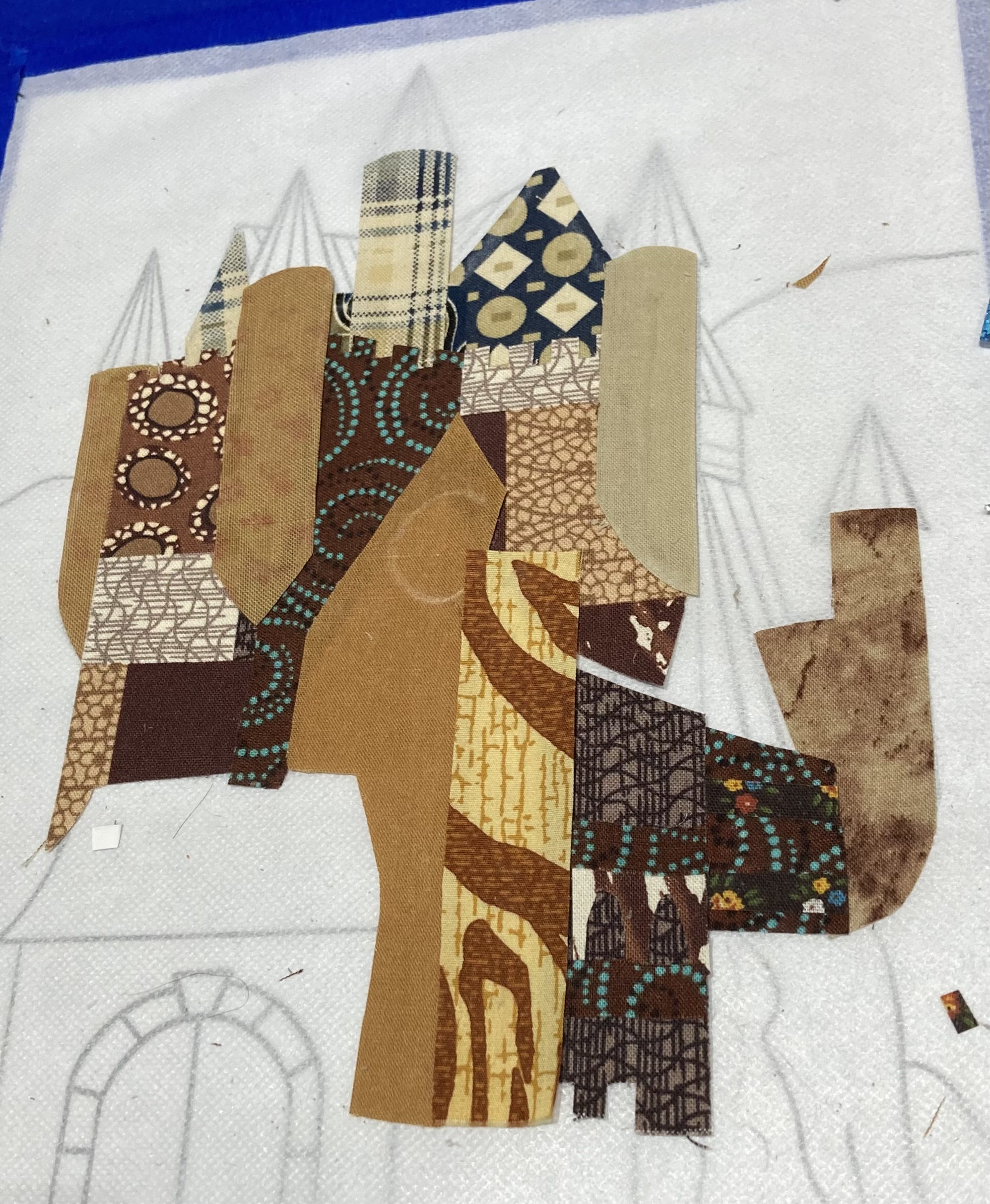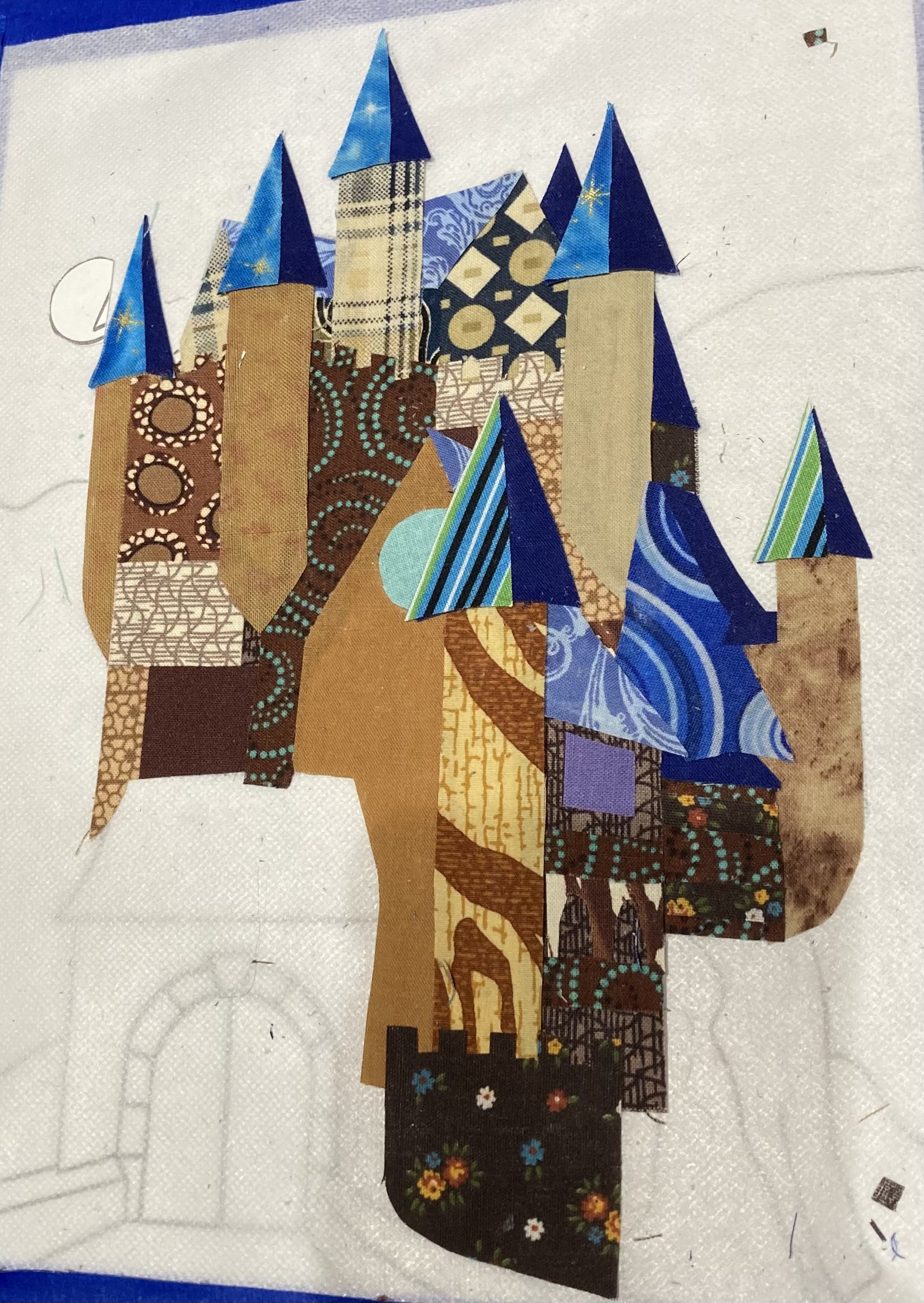 Still rather sketchy, but more castley with the roofs in place. Curious how much the stitching is going to enhance or confuse things; free motion quilting has never been my bailiwick. For now, finish the base and the guardhouse, maybe shade the towers to match their roofs.