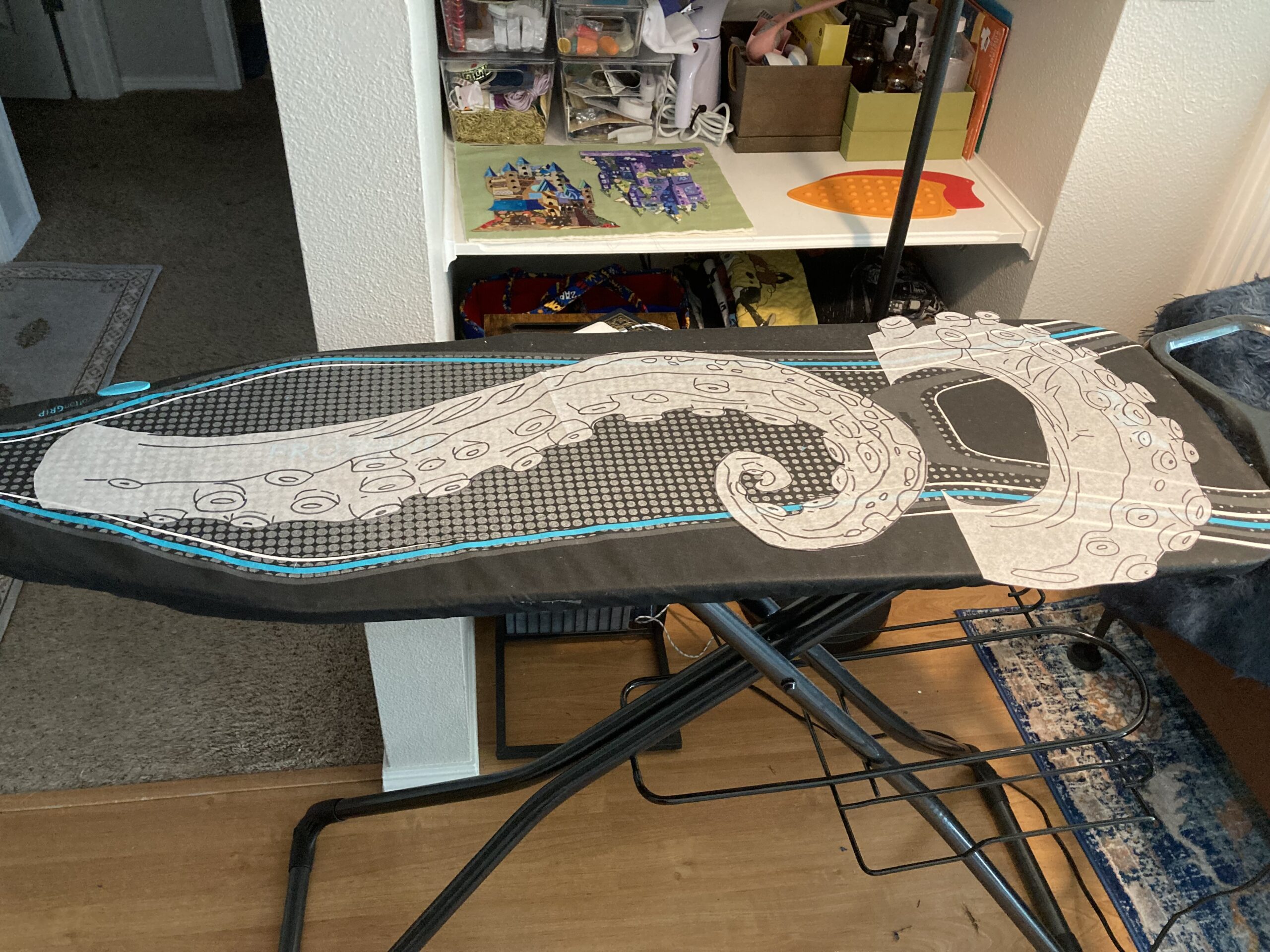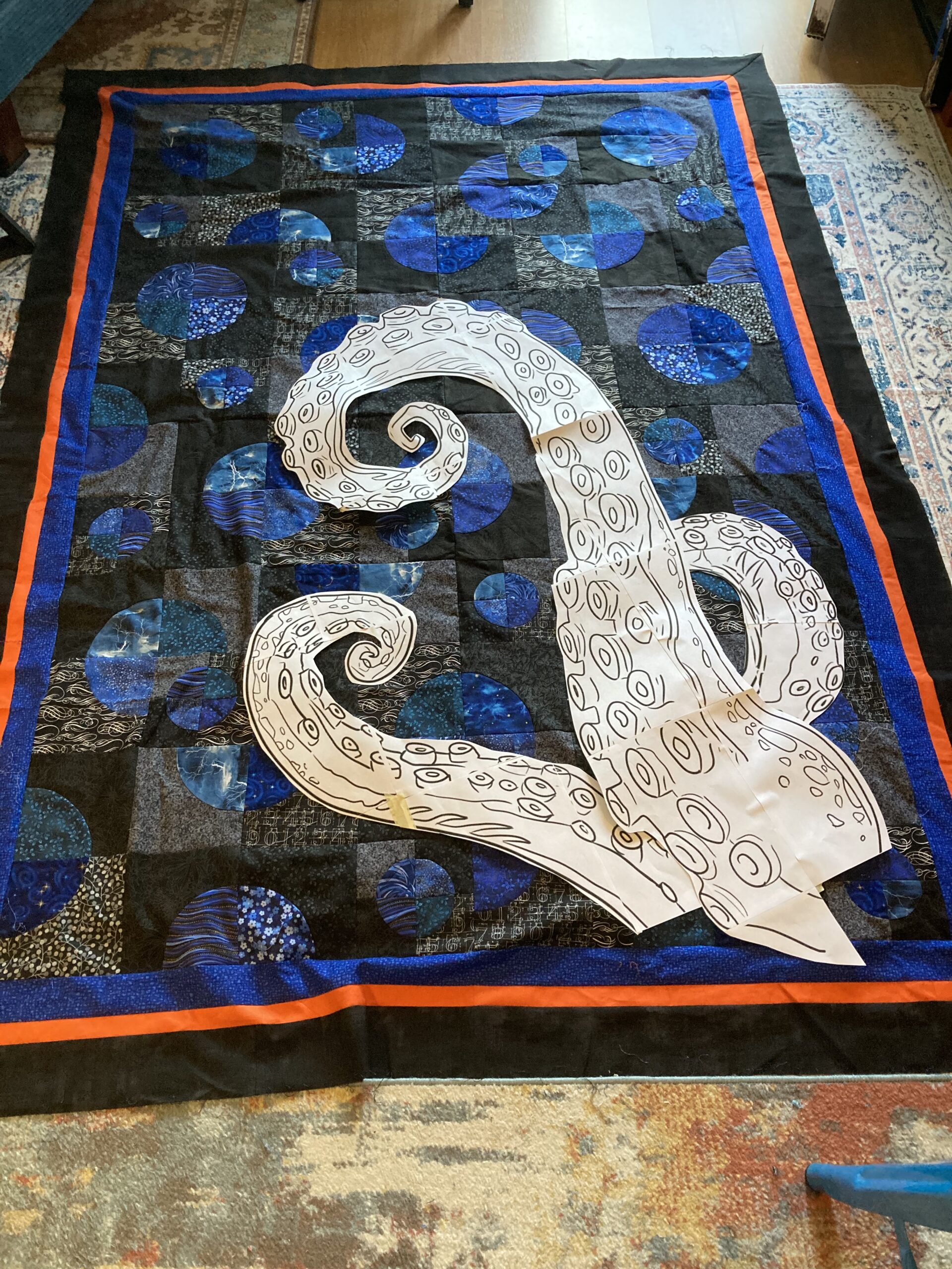 I have officially seen too many sad pictures of octopus salad. I like the interplay of the orange and the pale blue, echoing the blues in the background lightyears down the wavelength. I still have some jellyroll blues that were too pale for Basketcase, should fit the bill nicely. And if you can see the orange shadow through them, even better. But no more than two layers of fabric + PE and SAS2. It’s already going to gum the needle, no point adding injury to irritation by breaking it. Going to have to work in small sections to keep the overlaps tight.