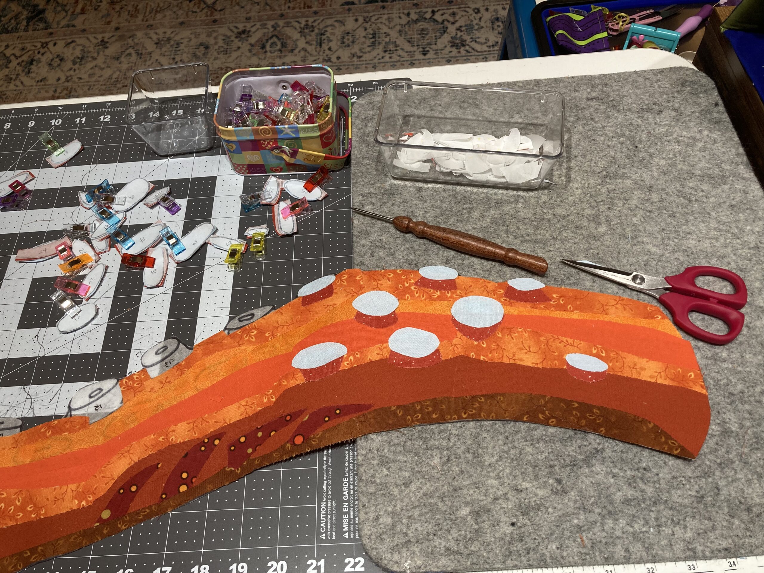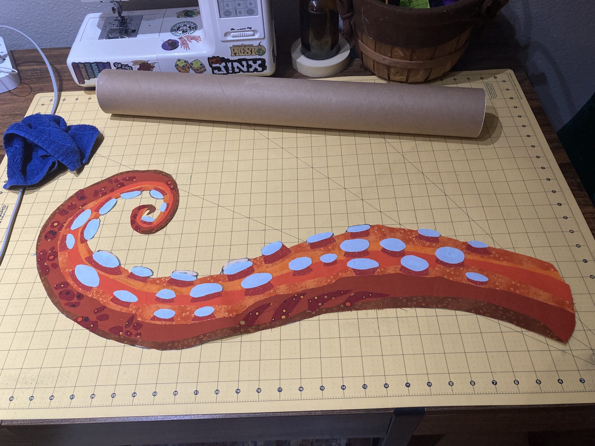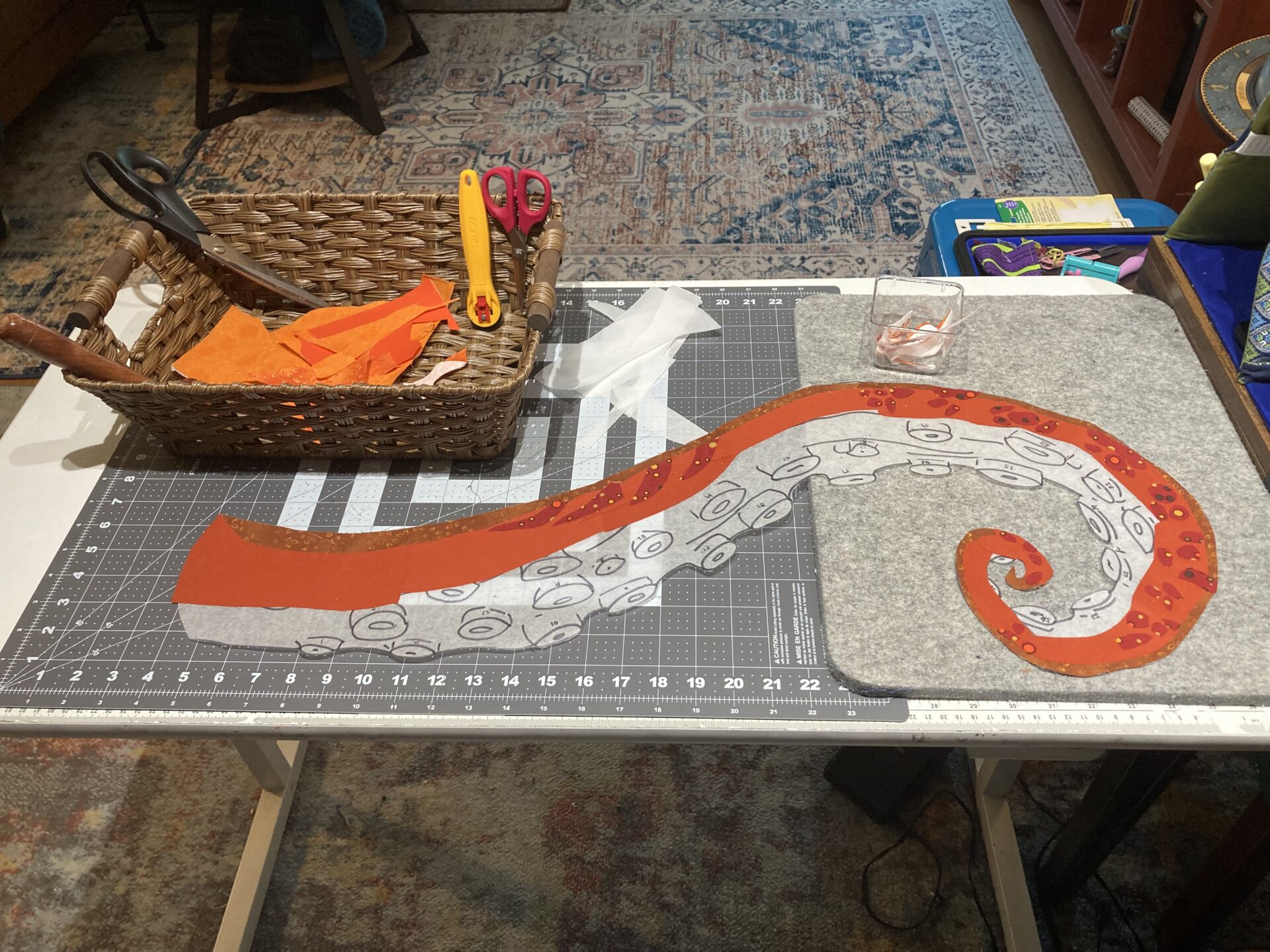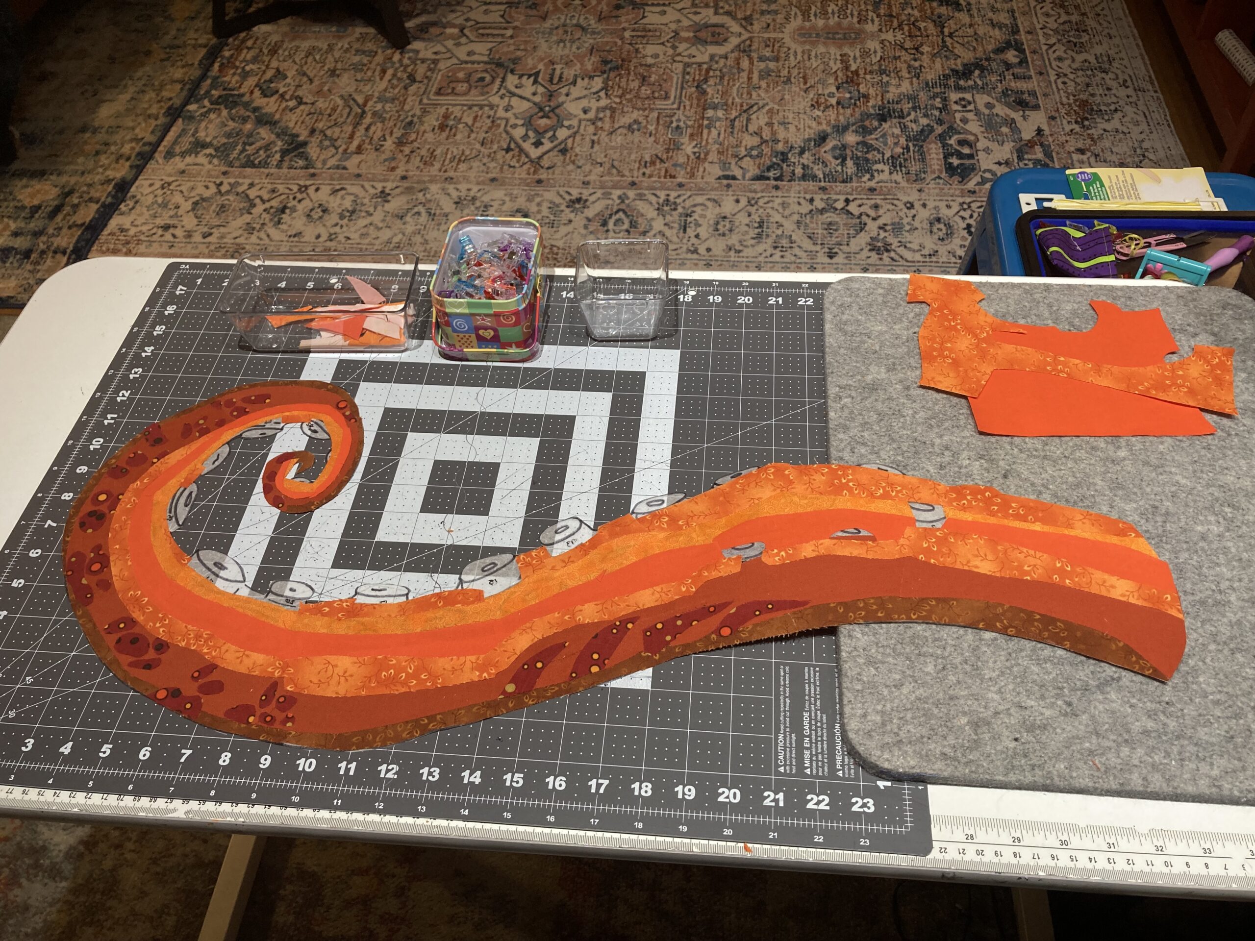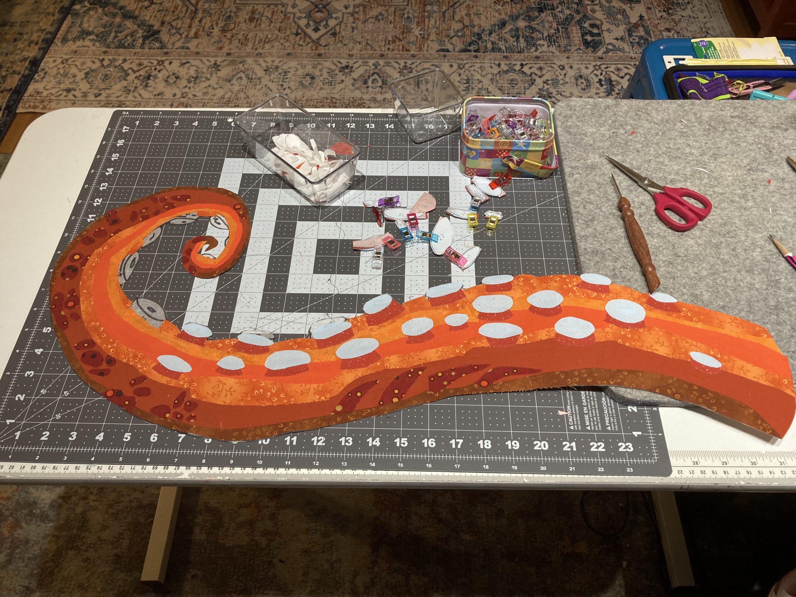 Tried another variation on the color blocking, but its still not quite right. Third time’s a charm. Third tentacle is also about six feet long – six tapering, curling feet. How do I get myself into this shit? Plenty of fabric, plenty of SAS2, and a weekend encroaching like the woods at Dunsinane. Once it’s fused, these spots are not coming out.