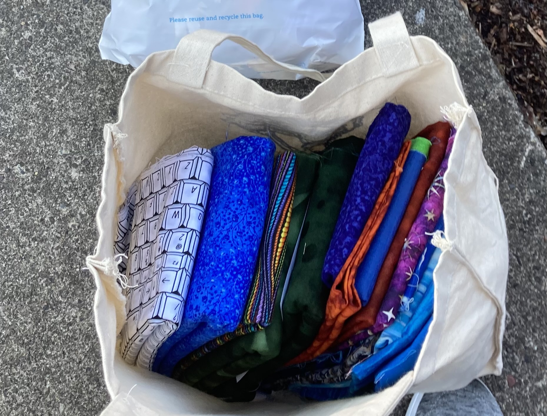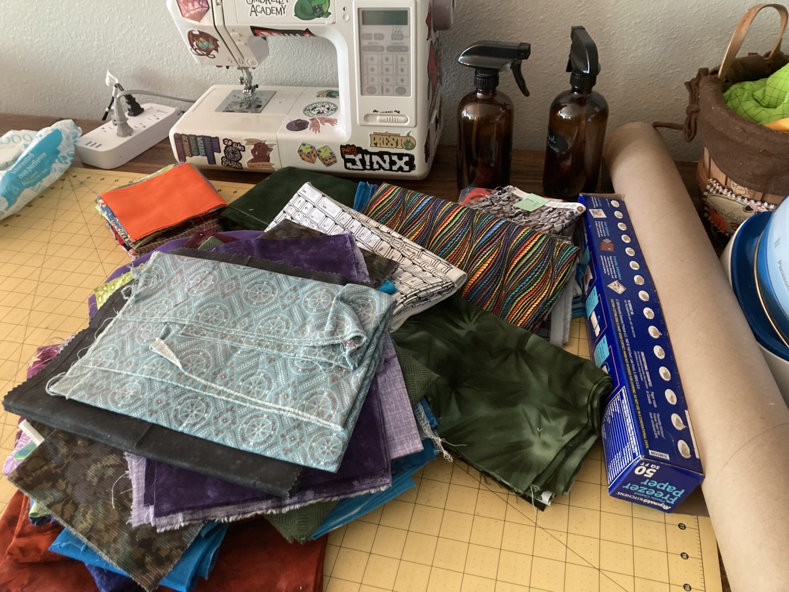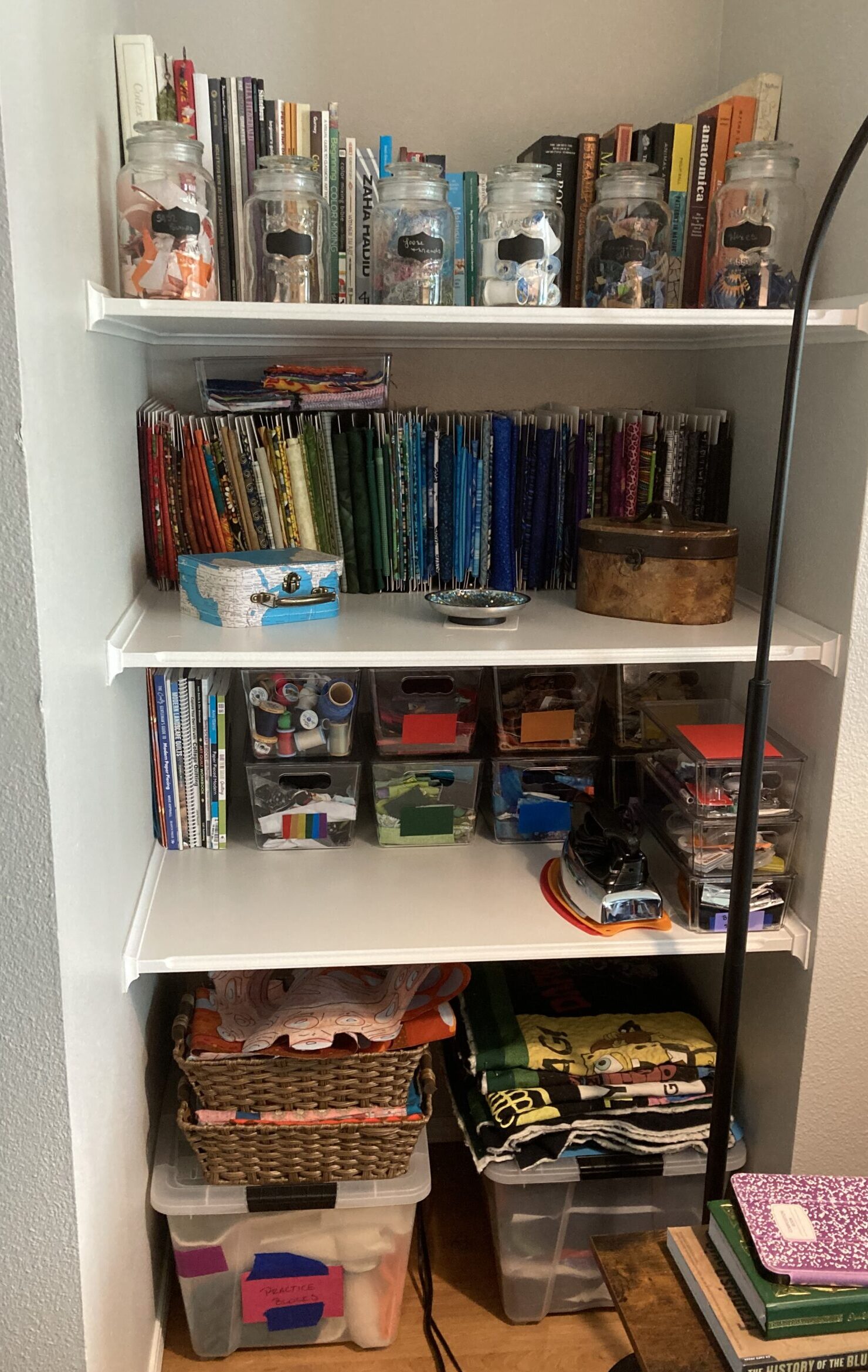 Been a week with nothing but hand-quilting. Getting itchy again, but inertia is an ass. Starting with what the space needs most right now – a post-wedding overhaul. And more retail therapy. The Guild’s annual fabric sale was on my birthday – coincidence or kismet? Of course, the fridge also died, so all things in moderation.