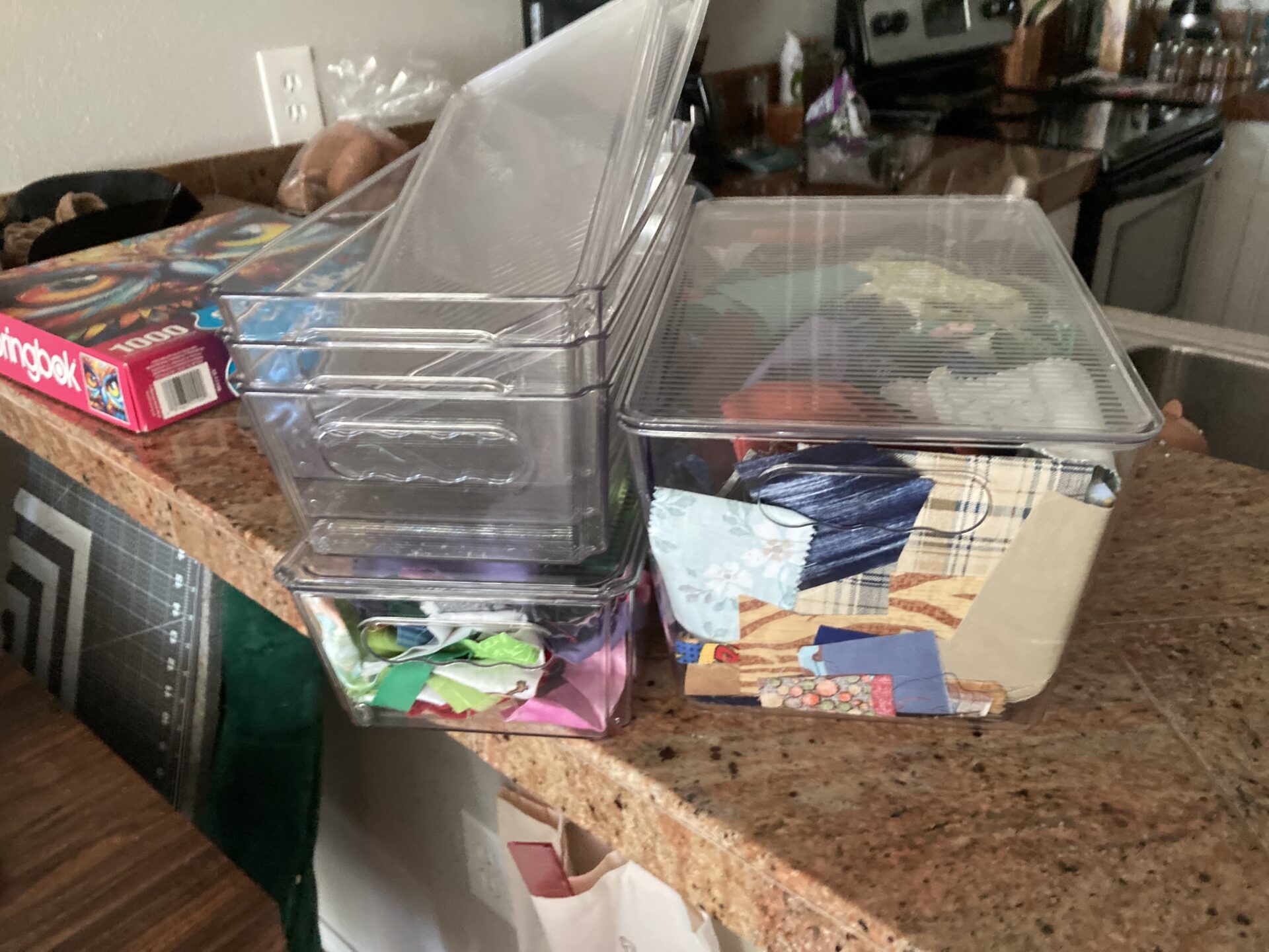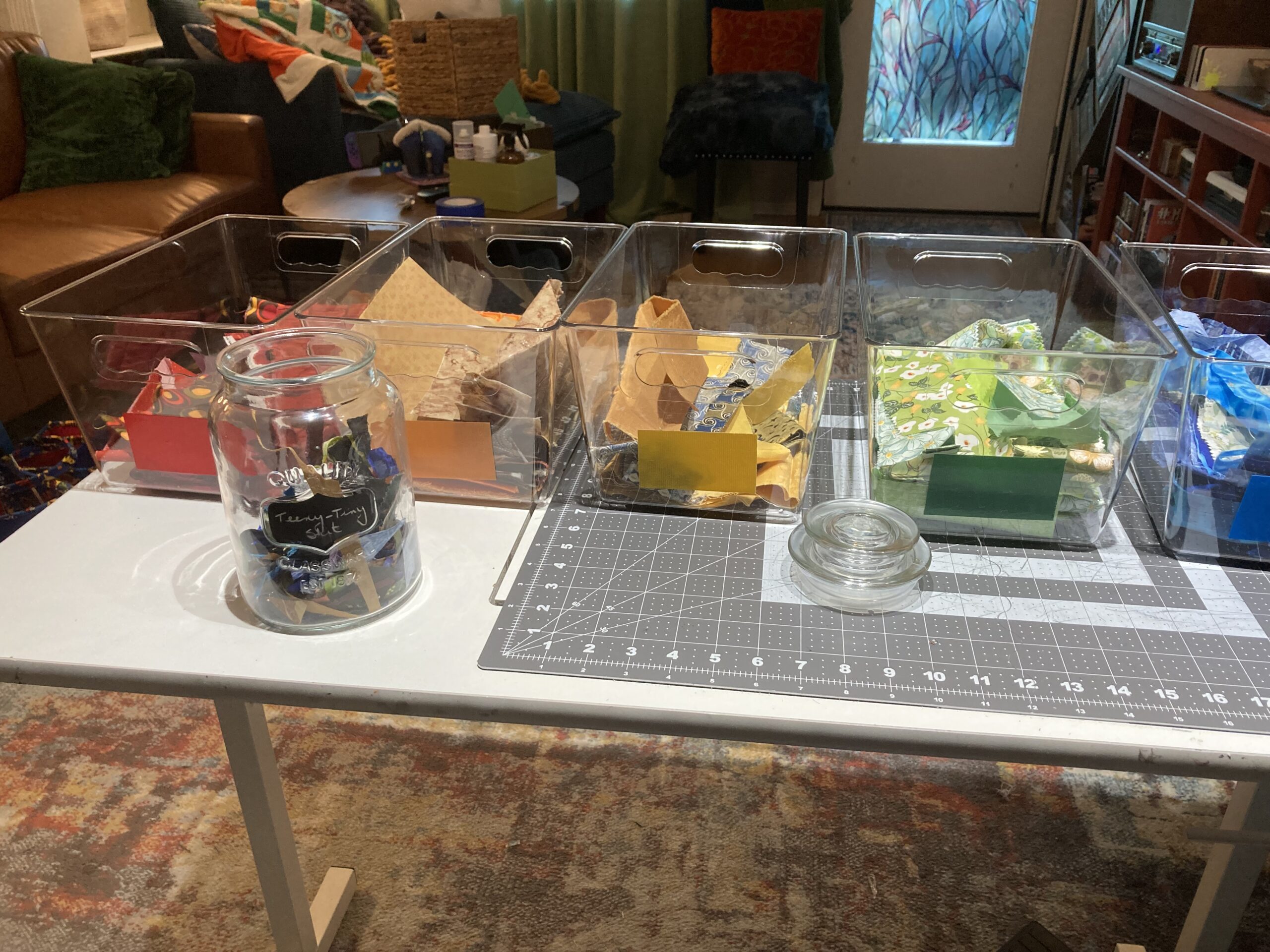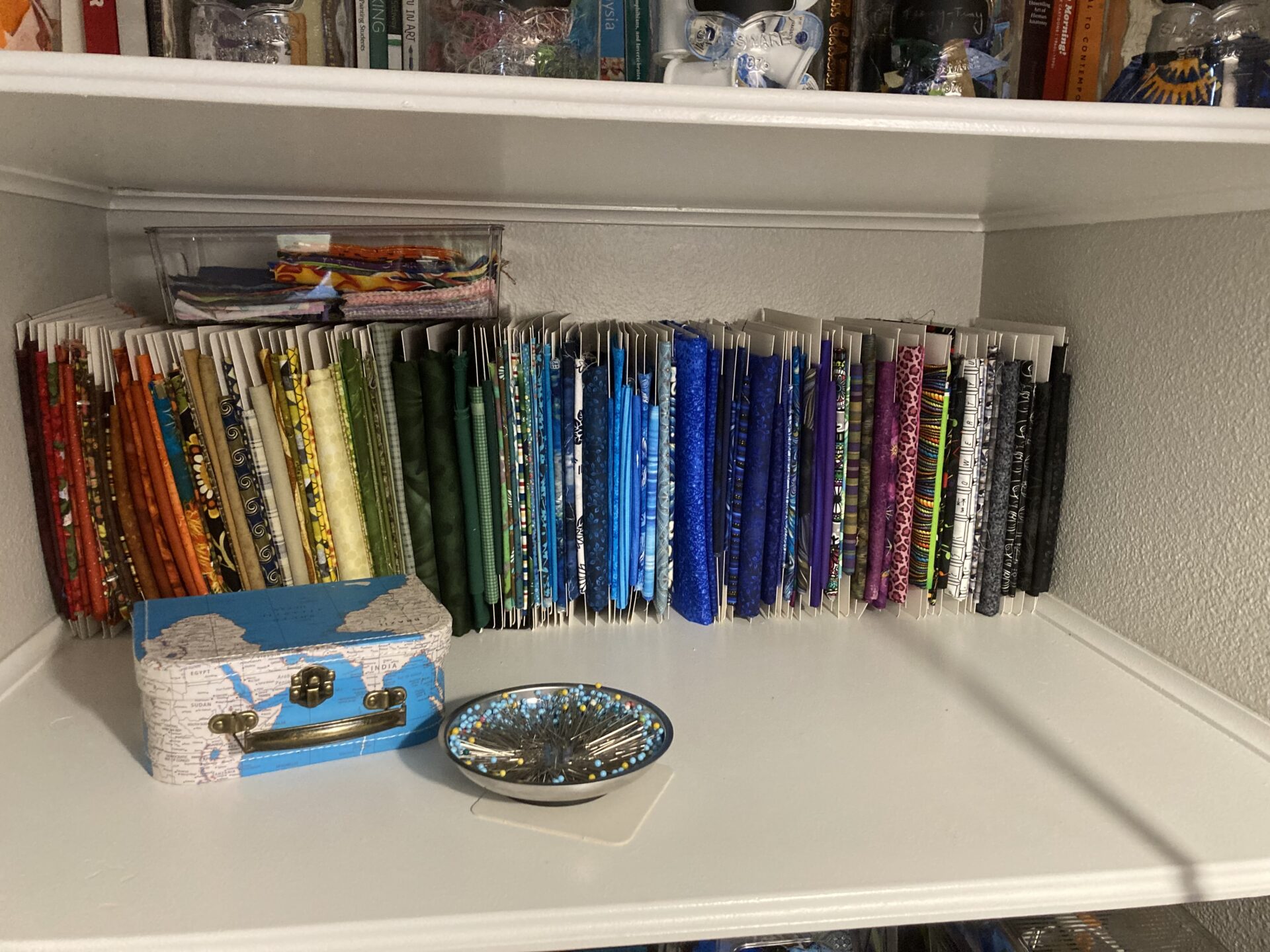 Brought in bigger bins and went hue-based this time. Picked up some comic book boards and plastic clips so I can see my yardage. One more small drawer organizer on order for the cutting table, but it’s mostly there. For now anyway.
