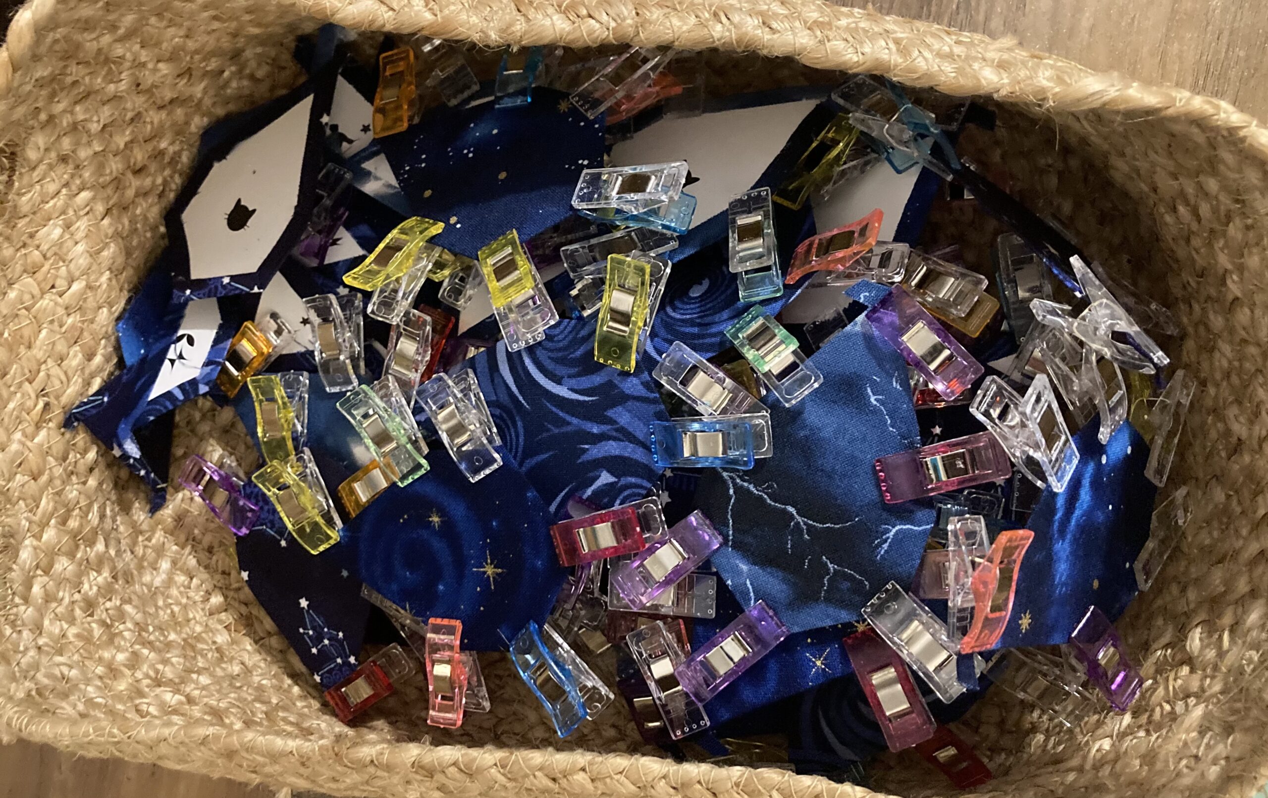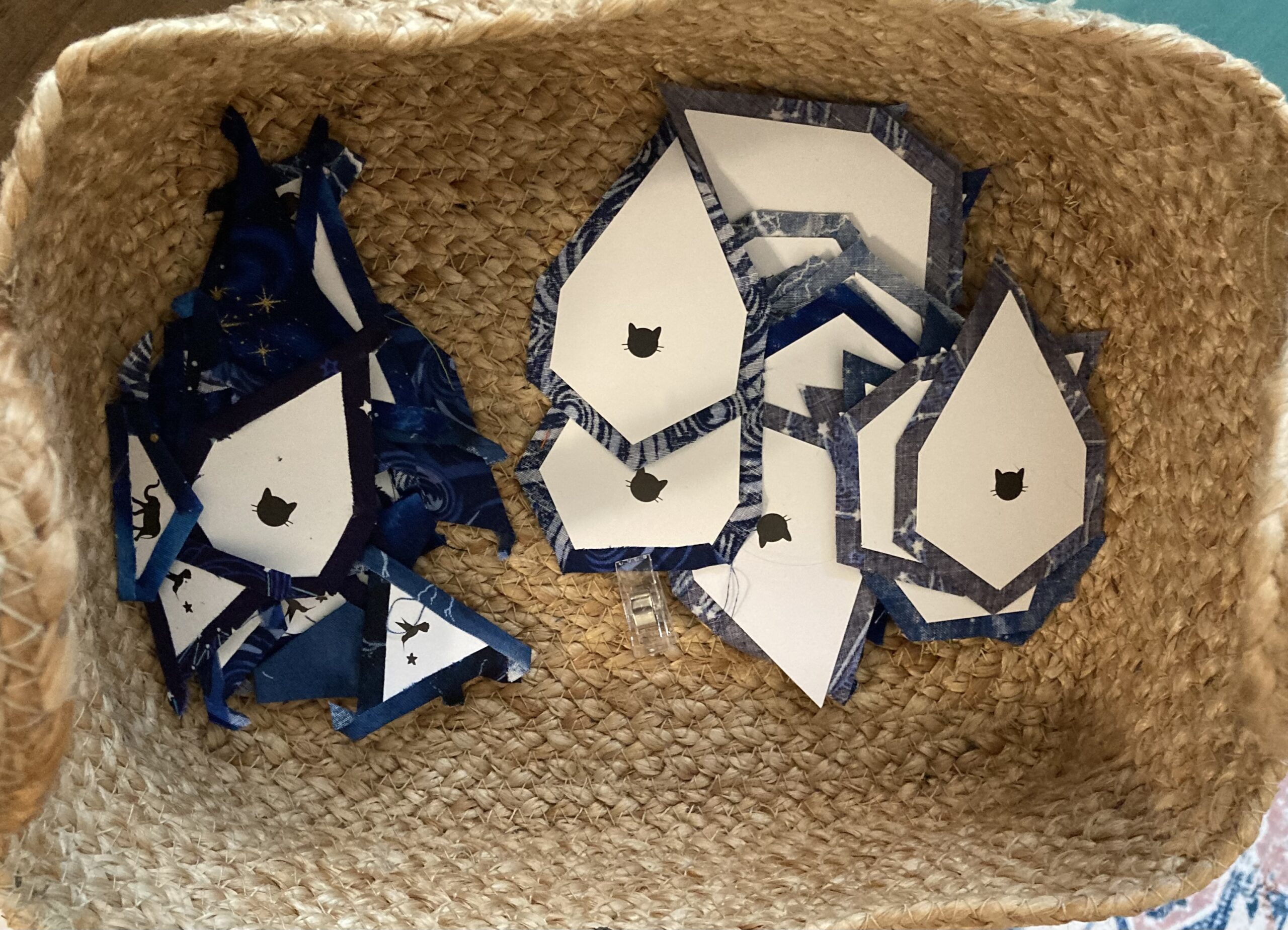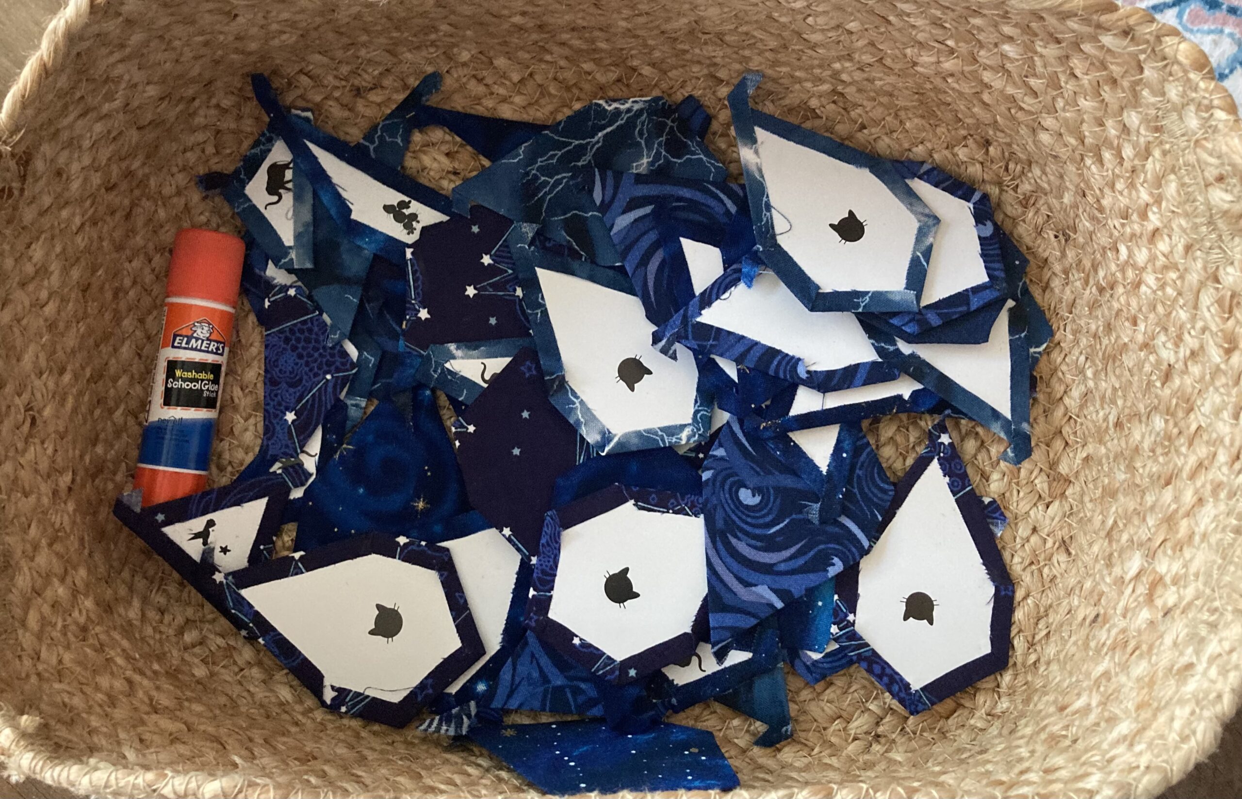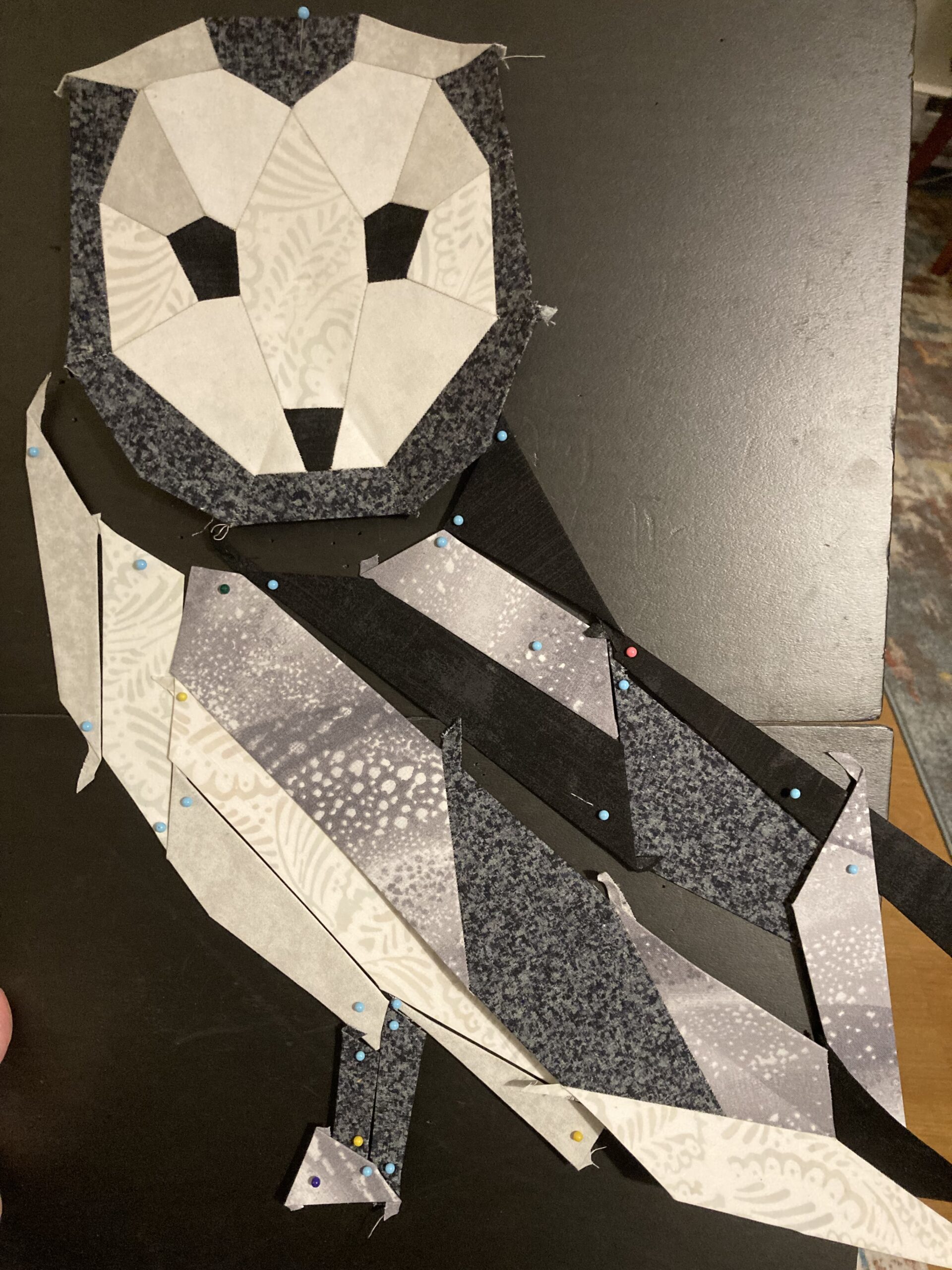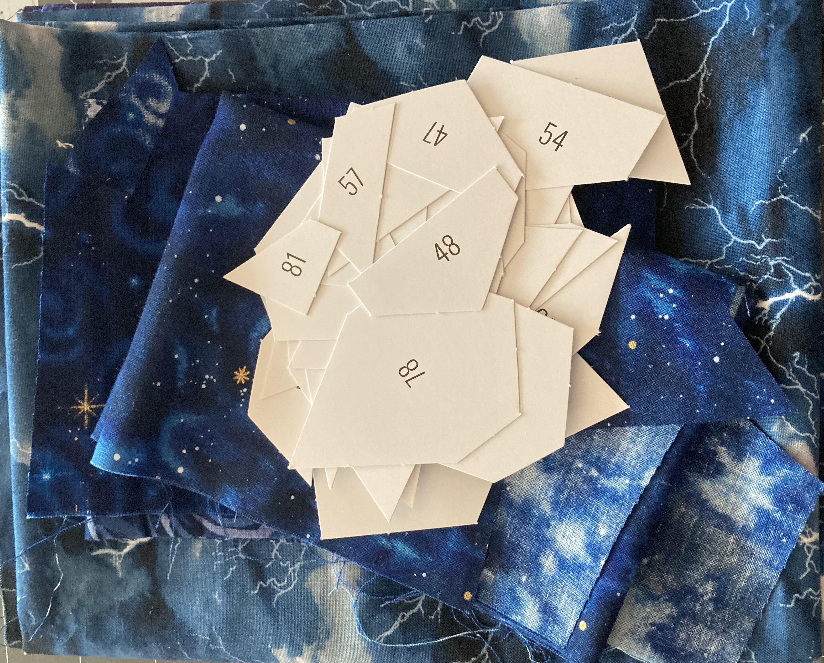 Progress is slow but steady. All of the standard background pieces are prepped; down to the last 40-ish oddballs. Will probably hold them until more of the sky is filled in to avoid pattern puddling and weirdness. Ran short on thread, so the warm white is 50wt and the black is 35wt and maddeningly tangly.