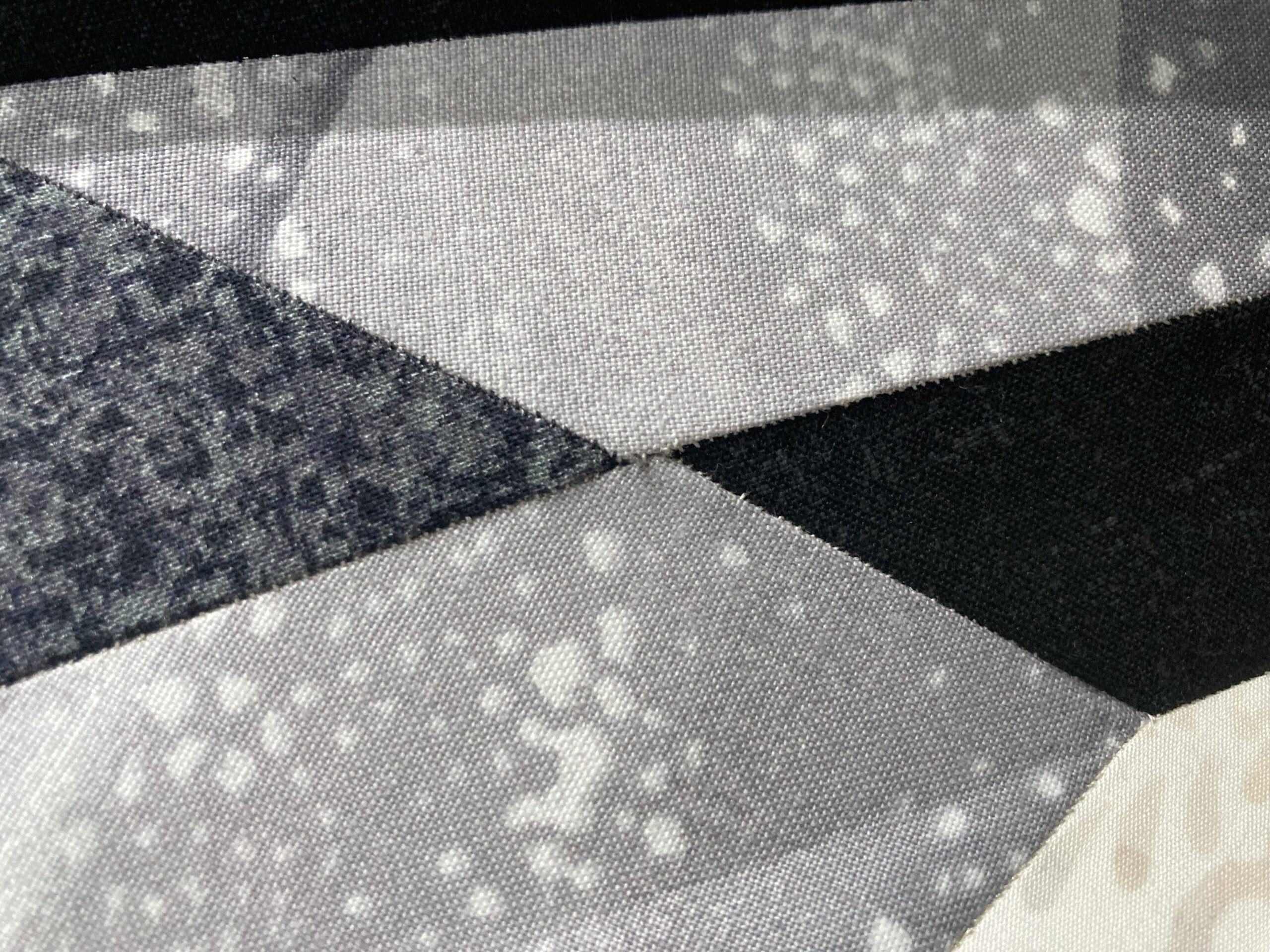 As is the misalignment of the two main wing sections. The mottled greys came together perfectly, but the speckled are off almost a 1/4″, pushing the lower portion of the wing out of alignment. I thought about restitching the join, but it would be simpler to let out the lower seam allowance, trim the paper, and re-baste.