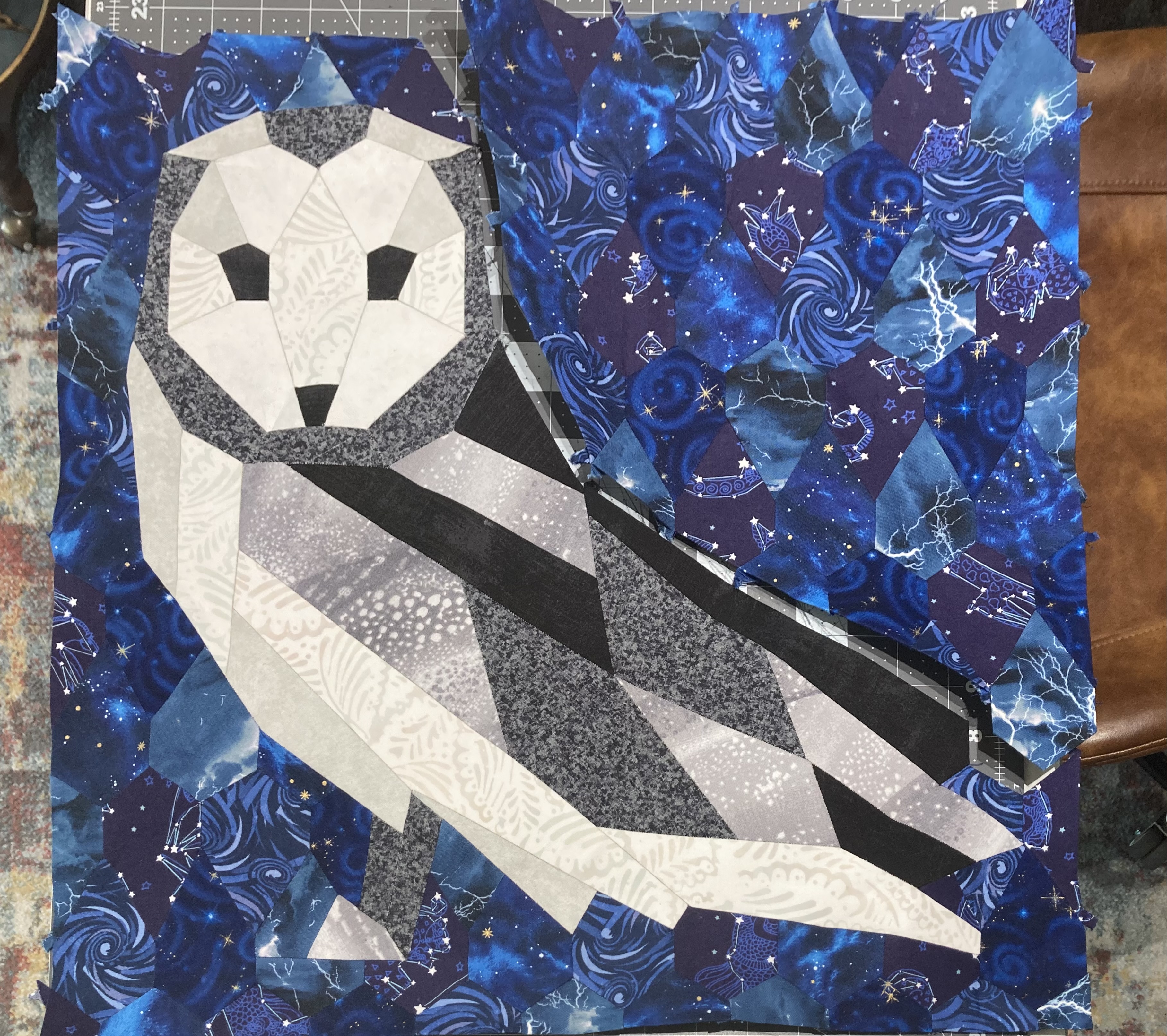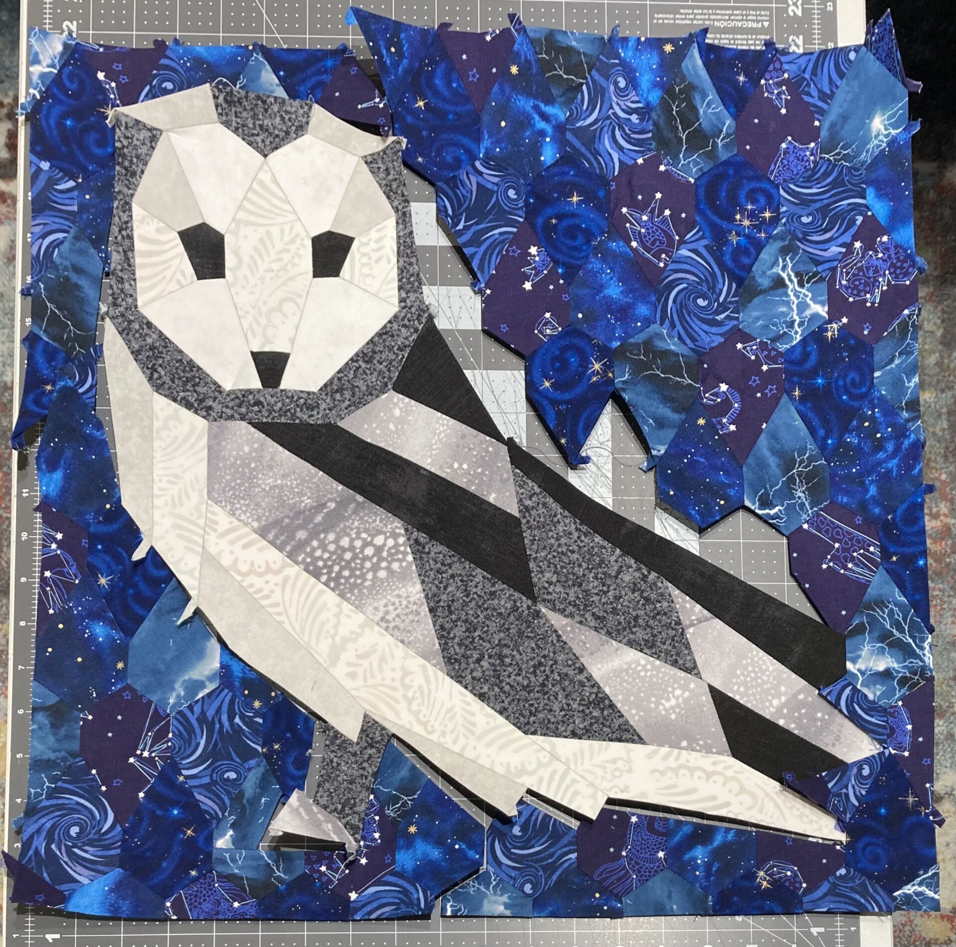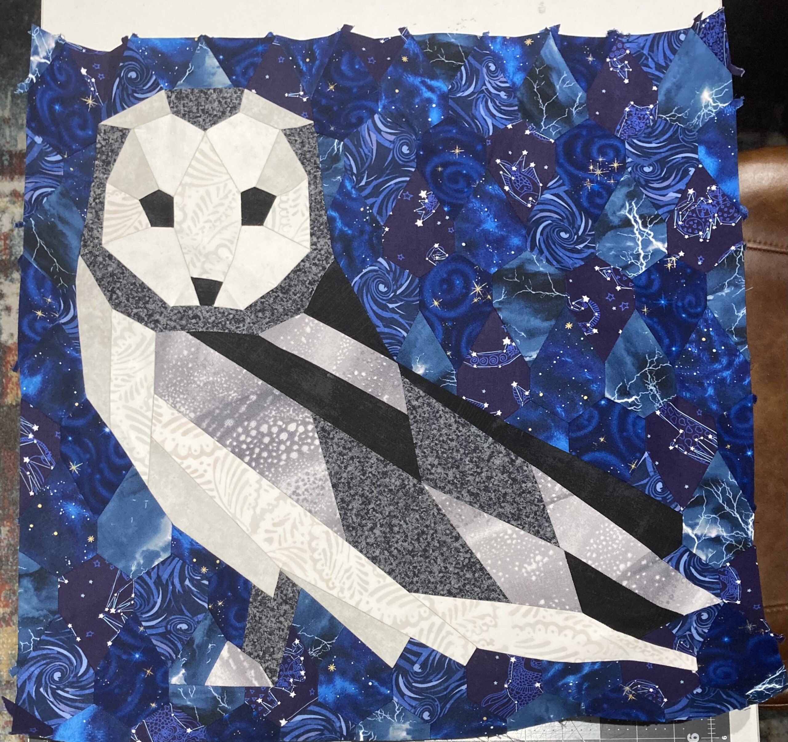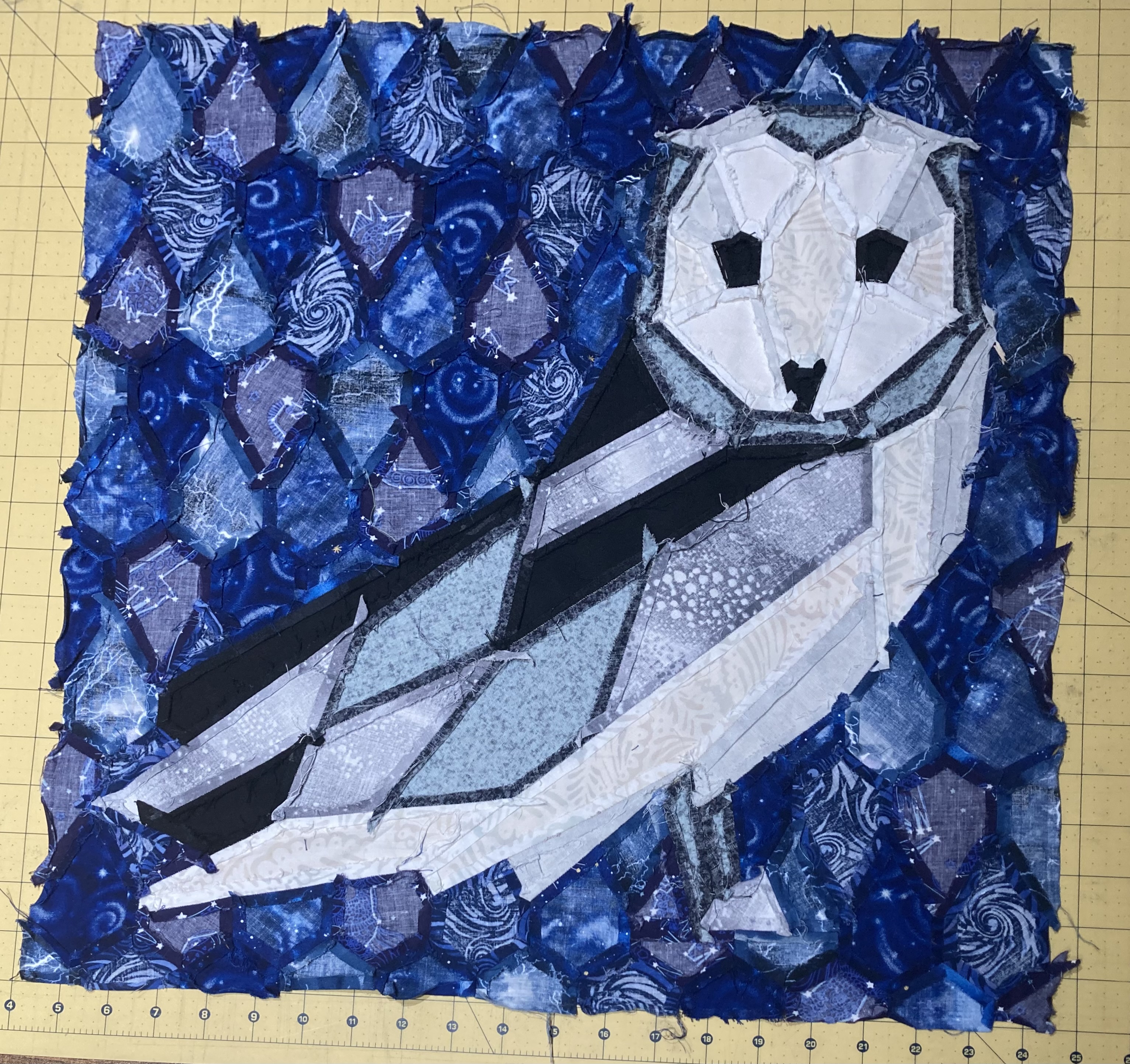 Filled in the last corner with only one potential fabric-to-fabric match. Fortunately the owl’s hindquarters are blocking my blunder. I really need to quit cutting it so close. Based on the last two black-and-blues, next time pulls n+1 fabrics where n is the number of sides of the primary shape.