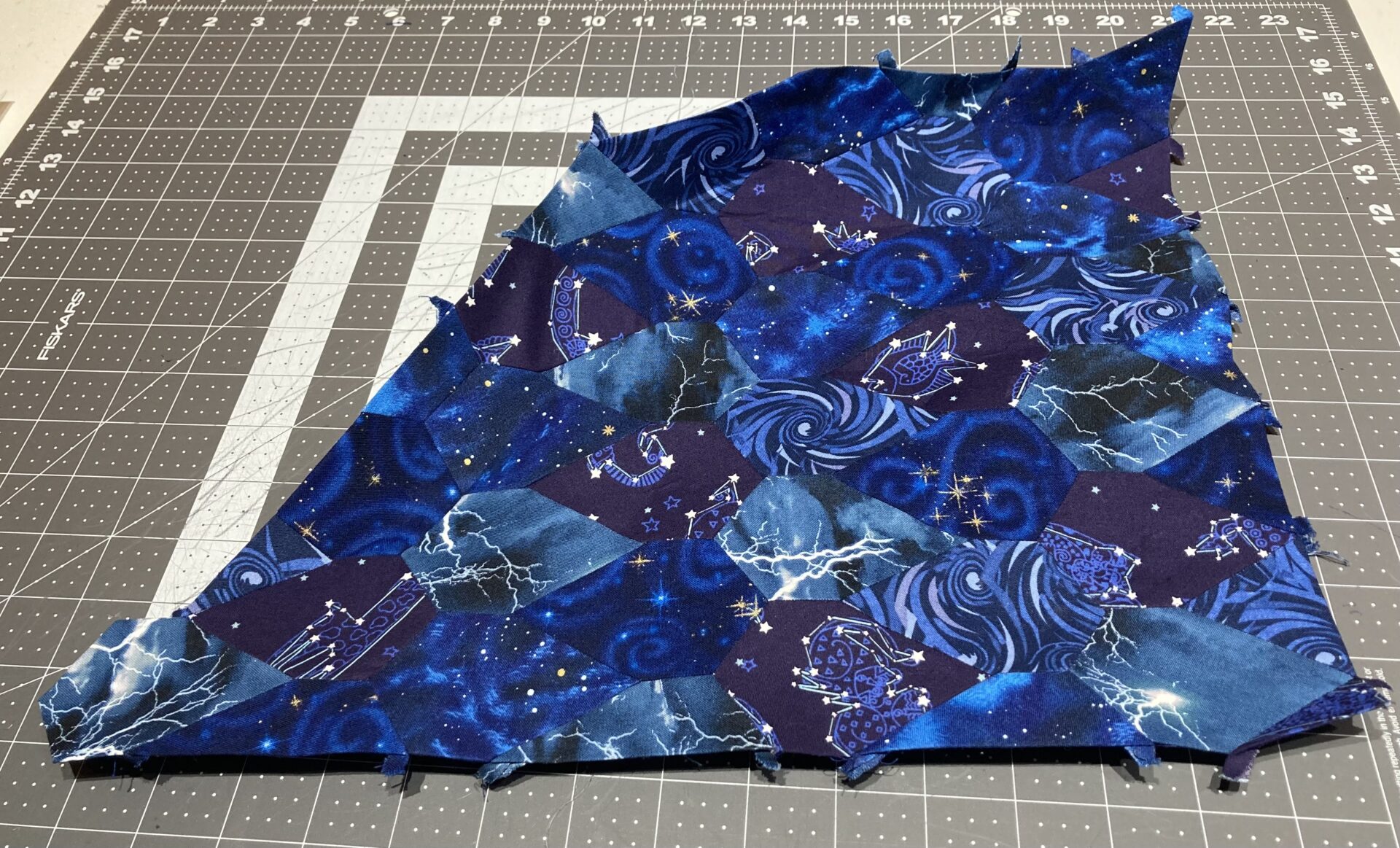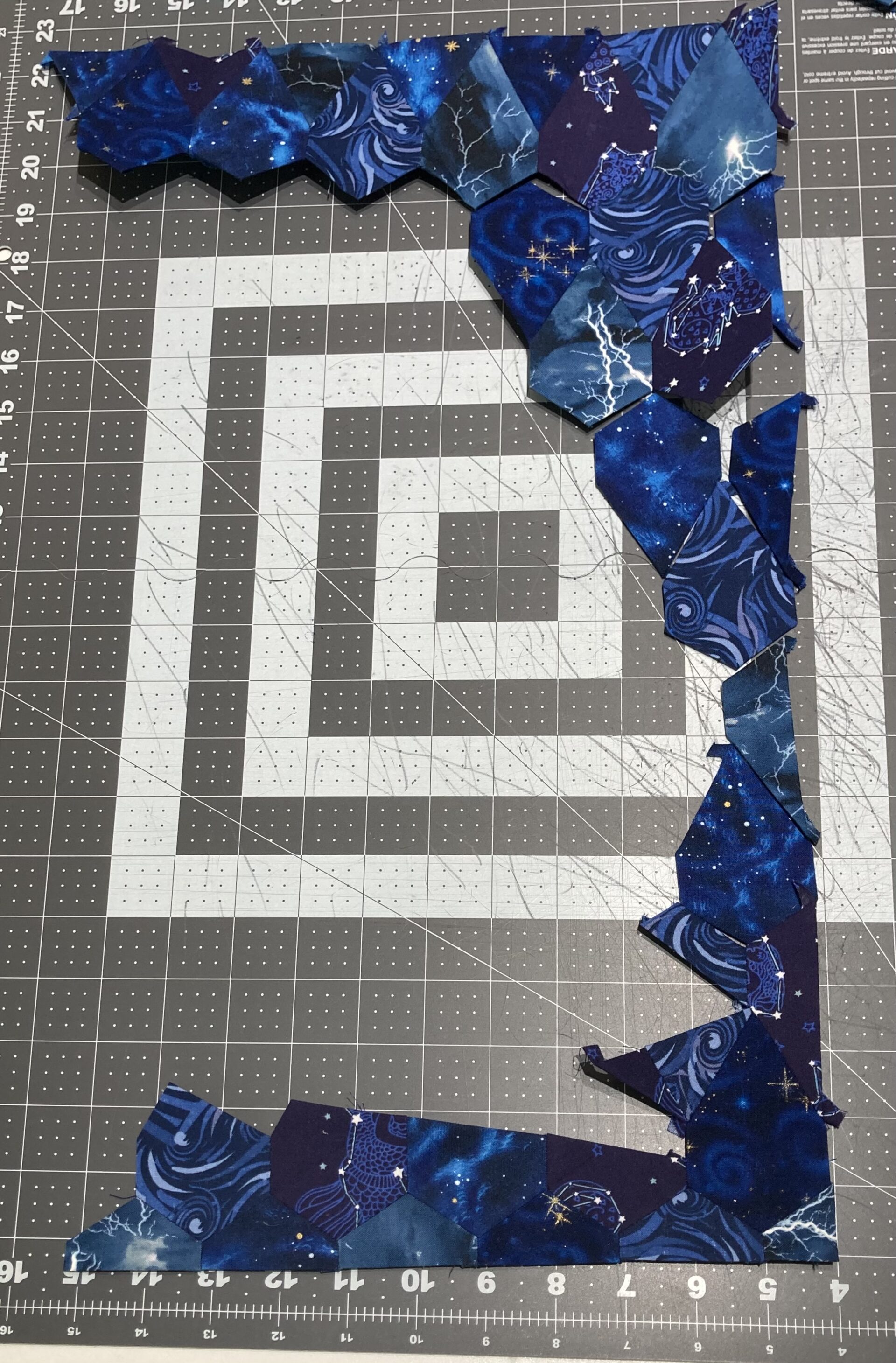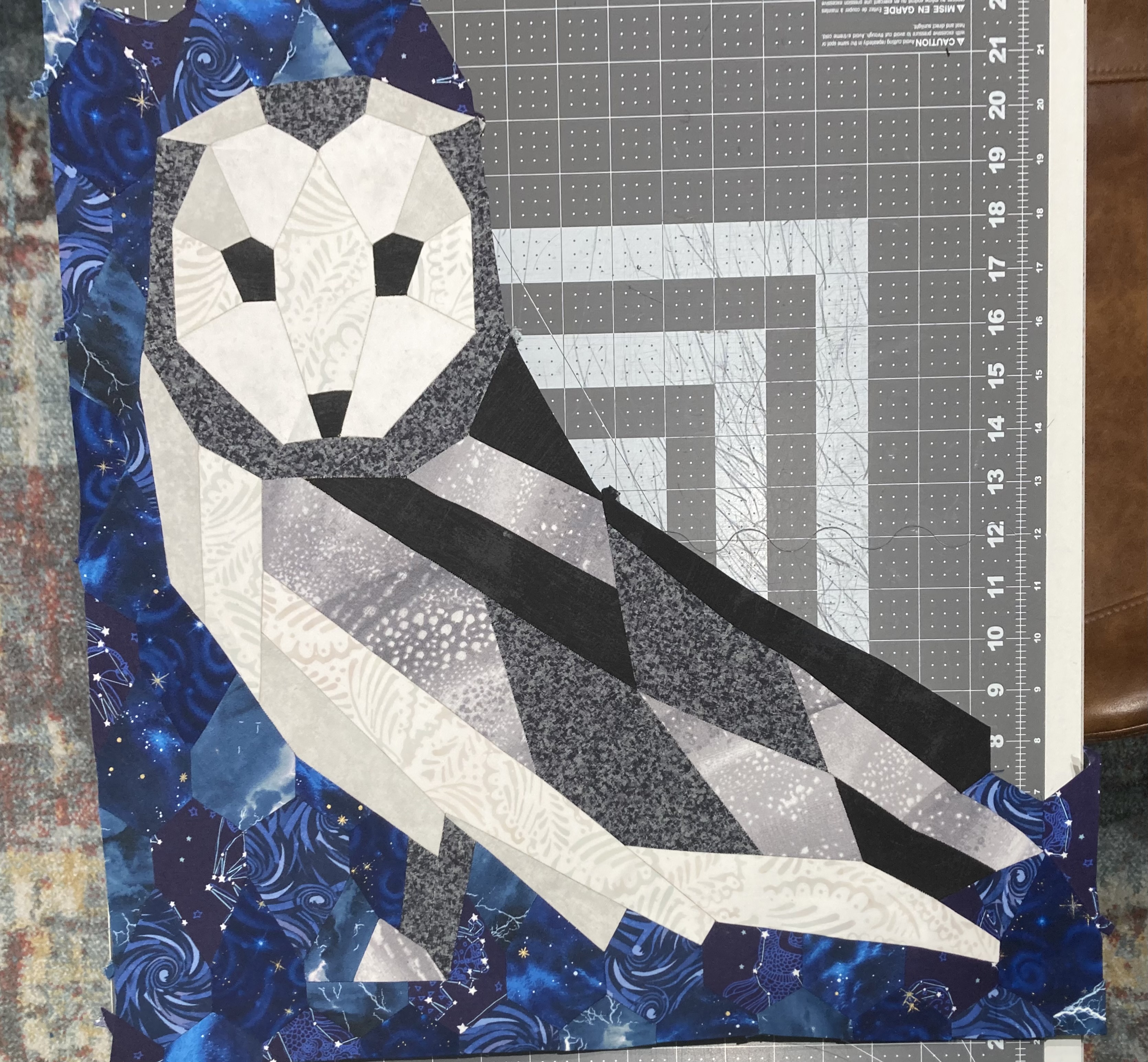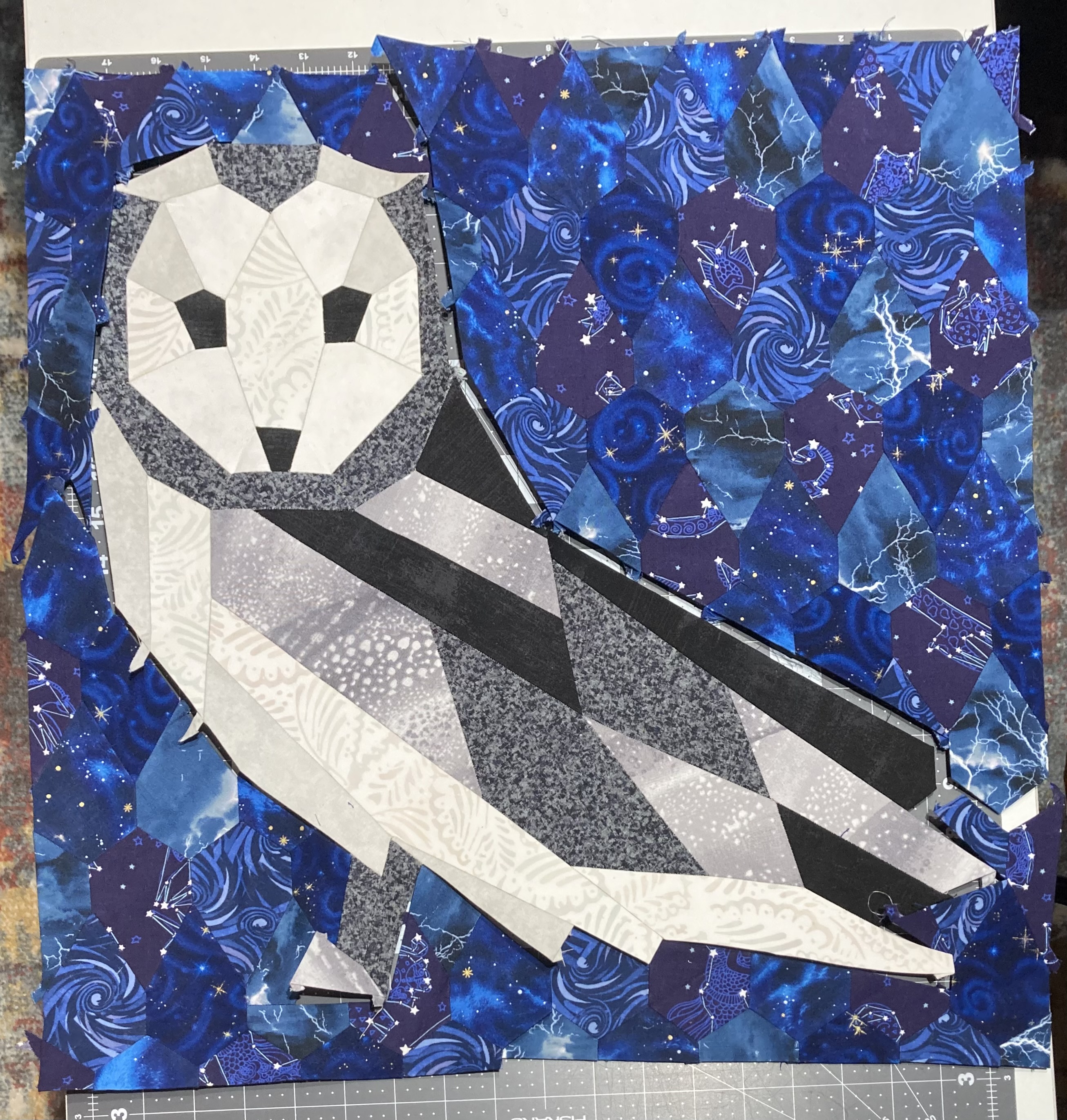 Filled in the last corner with only one potential fabric-to-fabric match. Fortunately the owl’s hindquarters are blocking my blunder. I really need to quit cutting it so close. Based on the last two black-and-blues, next time pulls n+1 fabrics where n is the number of sides of the primary shape.