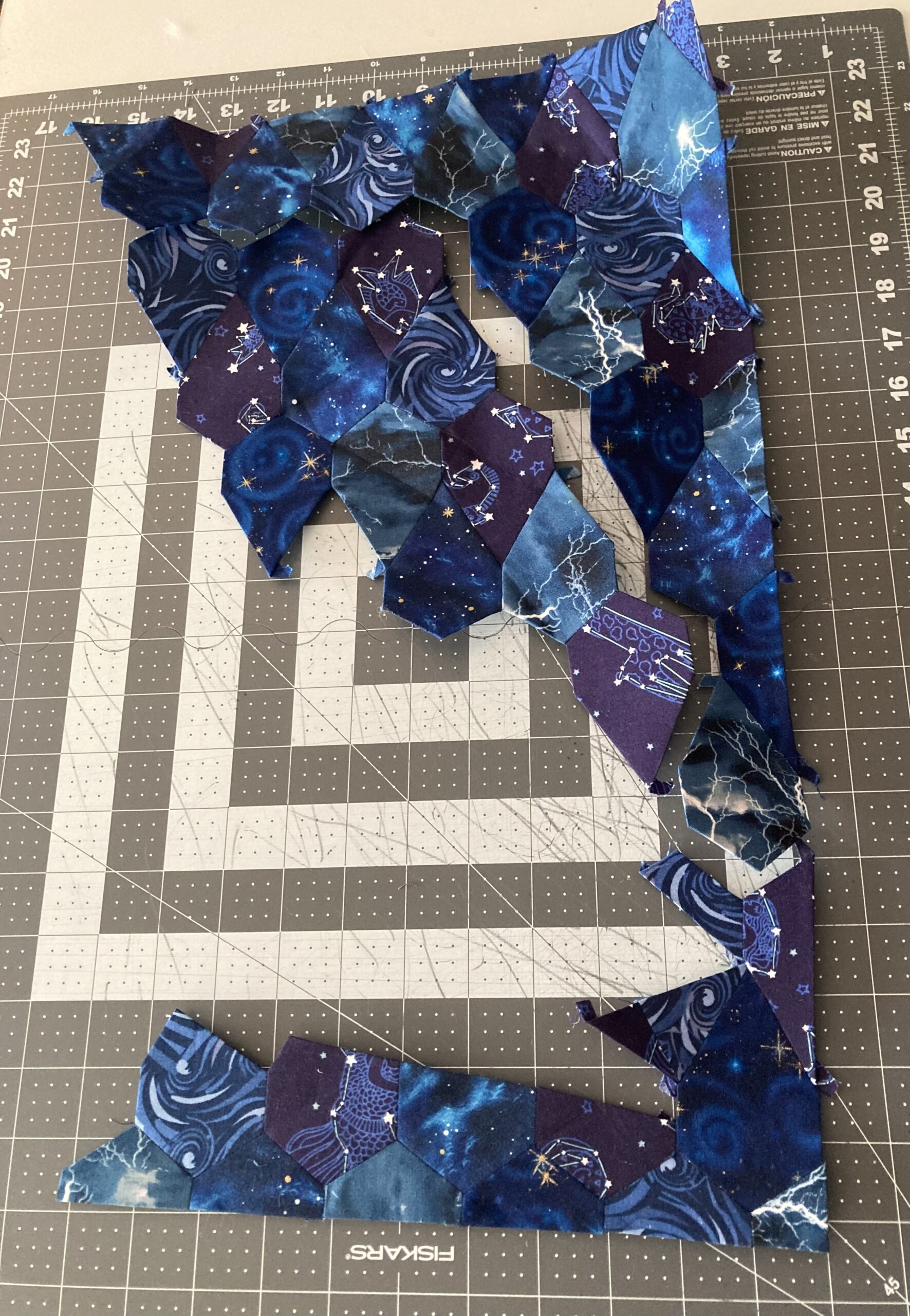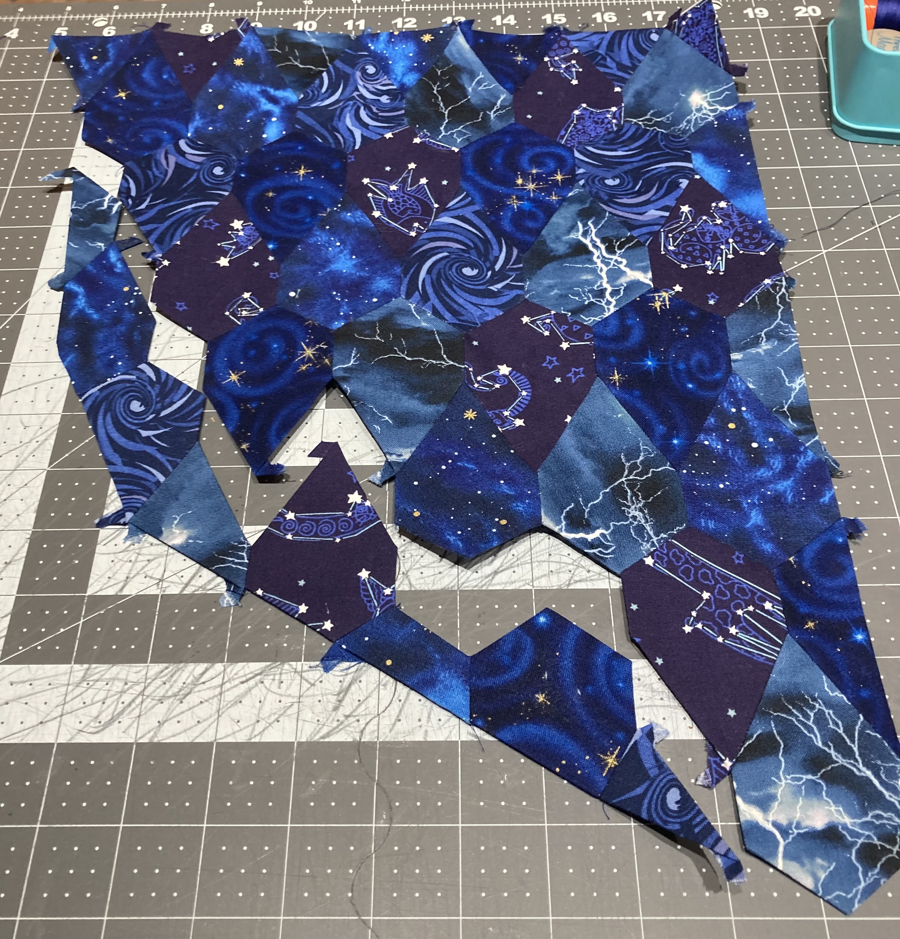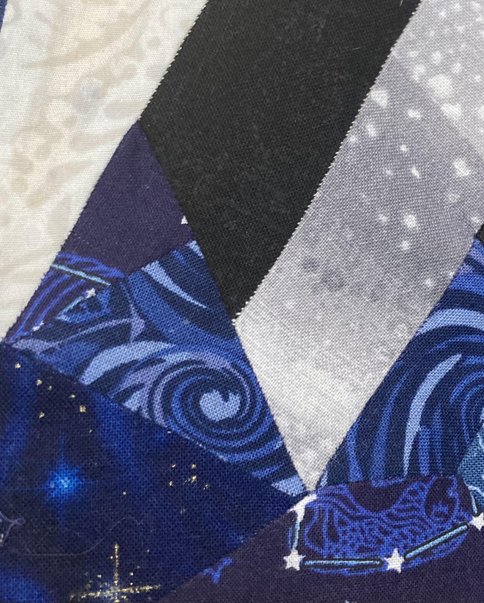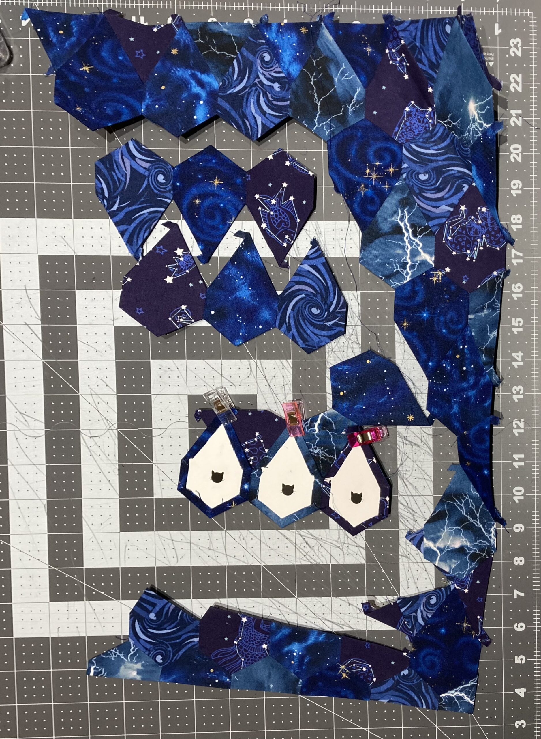 Filled in the last corner with only one potential fabric-to-fabric match. Fortunately the owl’s hindquarters are blocking my blunder. I really need to quit cutting it so close. Based on the last two black-and-blues, next time pulls n+1 fabrics where n is the number of sides of the primary shape.