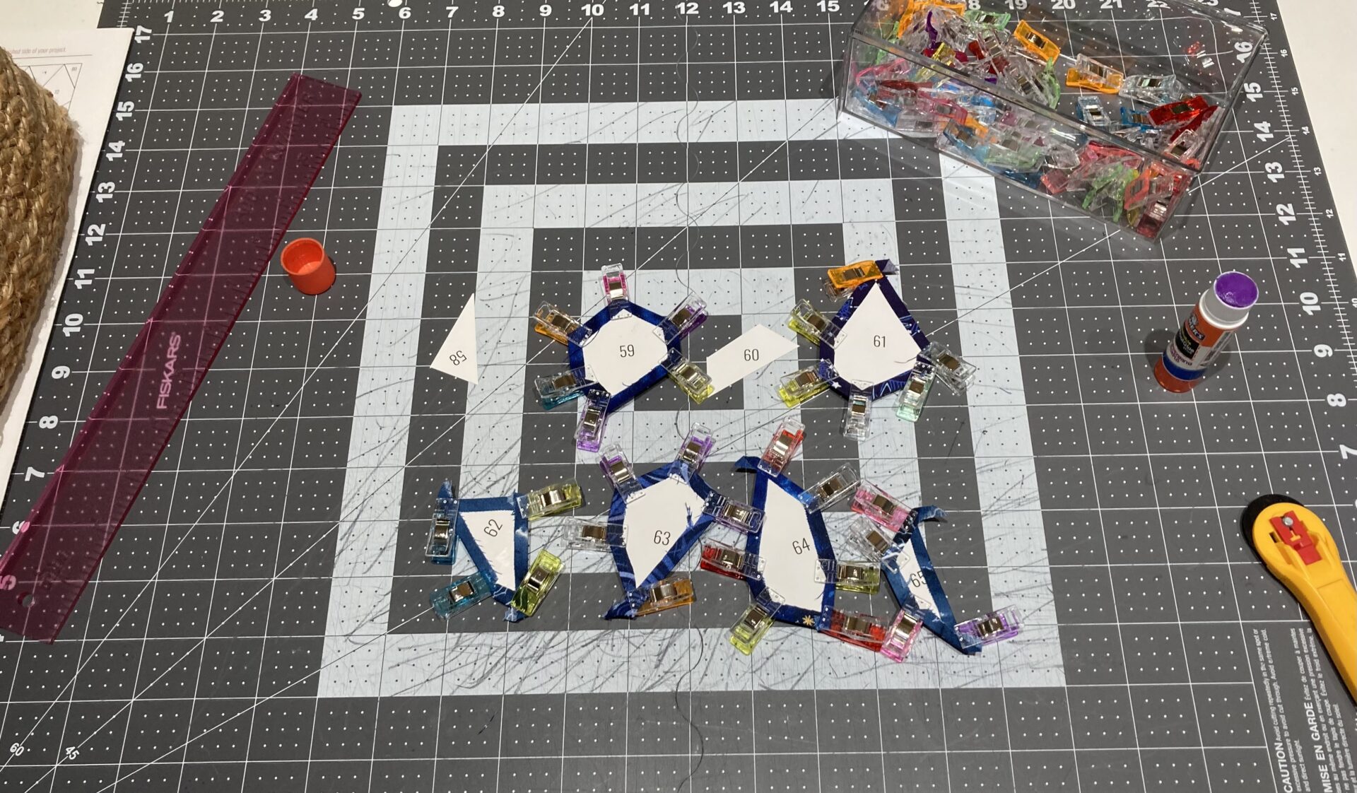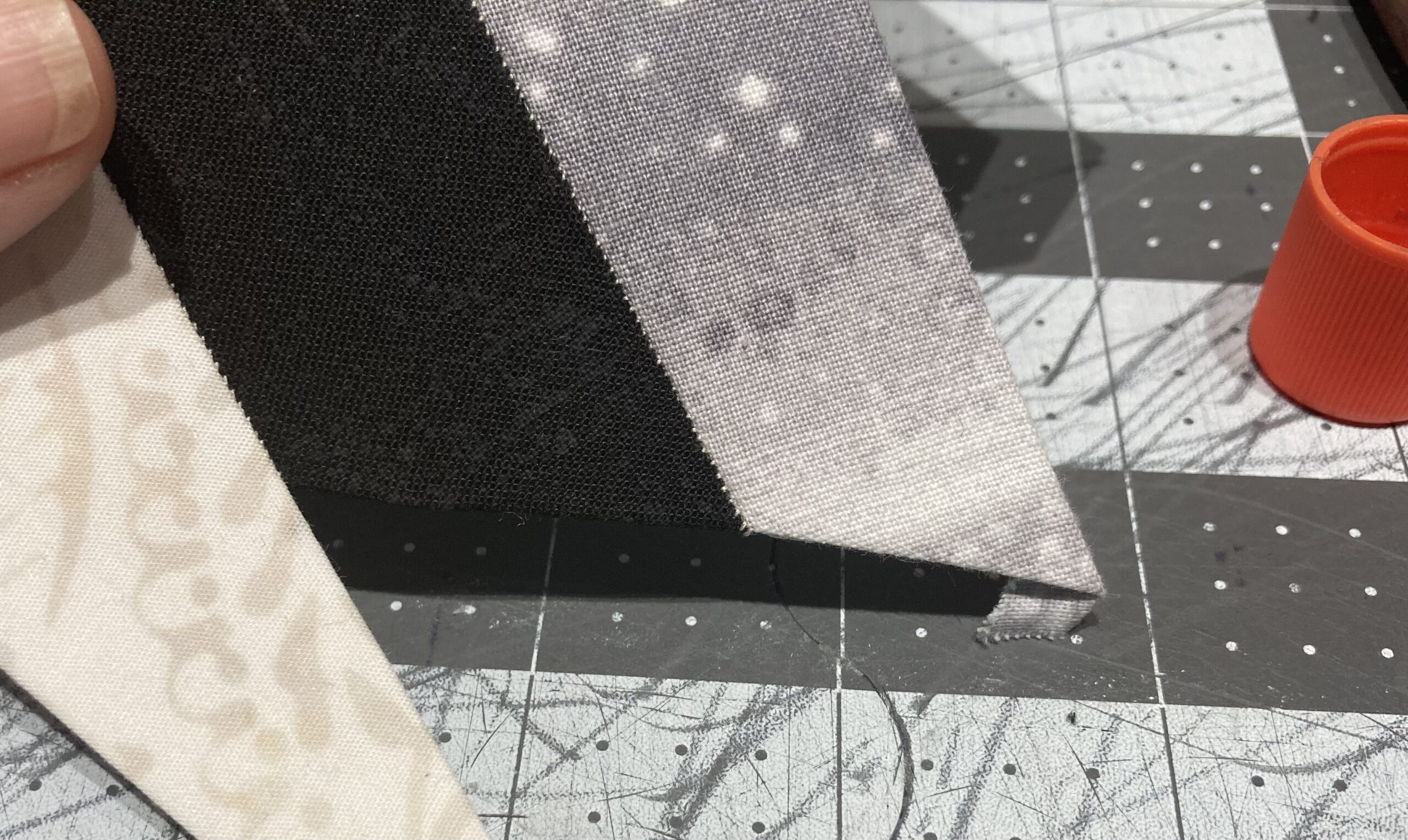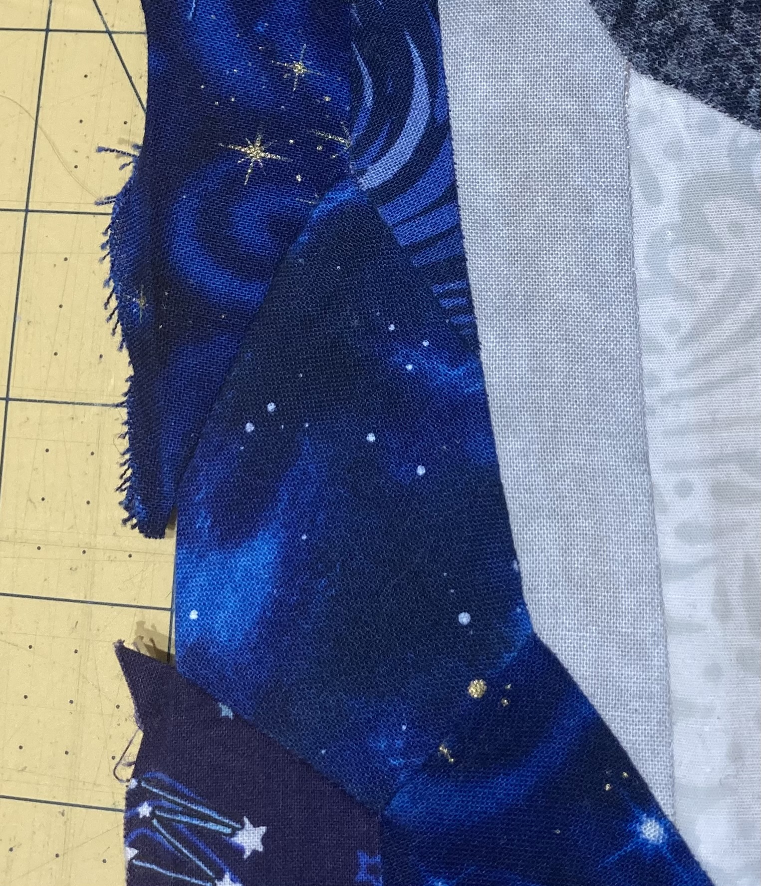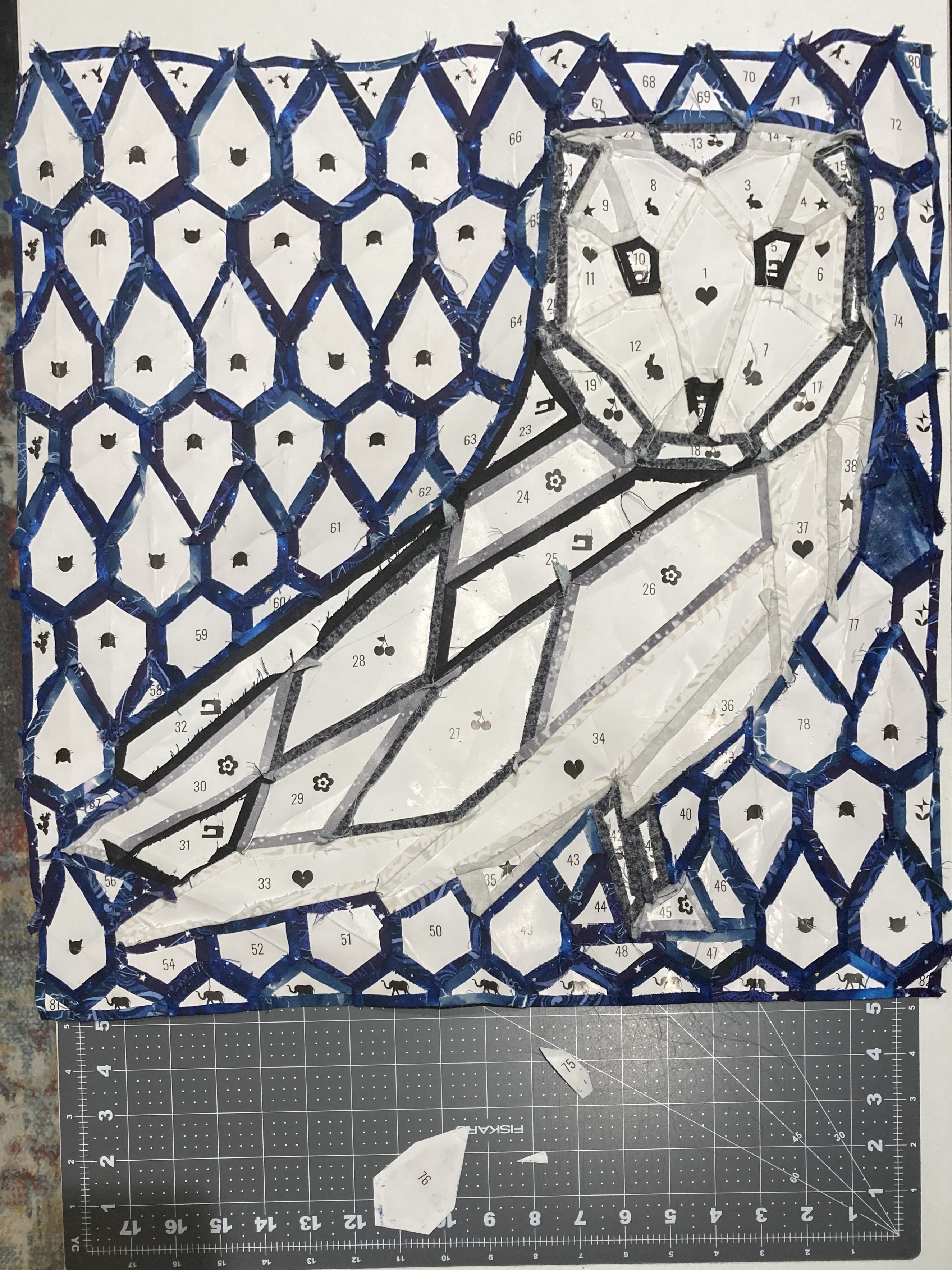 Filled in the last corner with only one potential fabric-to-fabric match. Fortunately the owl’s hindquarters are blocking my blunder. I really need to quit cutting it so close. Based on the last two black-and-blues, next time pulls n+1 fabrics where n is the number of sides of the primary shape.