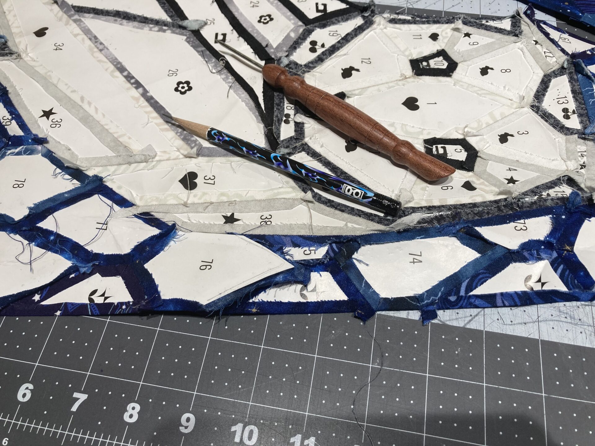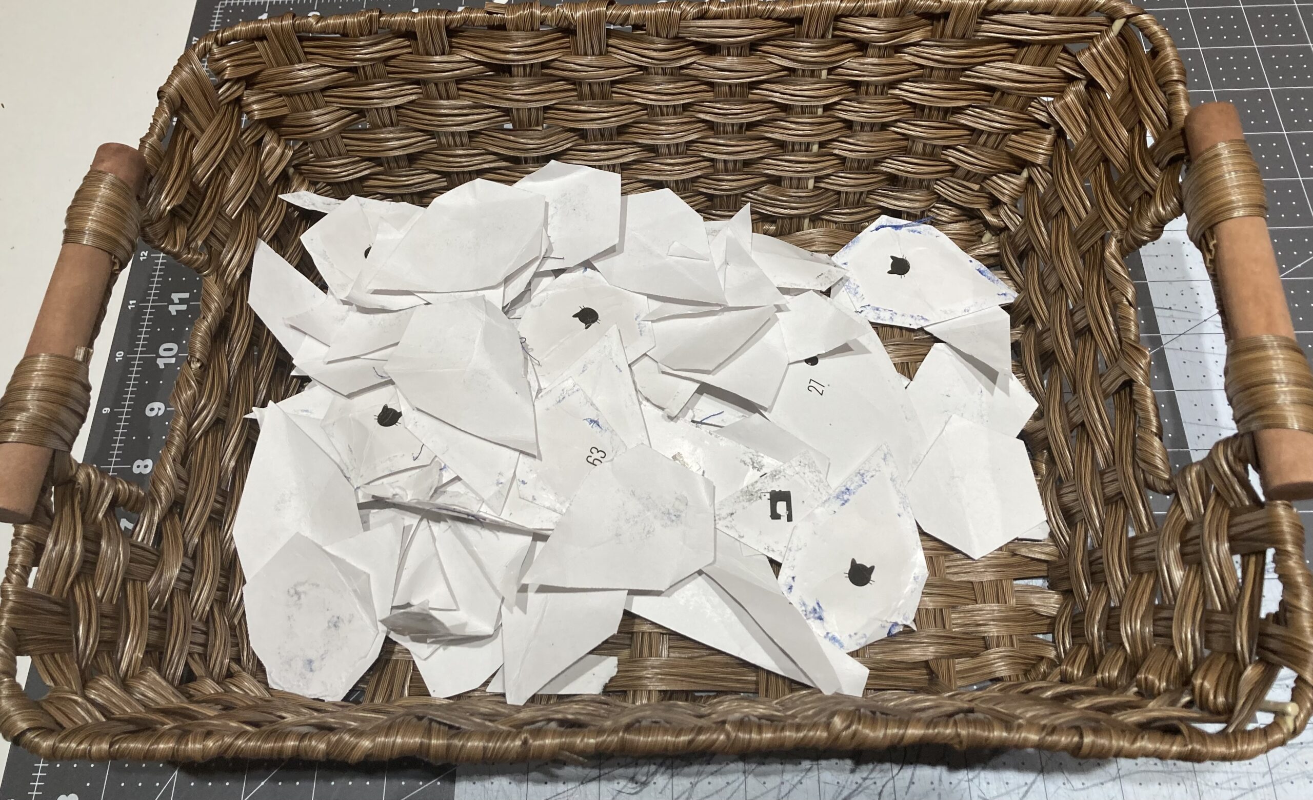 Nothing left but to stitch the final seam and pull the papers. Had to close in a couple of gaps, but nothing too severe. Shredded more seam allowance than I care to admit pulling the papers, but still preferable to thread basting.