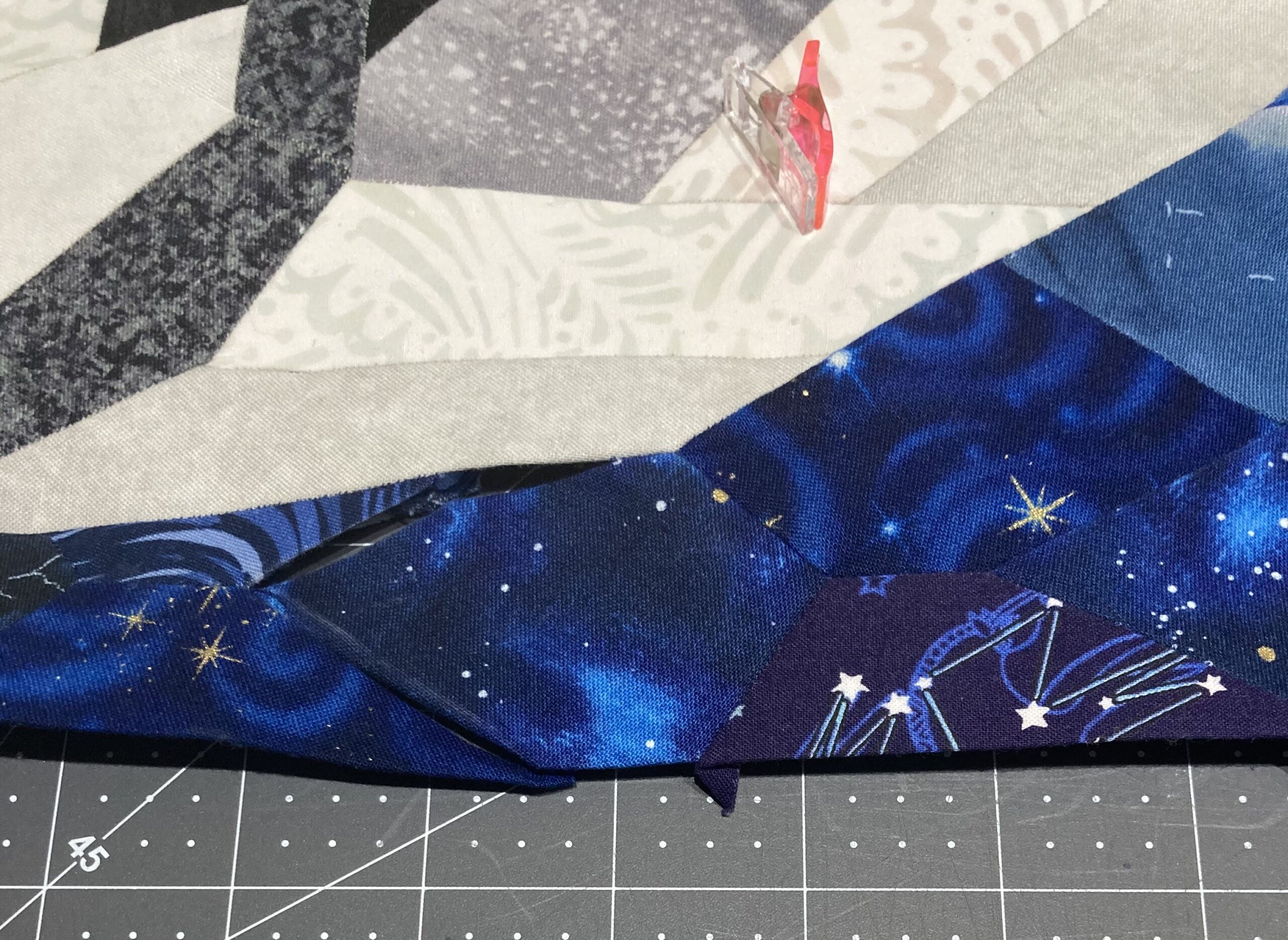 Separating the fore & backgrounds was probably not my smartest move ever. Most of the edges married up, but the left edge, like the rear wing section, had frigid feet. Opened up both, trimmed the pattern to fit, and re-basted the seam allowance. The point on the left edge ended up more blunted than I’d like, but the lower wing section came together pretty perfectly. Which brings it back to the final corner once more.
