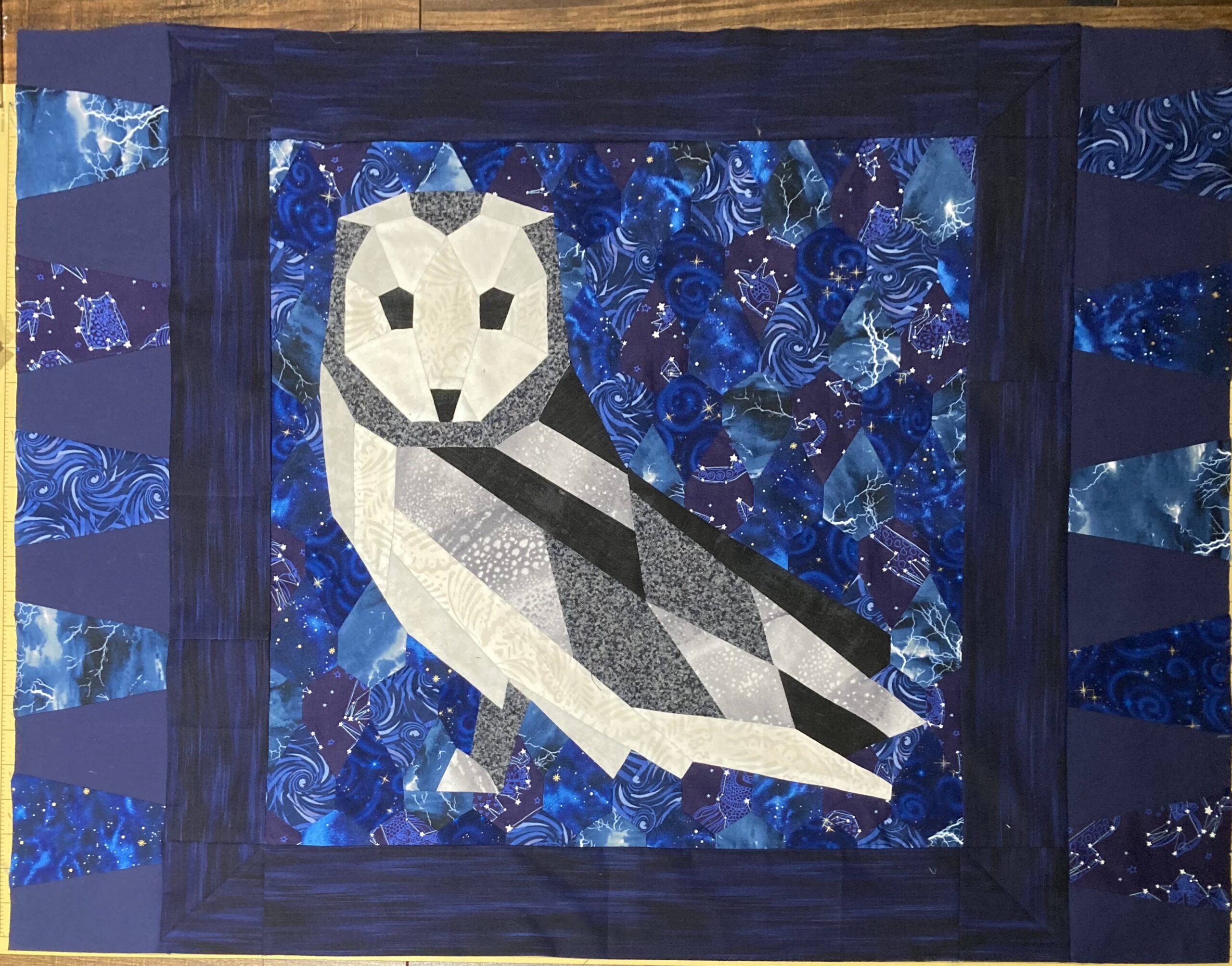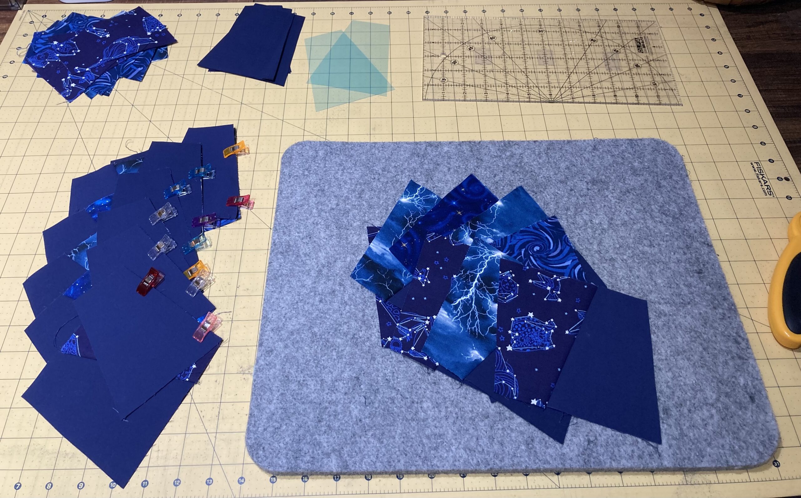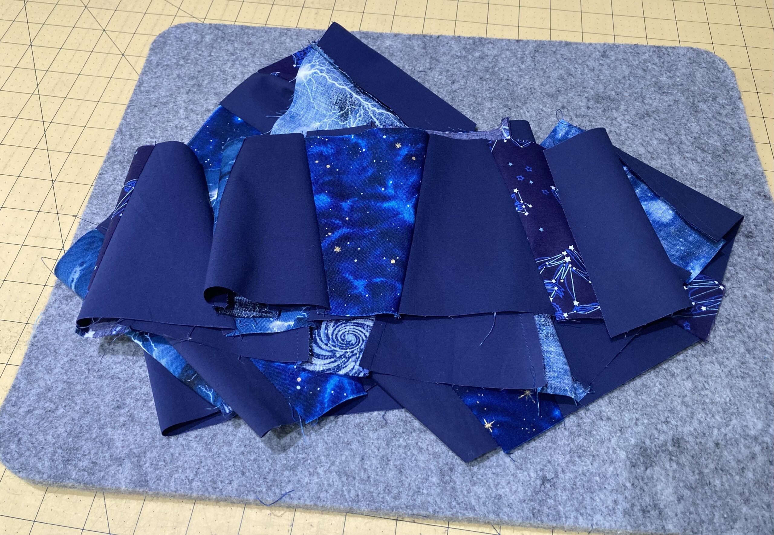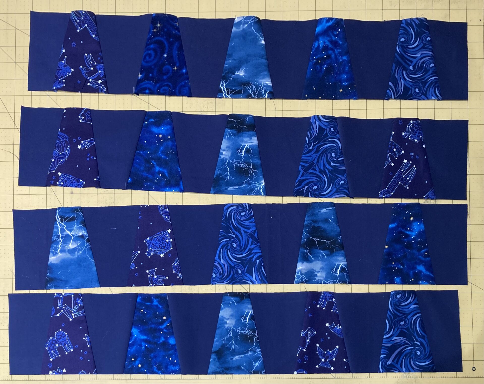 Overcut the trapezoids to account for alignment issues and squaring, and then didn’t feel like cutting them down – 4.25″ rather than 4″. Down to the dregs on half the sky fabrics, less variation than I’d like, but it is what it is. At least it’s flat.