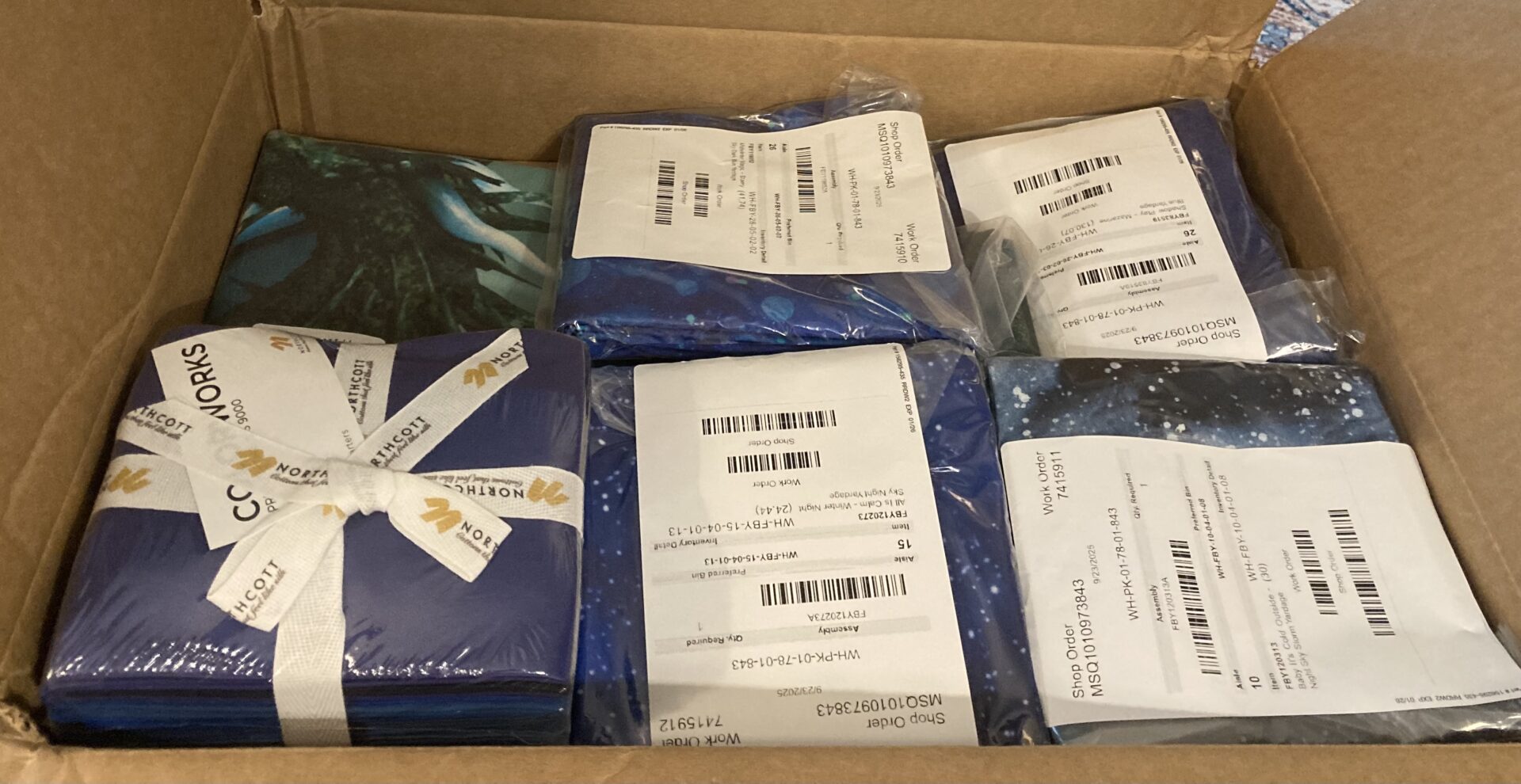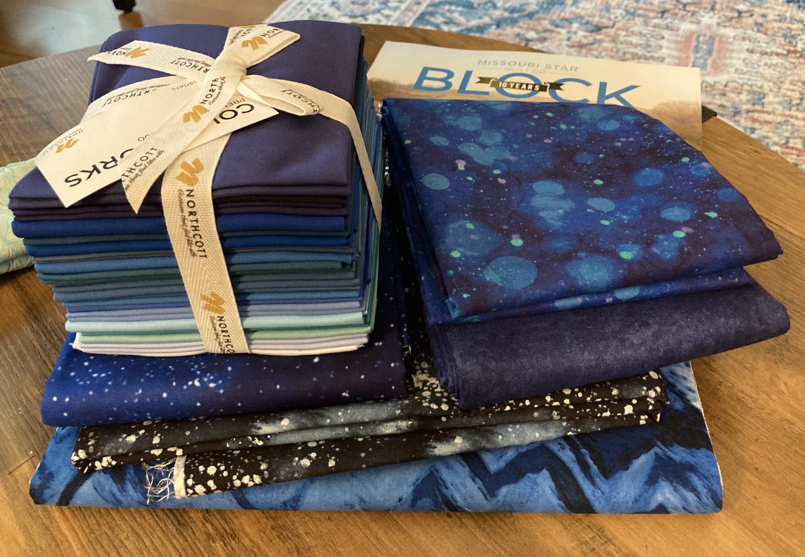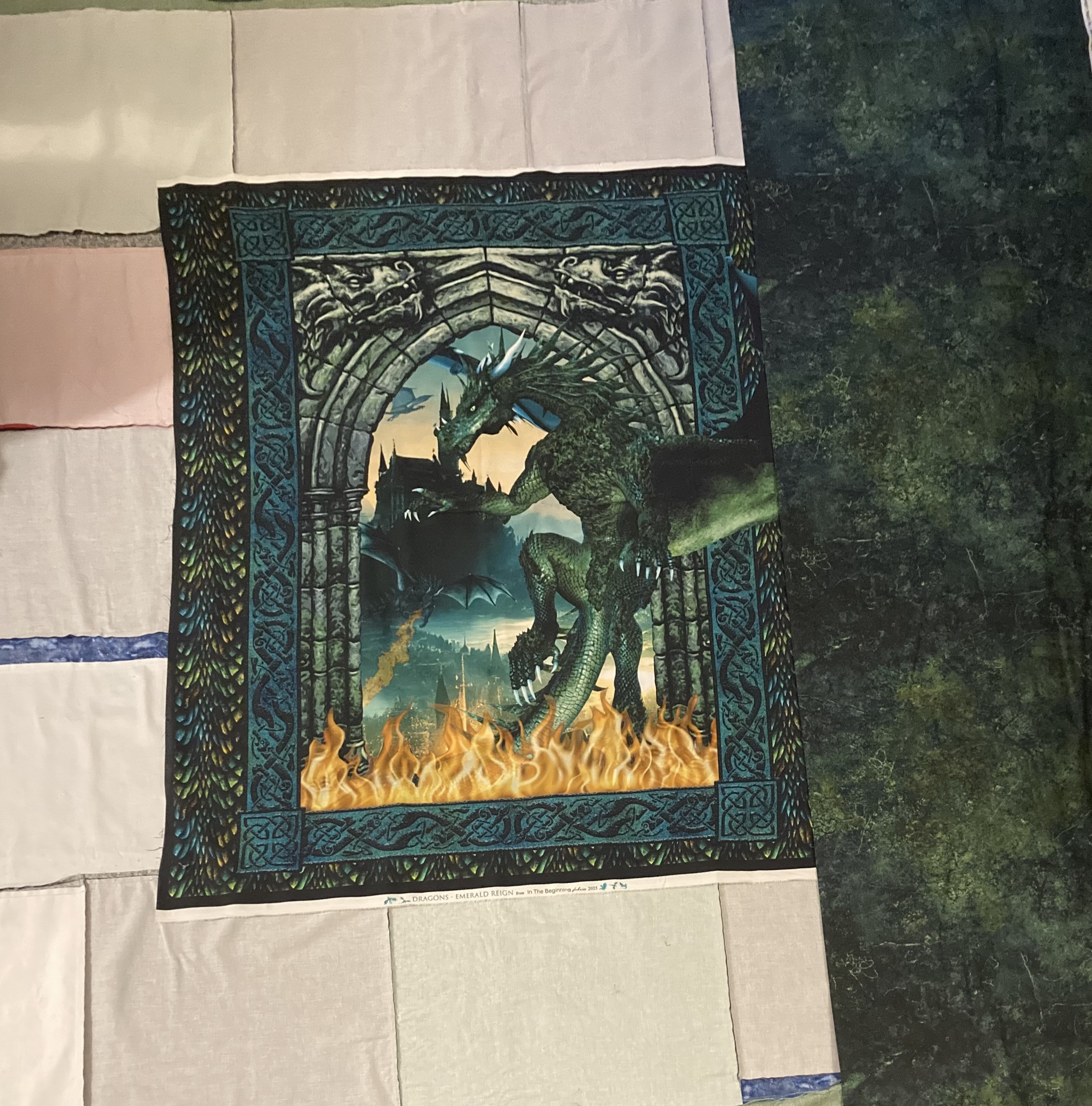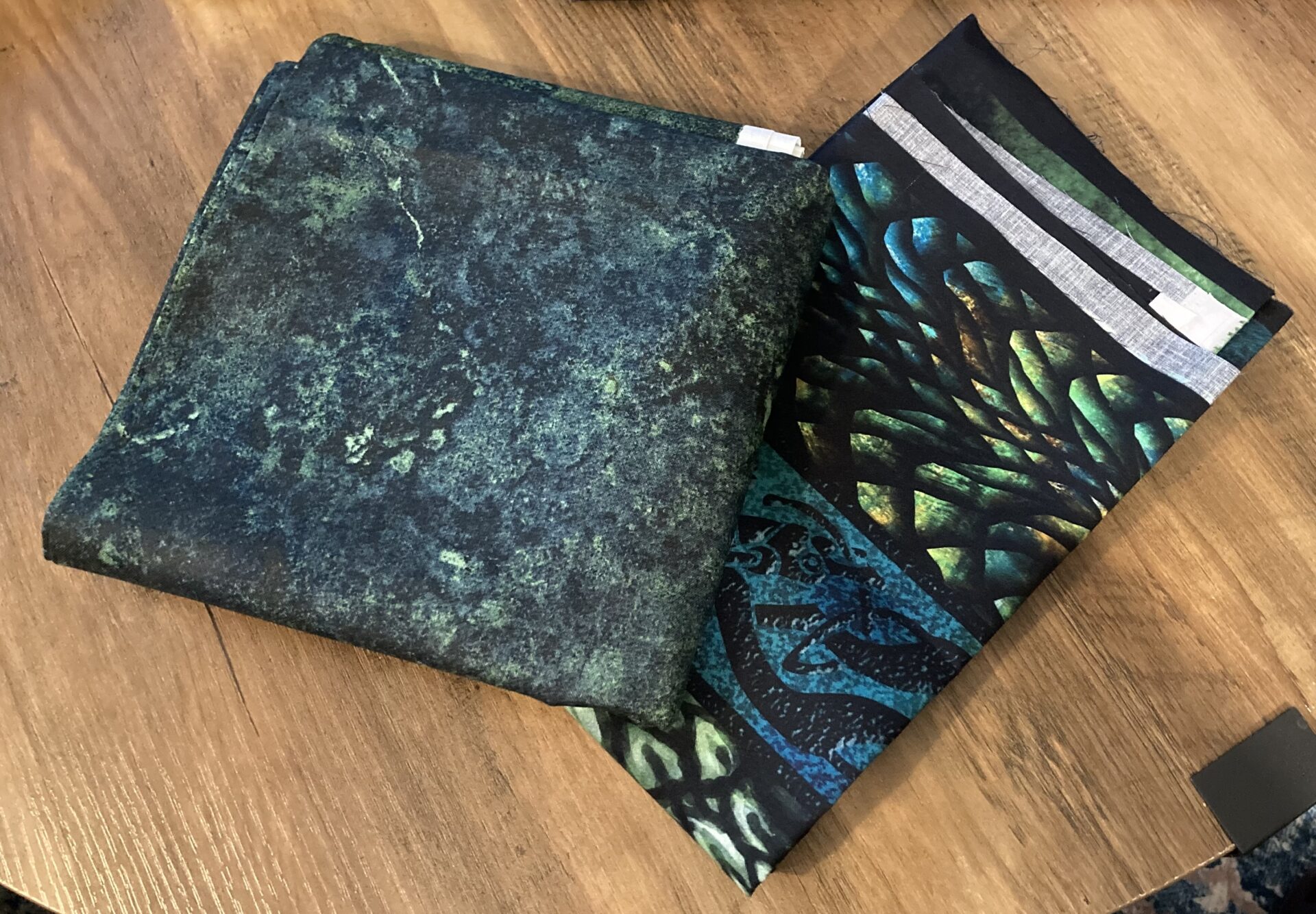 Also green. The panel for the back of Cj’s t-shirt quilt is pretty perfect. Wanted the coordinating scales fabric to flesh out the rest, but I was late to the party. Was going to fill it in with stone wall fabric, but the marble is pretty spiffy, so ordered two more yards of that instead. And some 108″ denim stripes for the back of Basketcase – get more shit OFF the table.