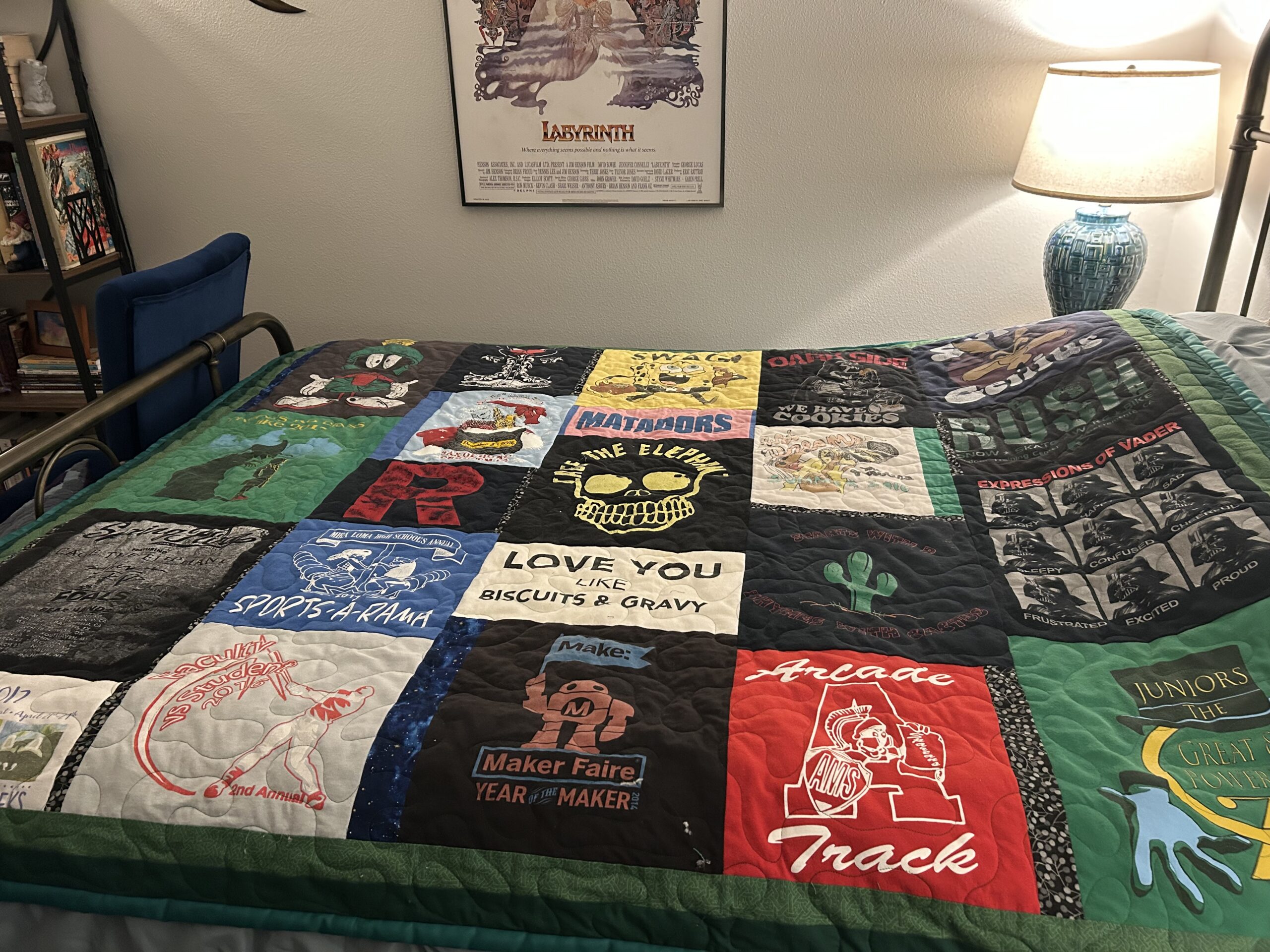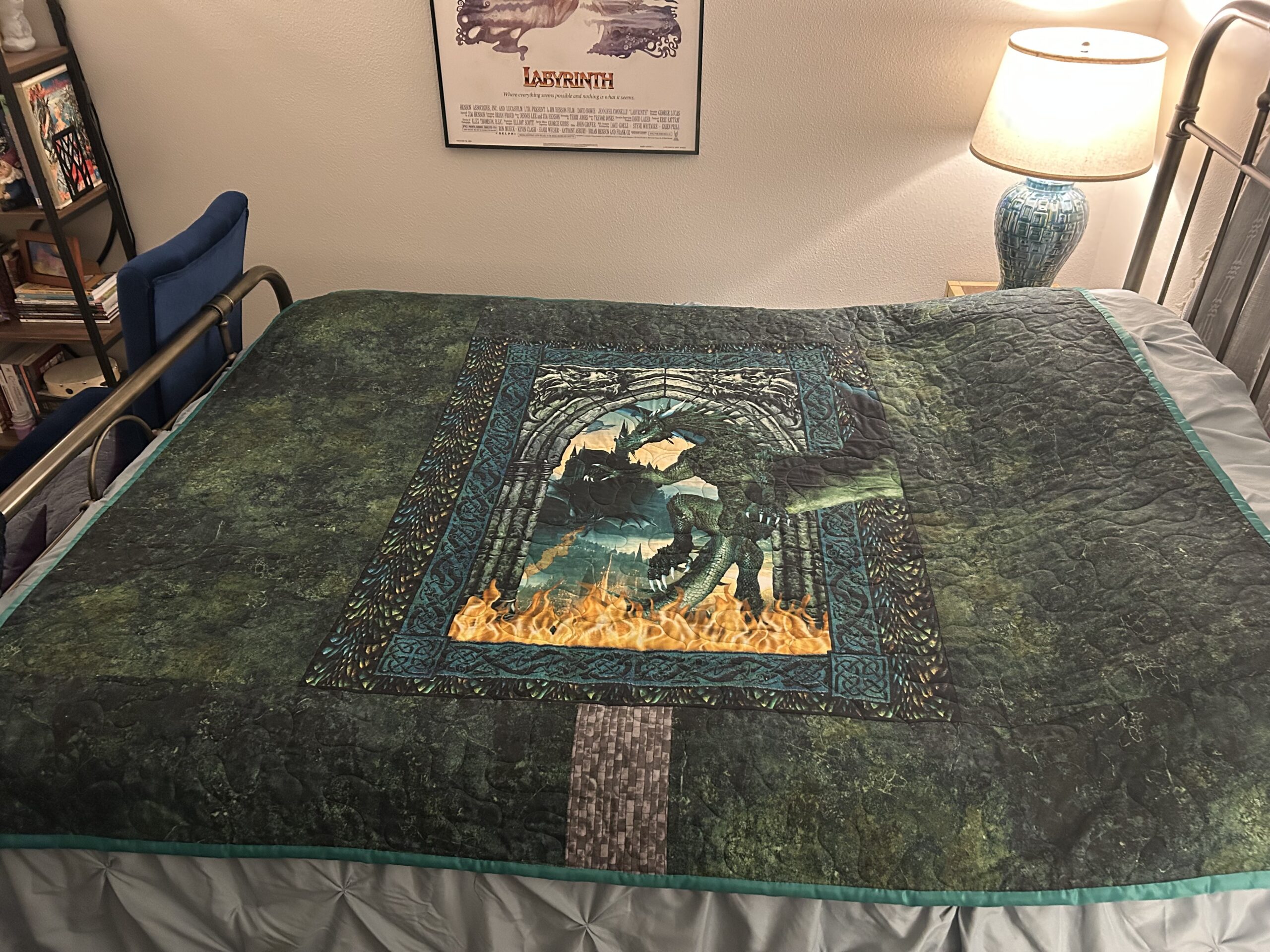 Done at last. With one exception, the corners are weak tea. And the one that’s not radius was a terrible point to start on. Wasn’t smart but wasn’t dumb enough to pull it apart, so it got left til last. I should go cut a corner template for binding Basketcase.